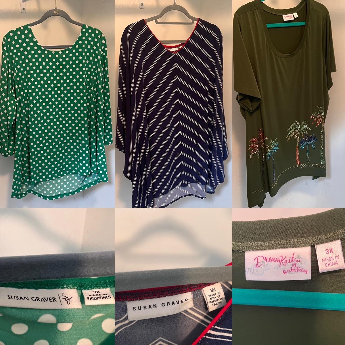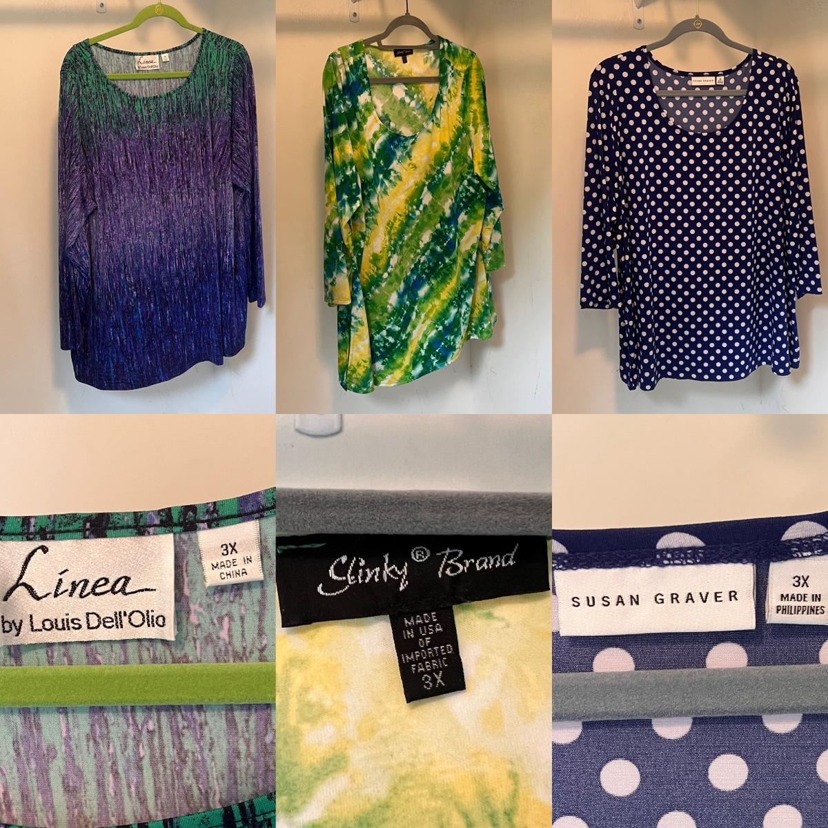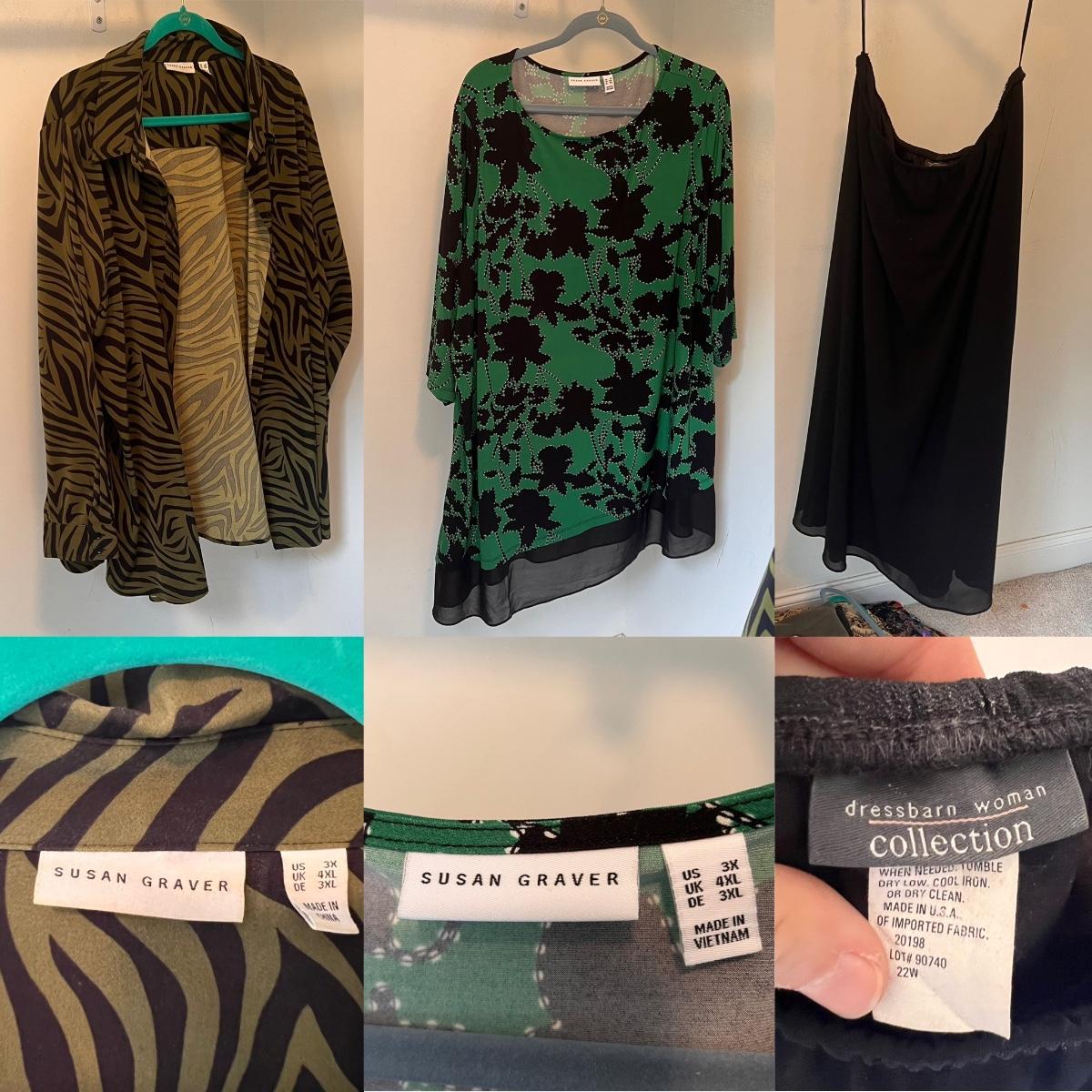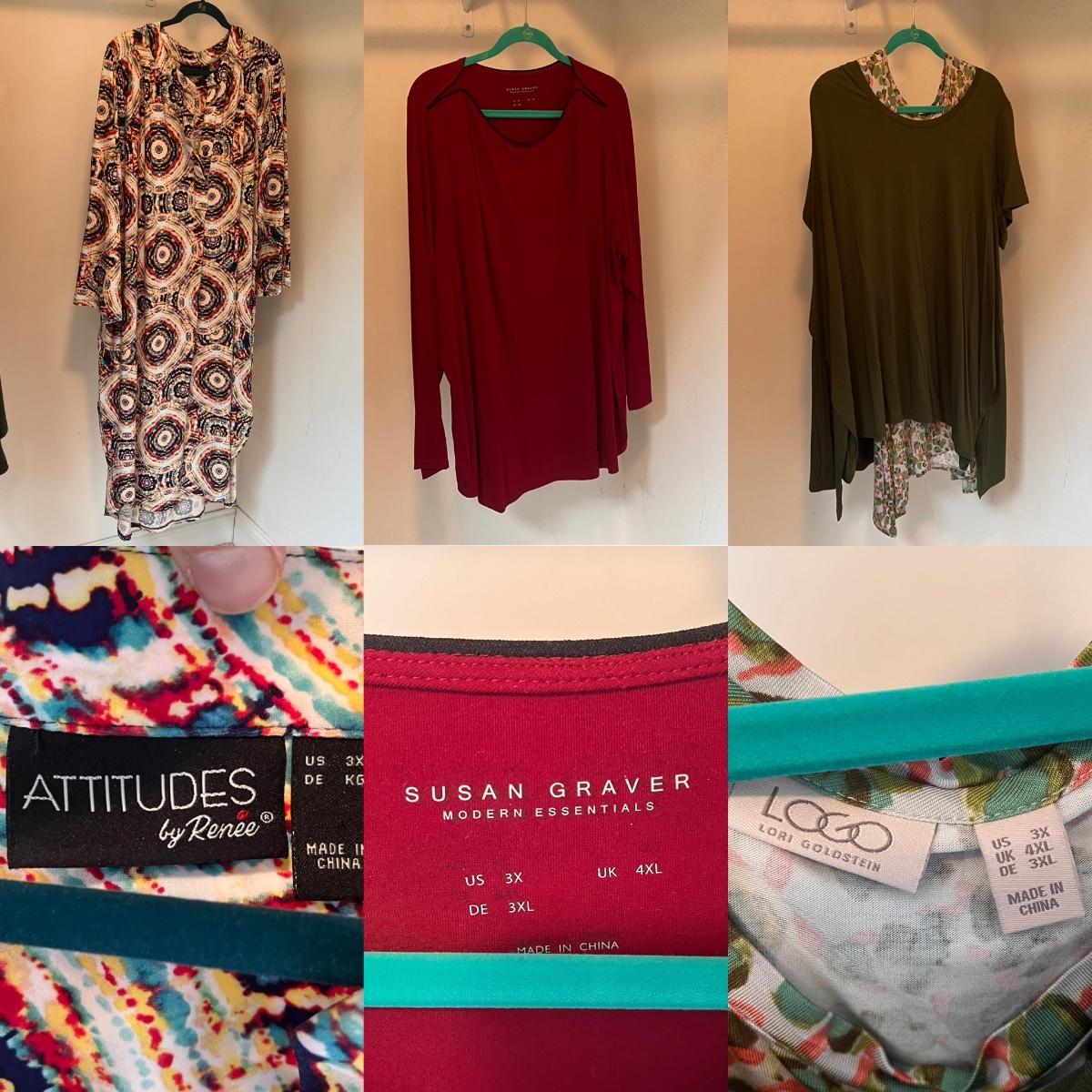 This lot includes around forty pieces of women’s skirts and blouses. All items range from size 2XL to 3XL. You’ll find the following brands: The Travel Collection, MSK Women, Susan Graver, Lady Dorby, and Slinky Brand. Shipping available.