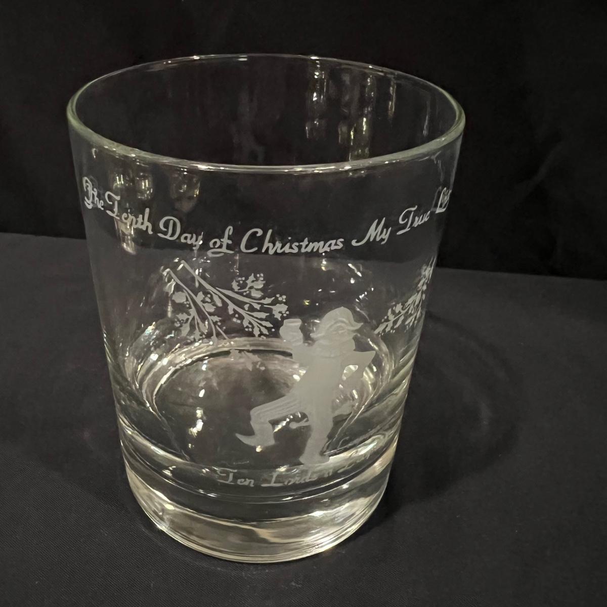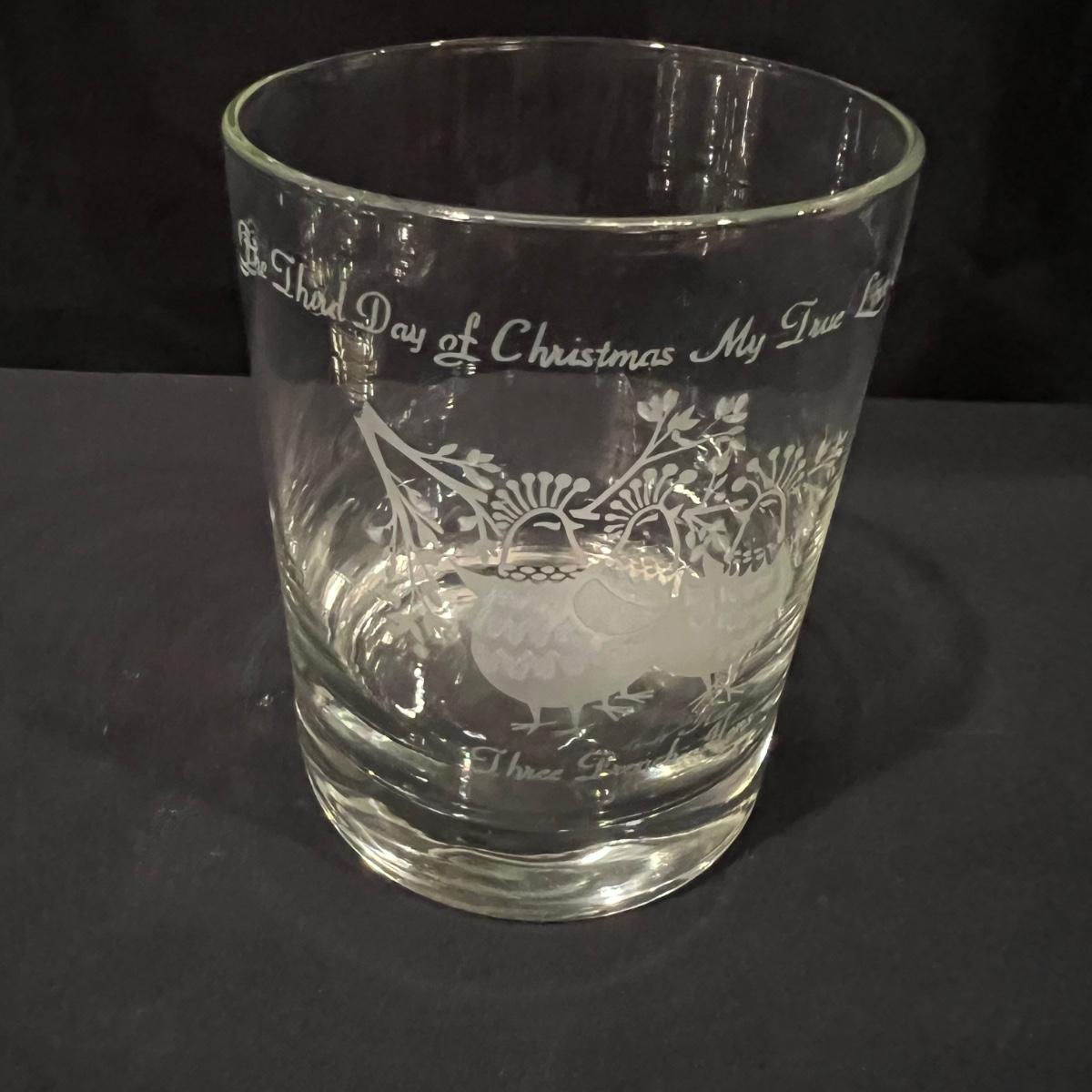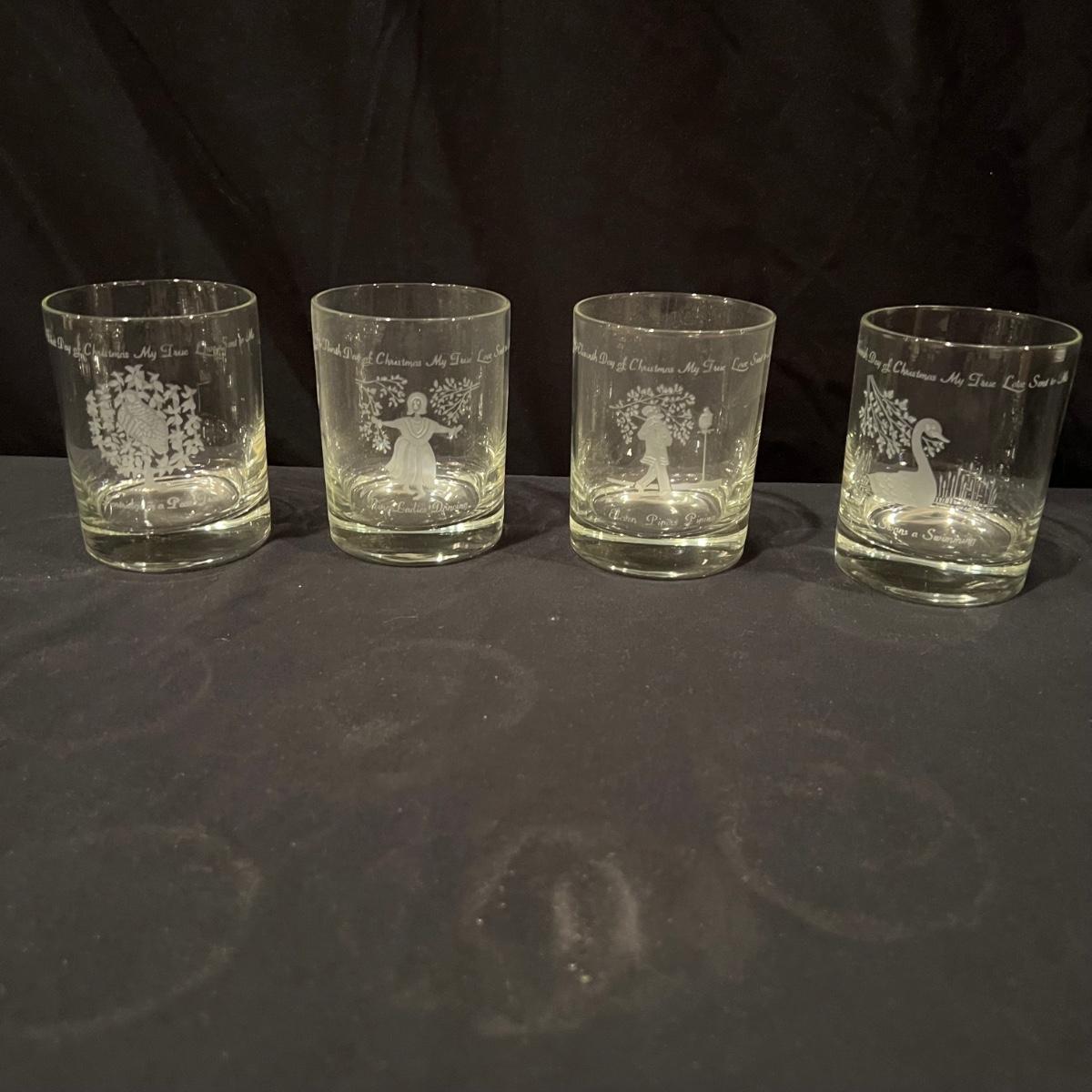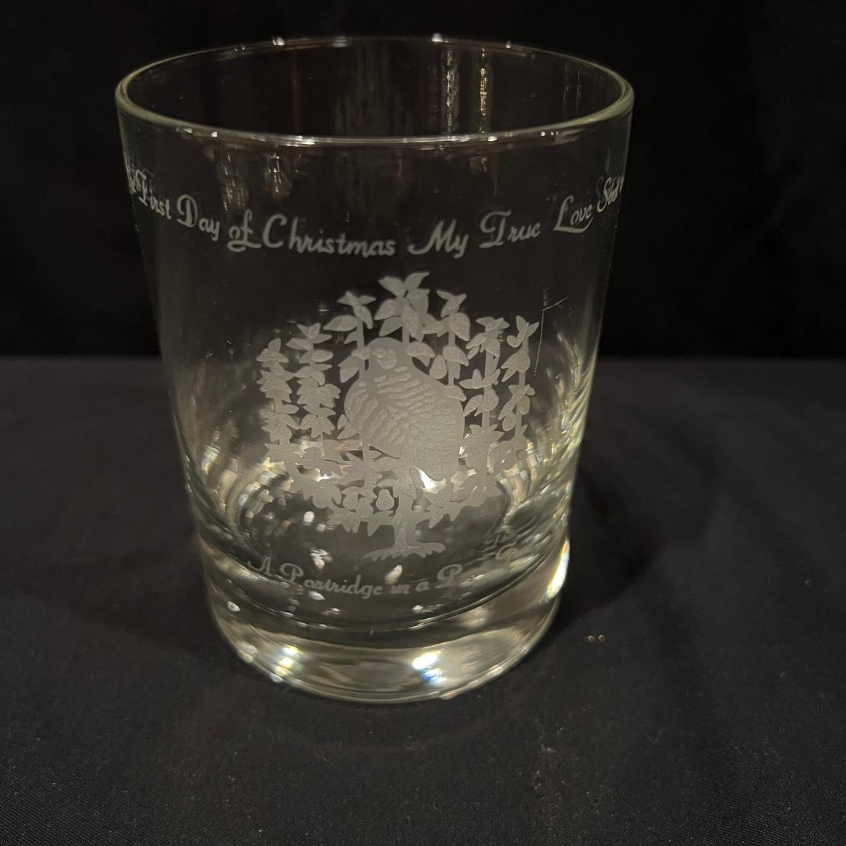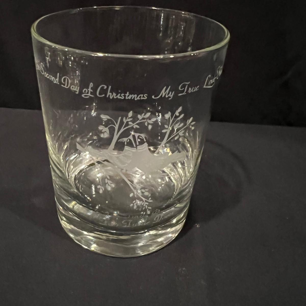 Twelve acid etched design glasses styled around the 12 days of Christmas song. Each glass is uniquely etched with the representing day in the song. They all measure 2.25”D x 4.25”H.