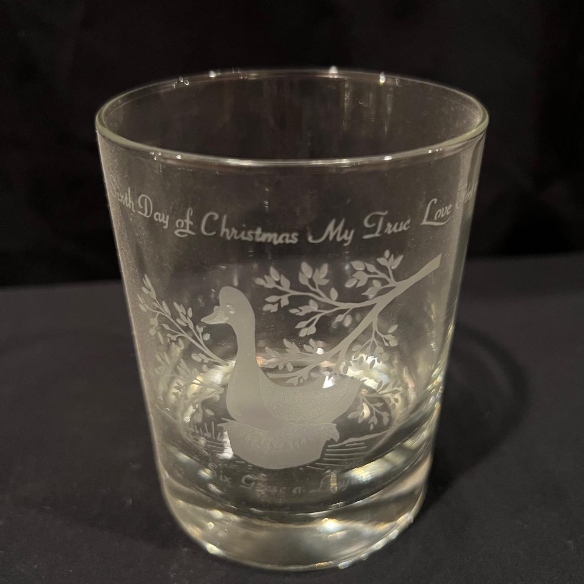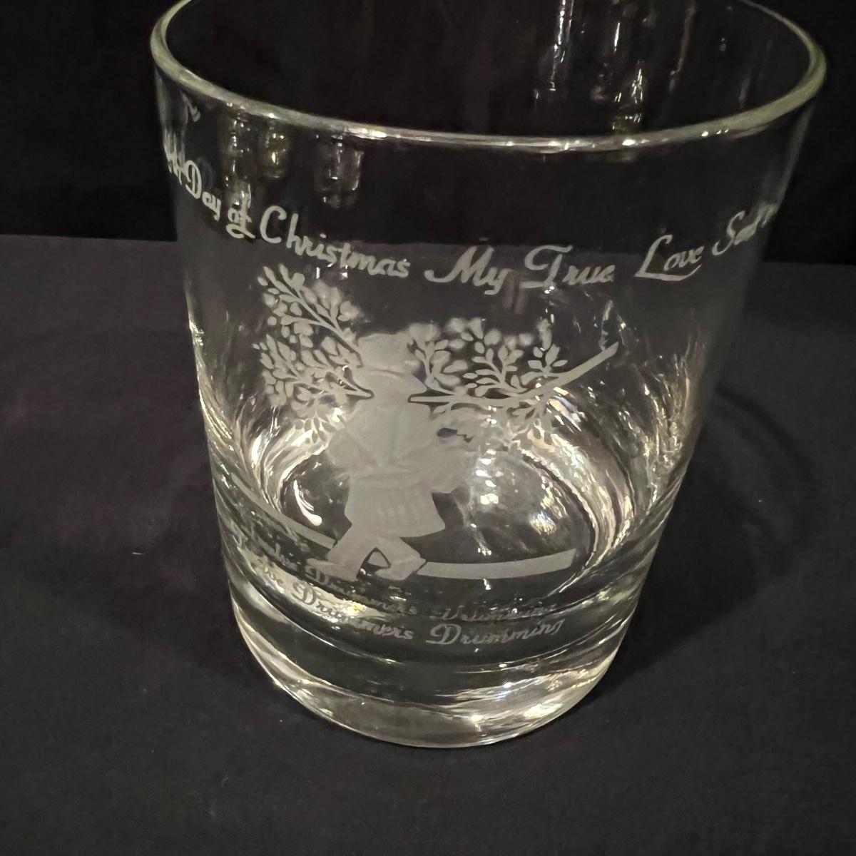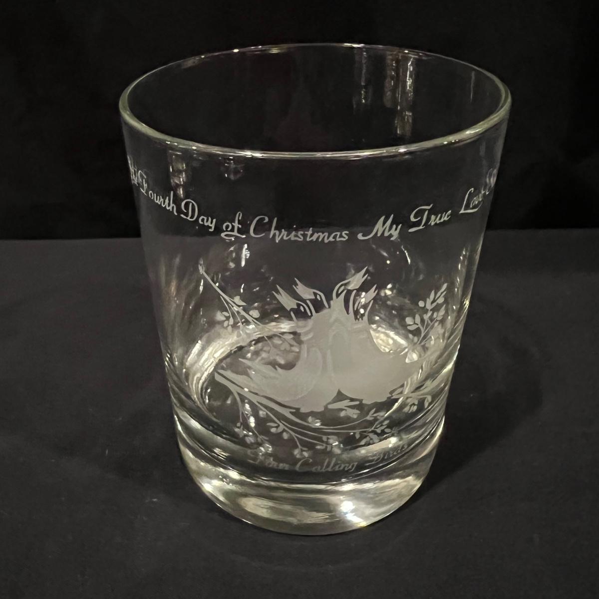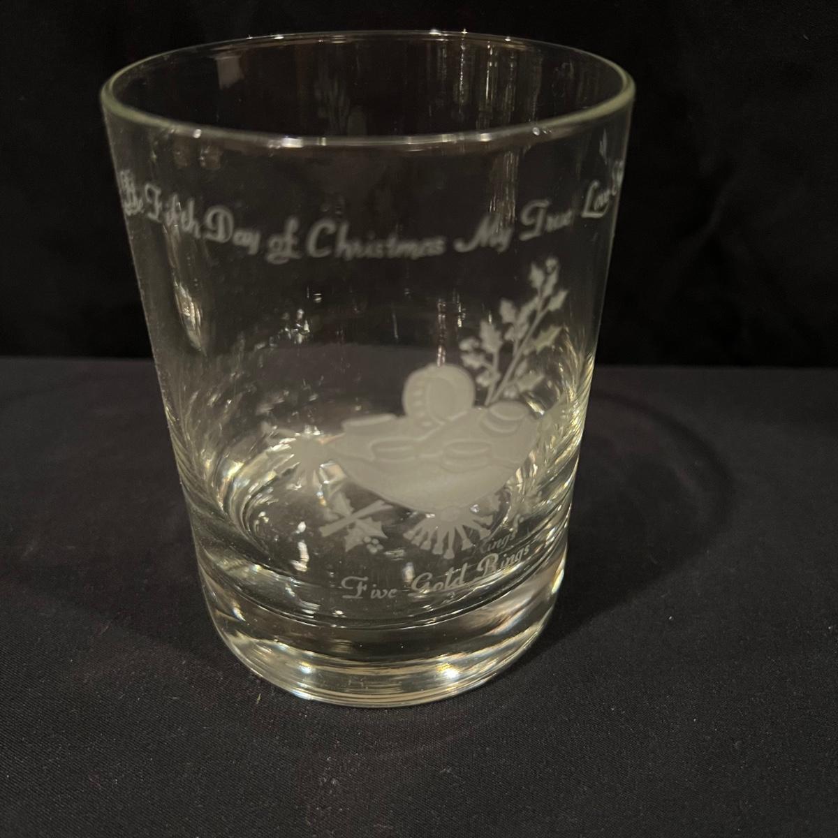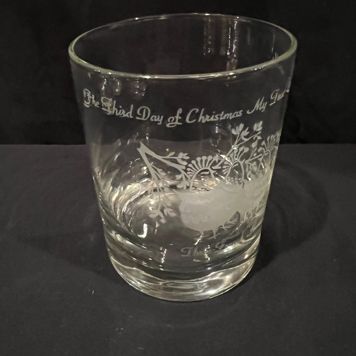 Twelve acid etched design glasses styled around the 12 days of Christmas song. Each glass is uniquely etched with the representing day in the song. They all measure 2.25”D x 4.25”H.