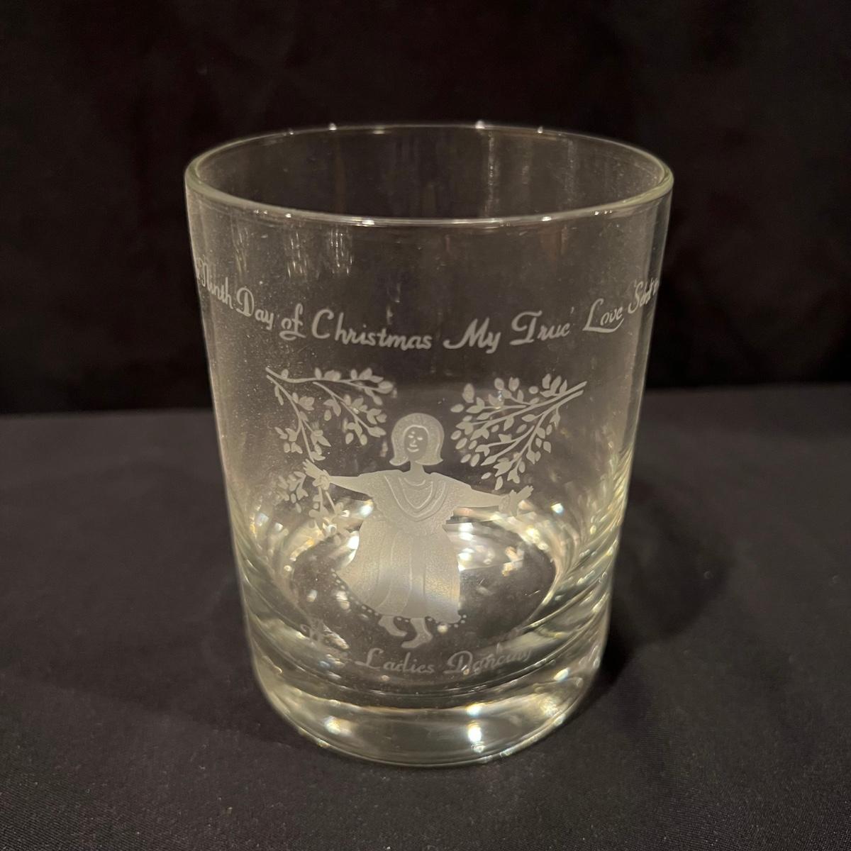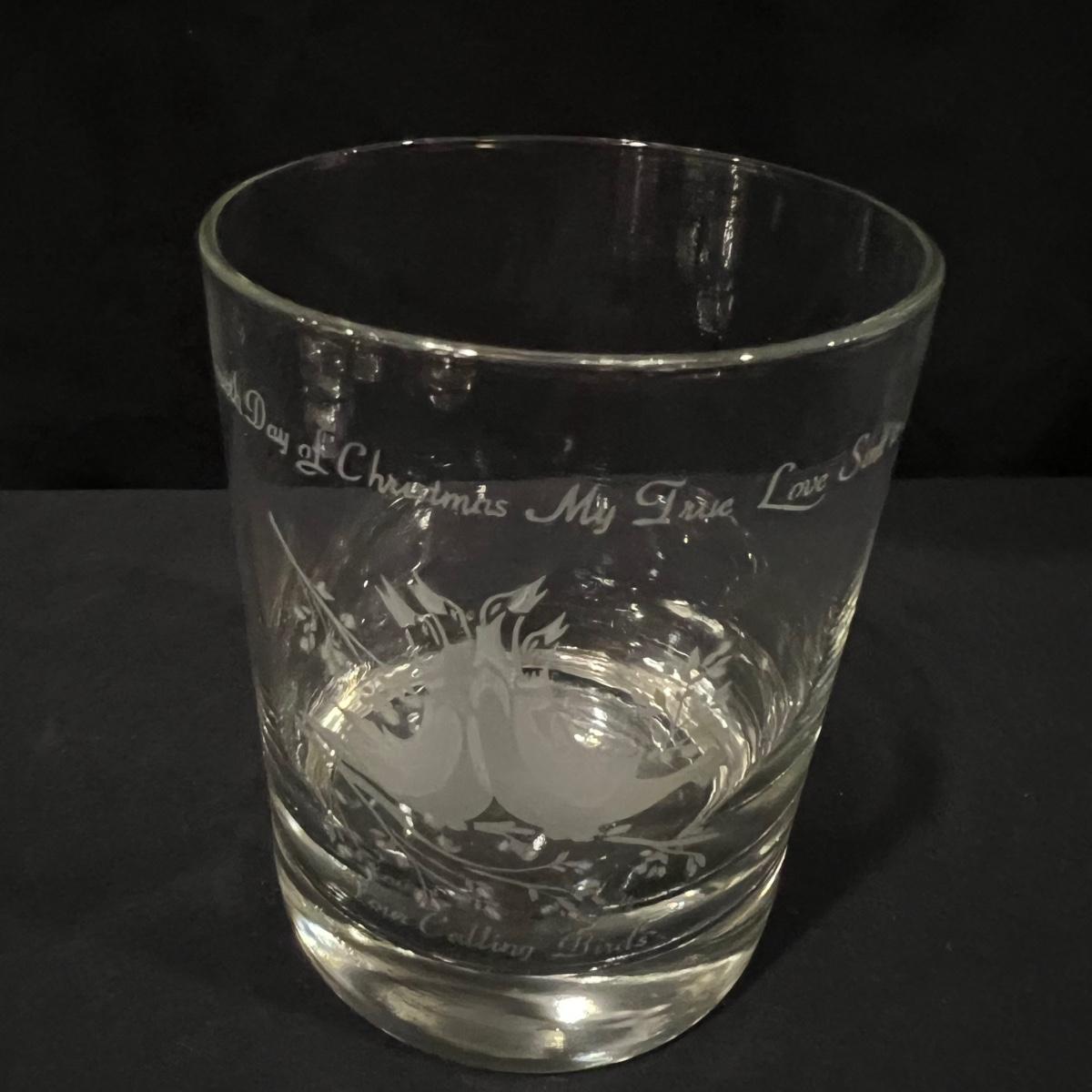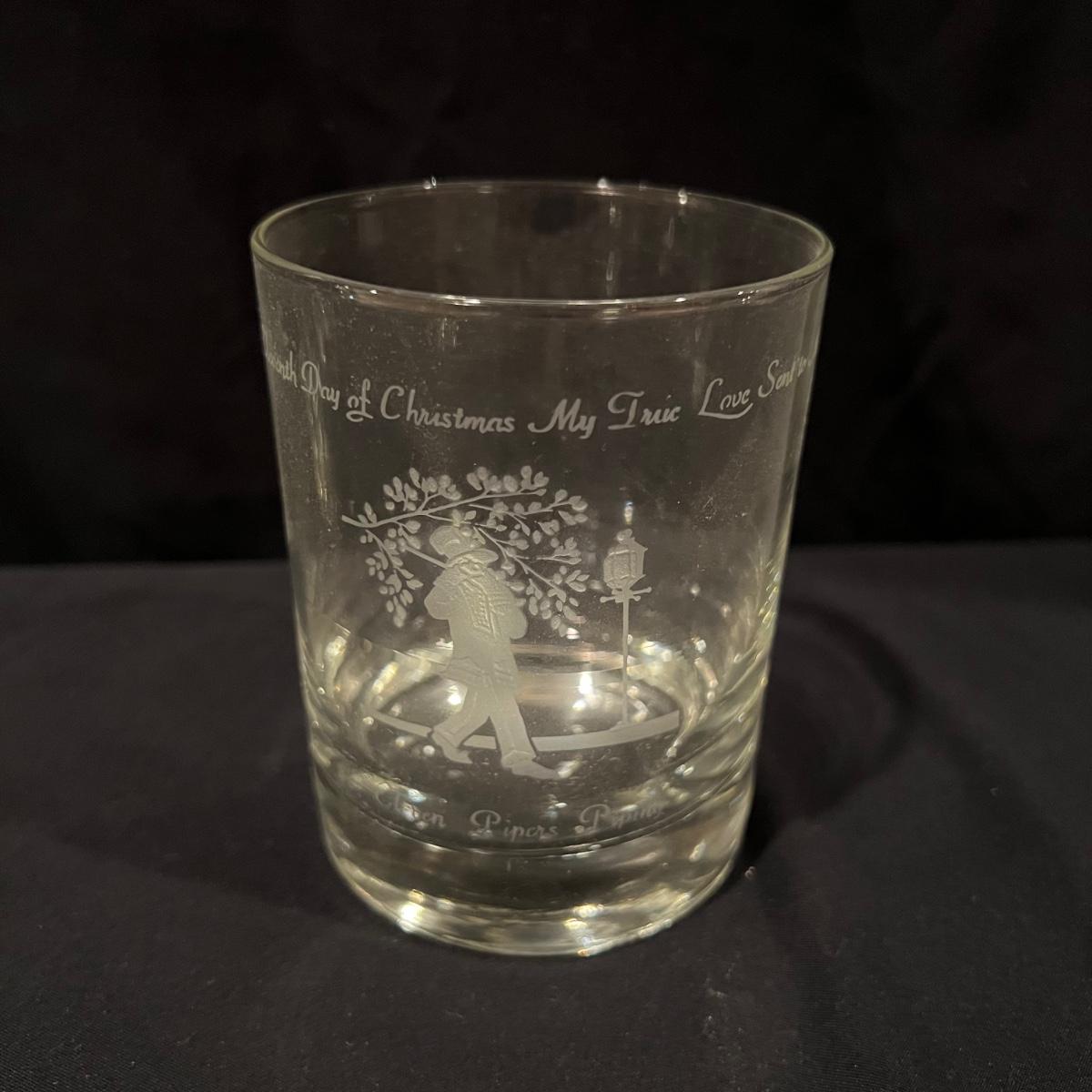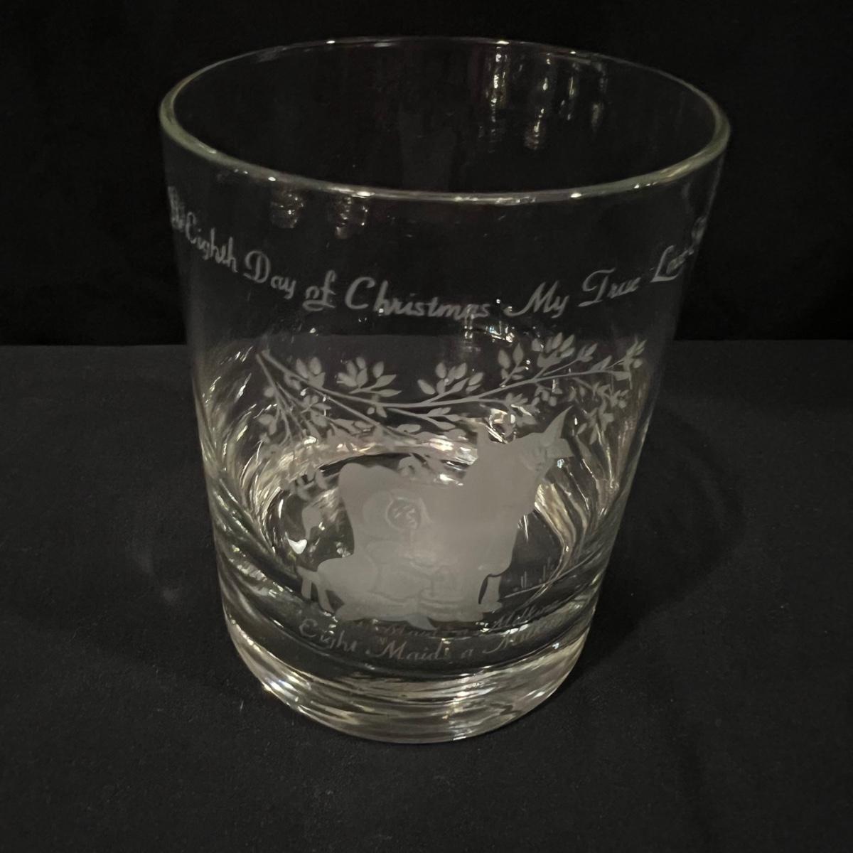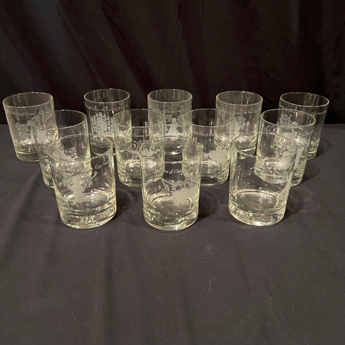 Twelve acid etched design glasses styled around the 12 days of Christmas song. Each glass is uniquely etched with the representing day in the song. They all measure 2.25”D x 4.25”H.