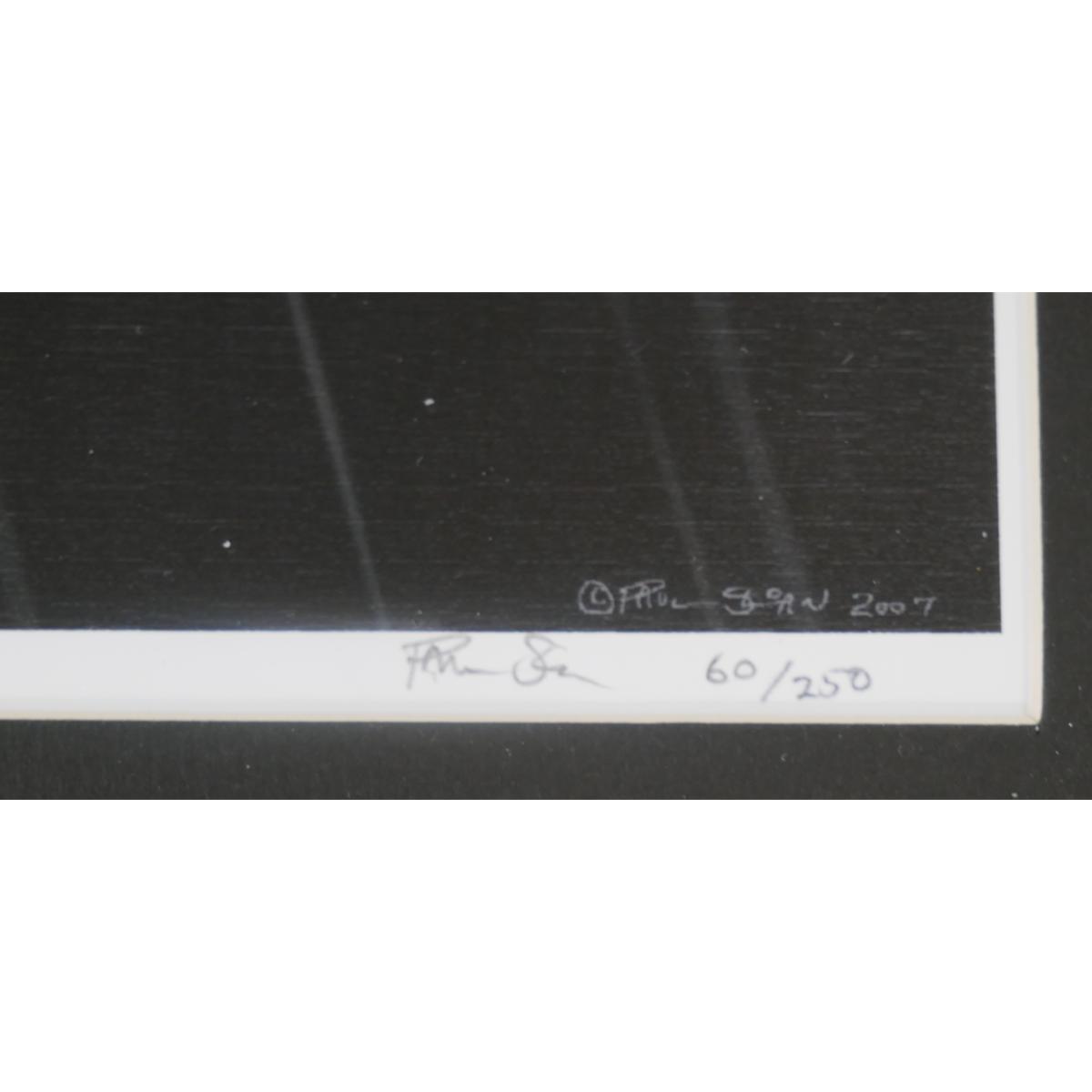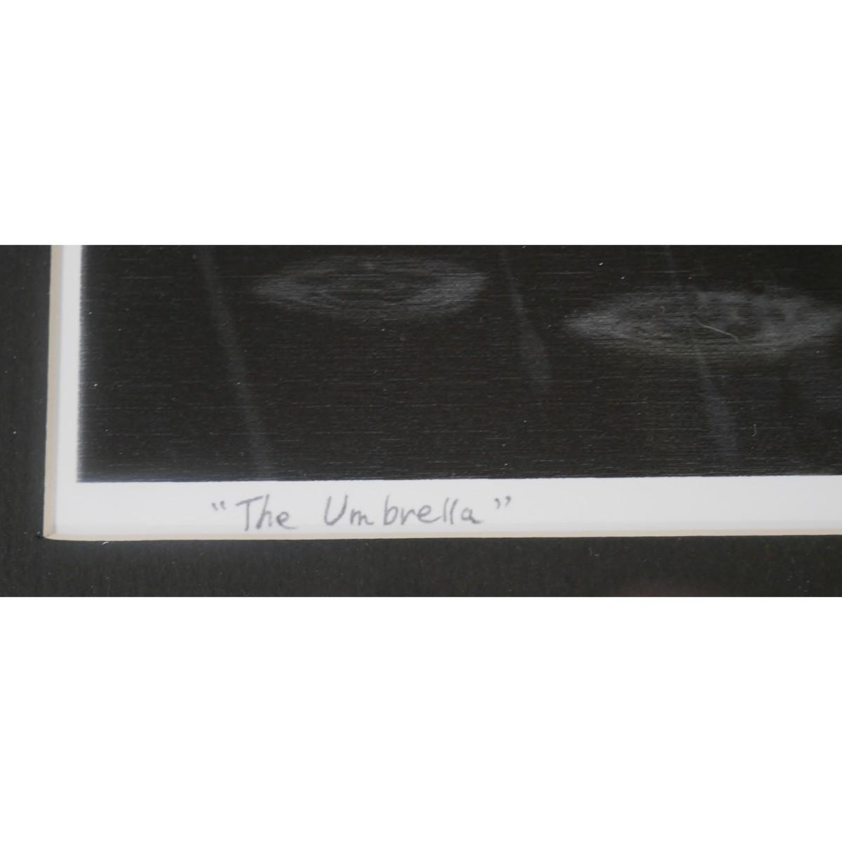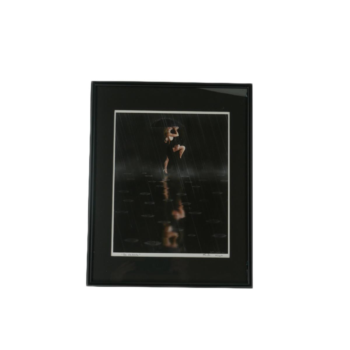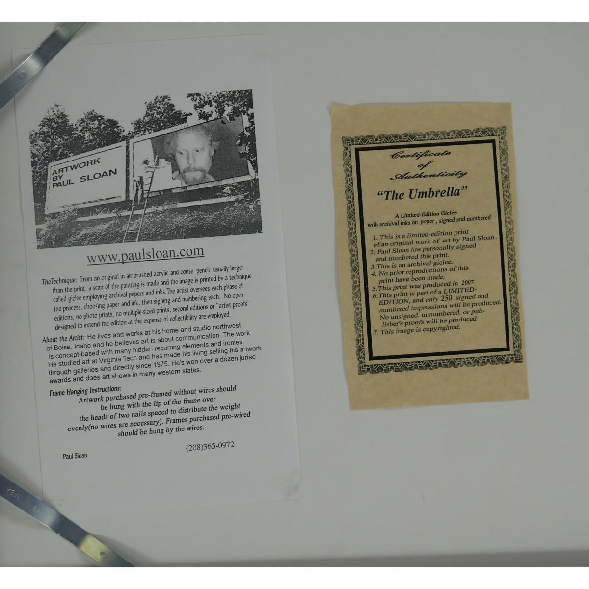 "The Umbrella" by Paul Sloan limited edition giclee, numbered 60/250. Certificate of Authenticity is included. Glass in frame is chipped in some areas (see photos). Art measures L 8" x H 9.75". Frame measures L 11.5" x H 14.5" x D 1". Weight is 1 lb 13 oz. (A20)