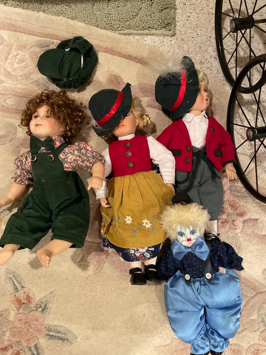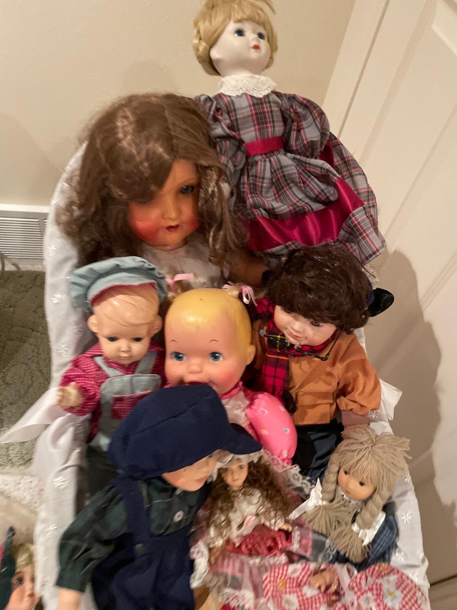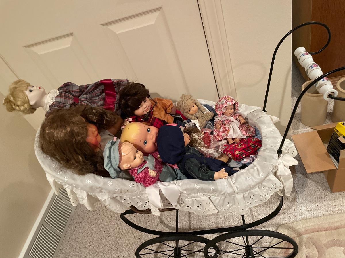 Multiple vintage dolls, and doll buggy