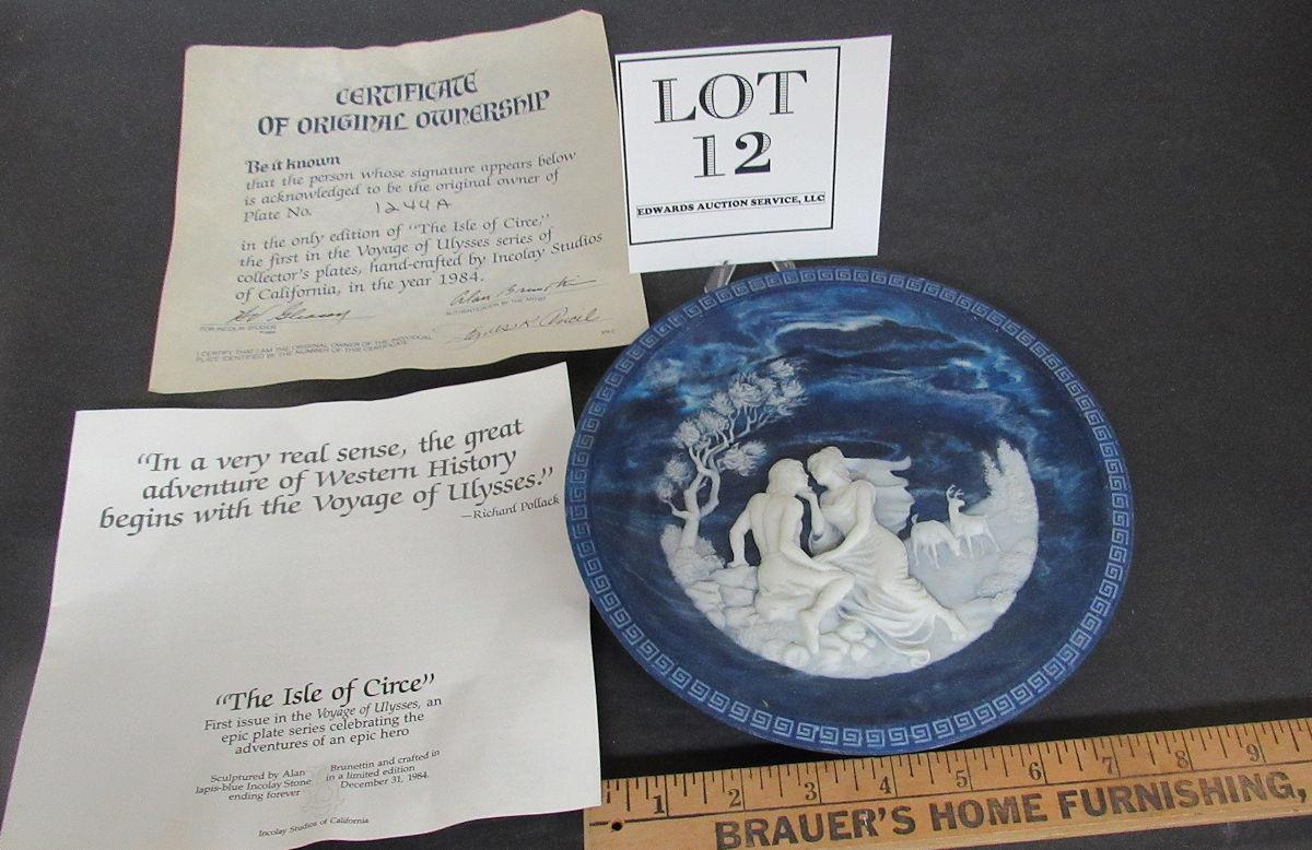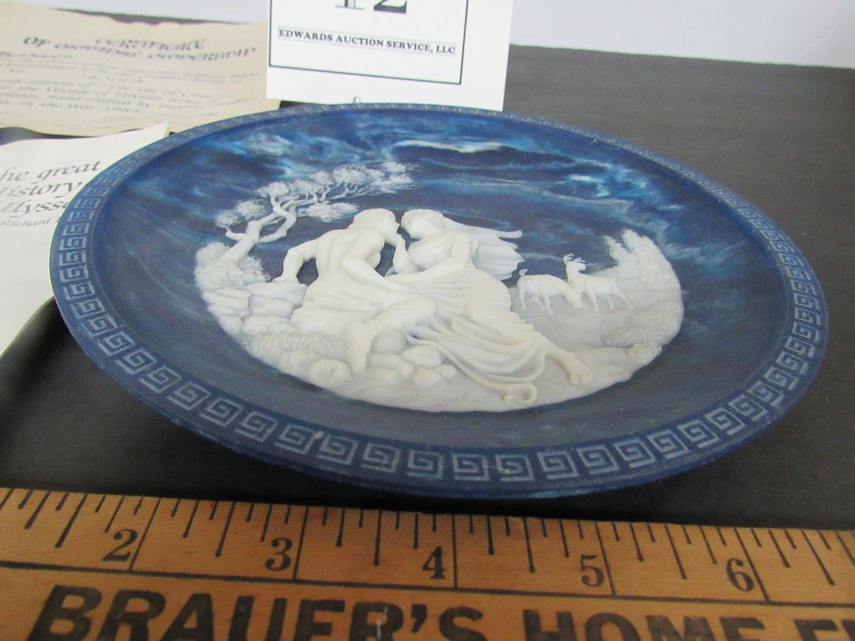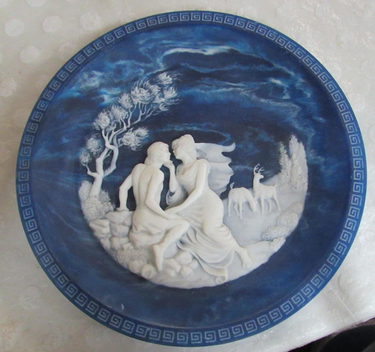 This is made of Lapis Blue Incolay Cameo Stone. The plate is dimensional with the figures rising out of the bottom. Incolay Studios of California. Very good condition. Shipping is available at shipping cost plus $5.00 handling fee on up to 8 lots, $10.00 handling fee on 9 or more lots or two boxes.