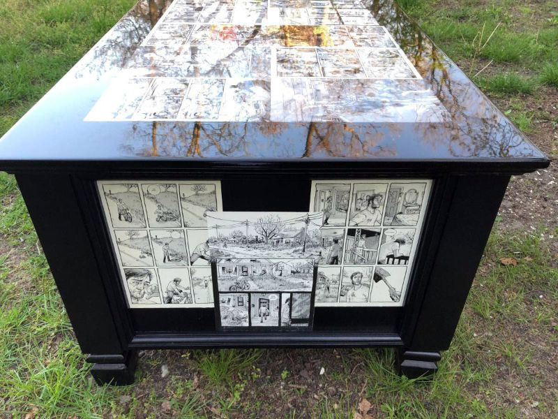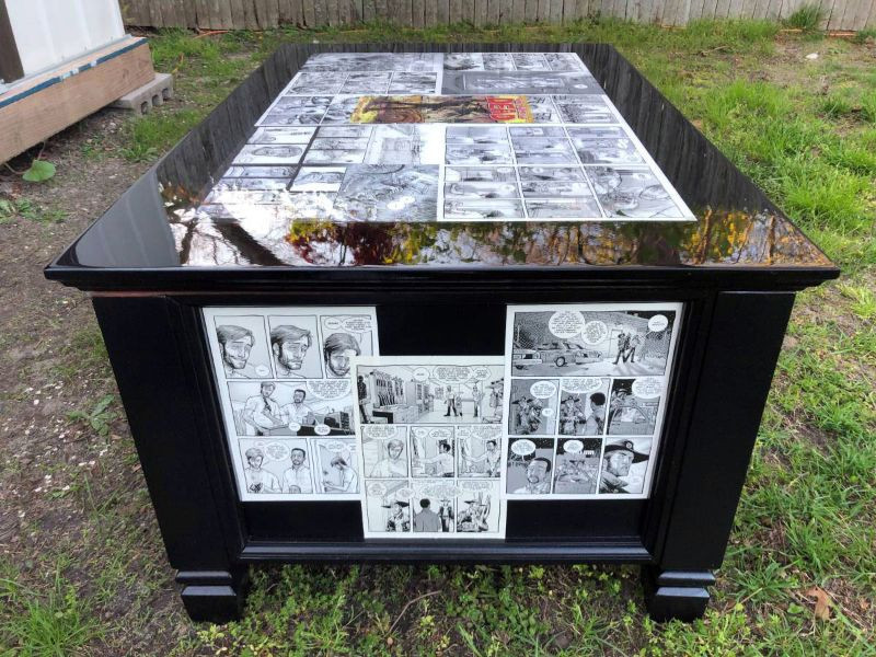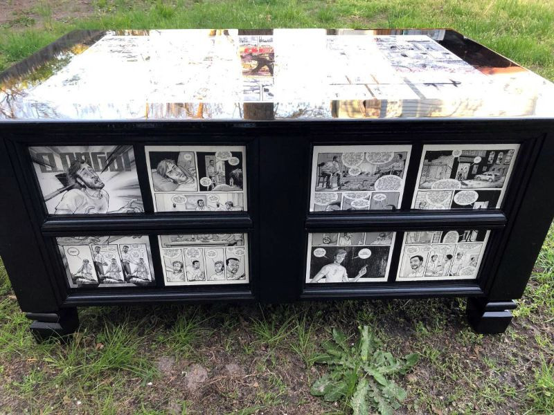 A unique one-of-a-kind coffee table / chest. This table has been repurposed with REAL “The Walking Dead” comic books. Not only was a real comic used, but none other than The Walking Dead #1 (reprint)! The whole table tells the entire story of the first comic that started it all. From Rick getting shot and waking in the hospital, to his meeting with Morgan and journey to Atlanta. Starting at the table top we have the comic cover, then from top left across to bottom right are the story pages in order. From the table top, to the table front, right side, backside, and the story finally wrapping up on the left side of the table. The table tells the story. The table top has been coated in a clear epoxy giving the table top a shiny glass like surface. The table top is 41” wide x 27” deep. The chest inside is 36 1/2” wide x 22 1/4 deep x 13 3/4” in height. The inside of the storage chest is like new, beautiful clean wood. A beautiful piece for any Walking Dead or comic book fan!