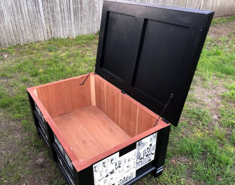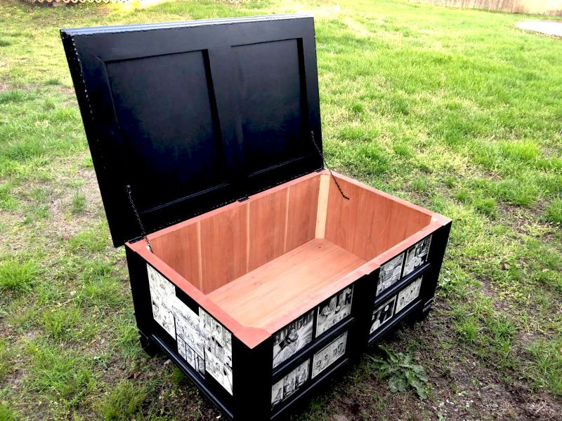A unique one-of-a-kind coffee table / chest. This table has been repurposed with REAL “The Walking Dead” comic books. Not only was a real comic used, but none other than The Walking Dead #1 (reprint)! The whole table tells the entire story of the first comic that started it all. From Rick getting shot and waking in the hospital, to his meeting with Morgan and journey to Atlanta. Starting at the table top we have the comic cover, then from top left across to bottom right are the story pages in order. From the table top, to the table front, right side, backside, and the story finally wrapping up on the left side of the table. The table tells the story. The table top has been coated in a clear epoxy giving the table top a shiny glass like surface. The table top is 41” wide x 27” deep. The chest inside is 36 1/2” wide x 22 1/4 deep x 13 3/4” in height. The inside of the storage chest is like new, beautiful clean wood. A beautiful piece for any Walking Dead or comic book fan!