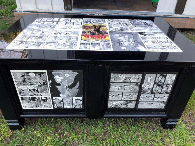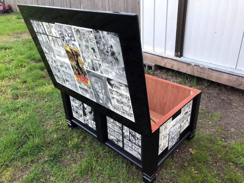 A unique one-of-a-kind coffee table / chest. This table has been repurposed with REAL “The Walking Dead” comic books. Not only was a real comic used, but none other than The Walking Dead #1 (reprint)! The whole table tells the entire story of the first comic that started it all. From Rick getting shot and waking in the hospital, to his meeting with Morgan and journey to Atlanta. Starting at the table top we have the comic cover, then from top left across to bottom right are the story pages in order. From the table top, to the table front, right side, backside, and the story finally wrapping up on the left side of the table. The table tells the story. The table top has been coated in a clear epoxy giving the table top a shiny glass like surface. The table top is 41” wide x 27” deep. The chest inside is 36 1/2” wide x 22 1/4 deep x 13 3/4” in height. The inside of the storage chest is like new, beautiful clean wood. A beautiful piece for any Walking Dead or comic book fan!