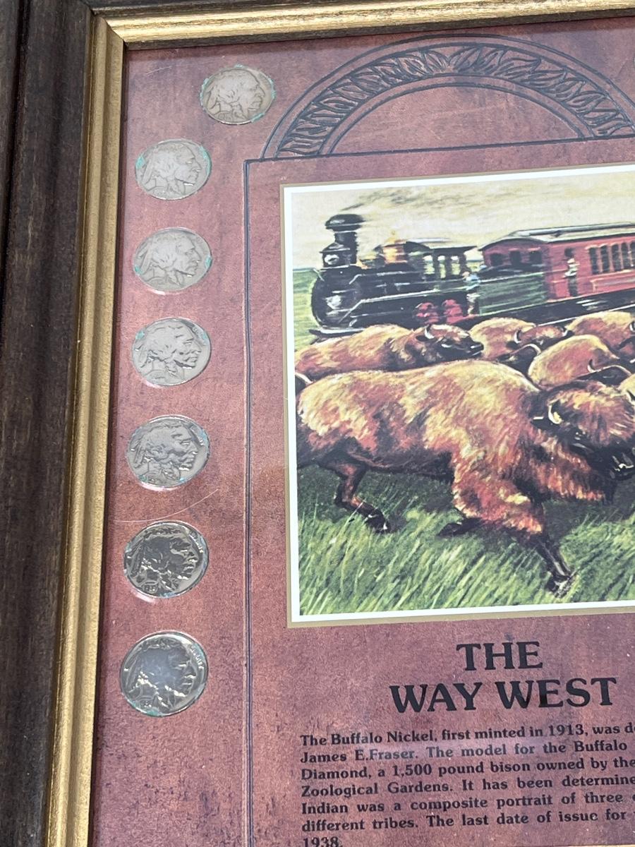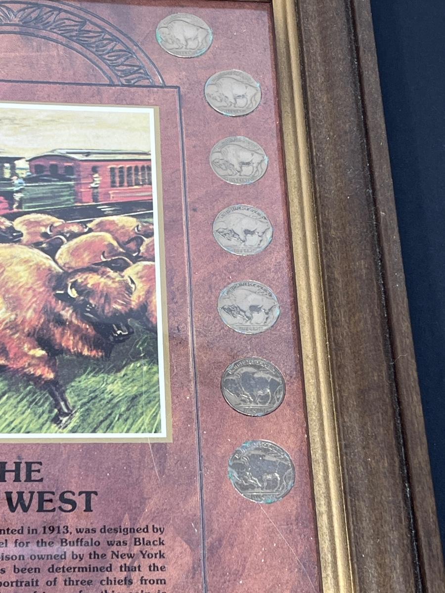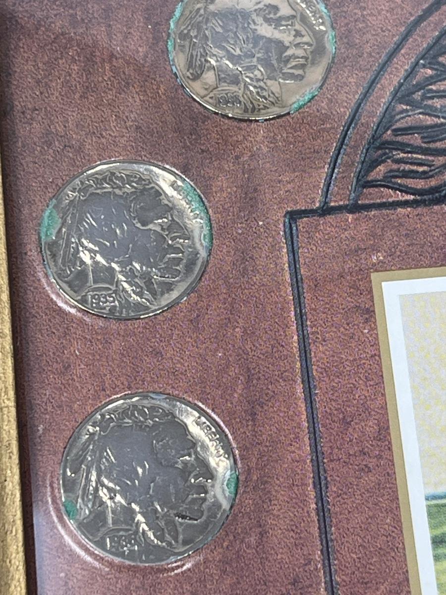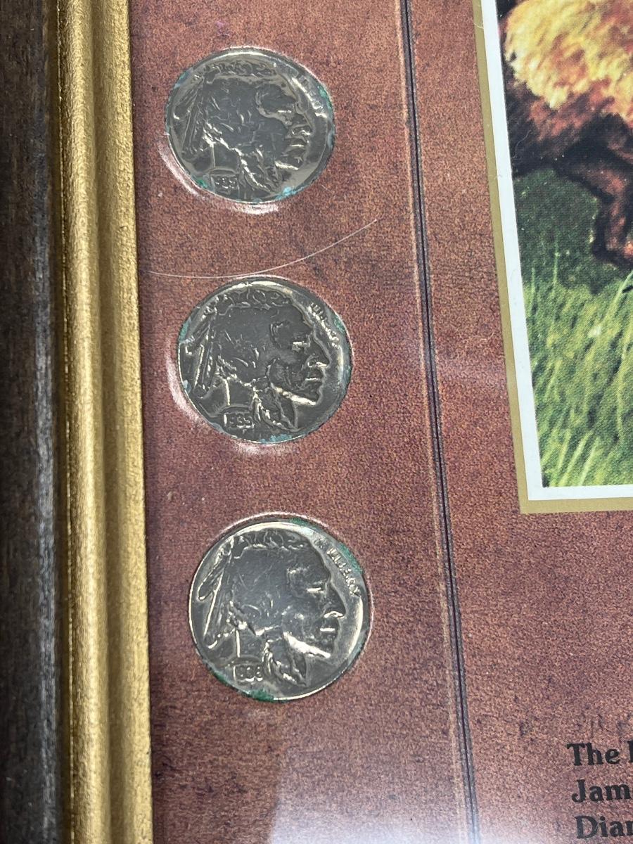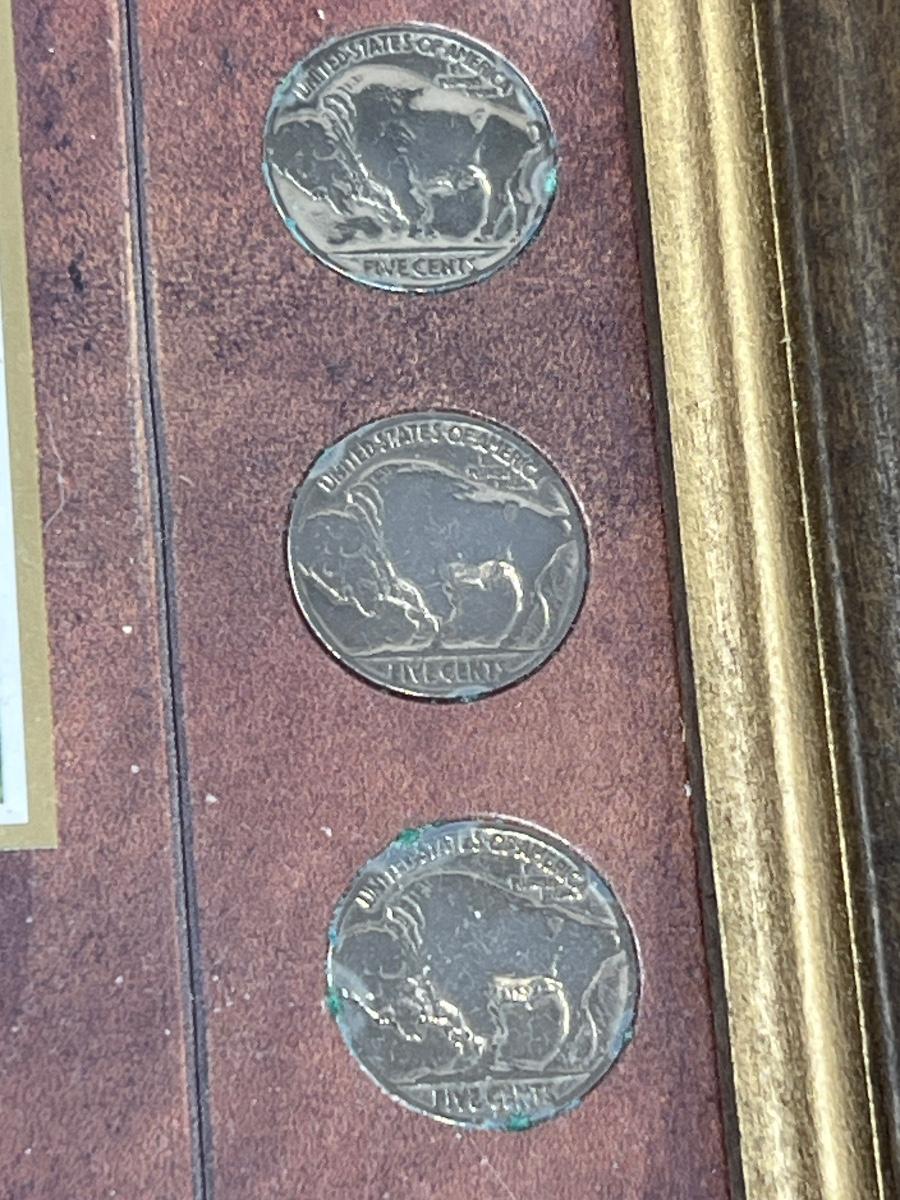 Framed commemorative coin collection of Native American/Buffalo (bison) U.S. coins/nickels. Maybe 1933, 35 and 36. Uncertain as to years where nickel is flipped to buffalo side. Some nickels appear to have corrosion. Wall plaque states the first nickel with this design was issued in 1913 and last date 1938.