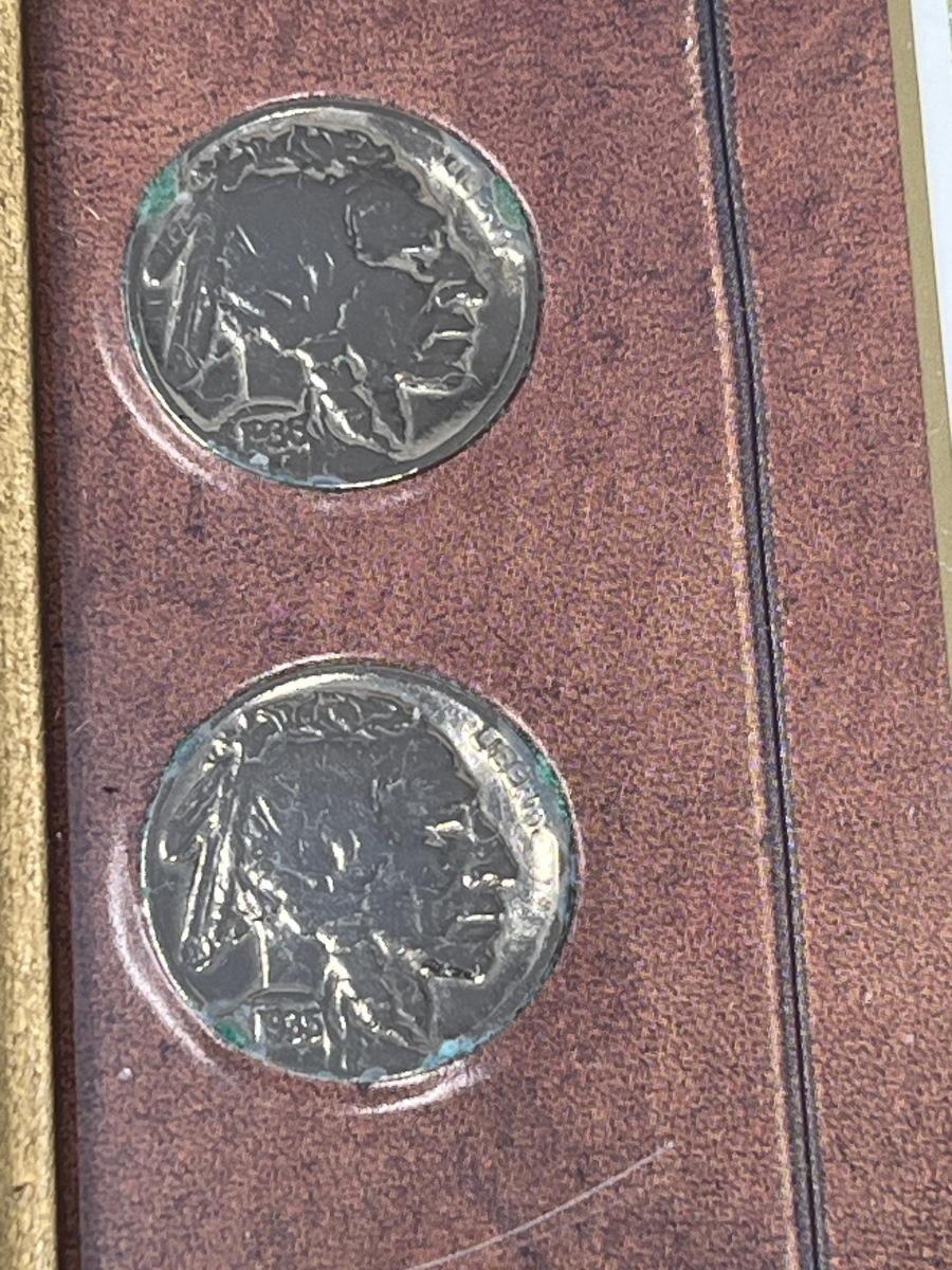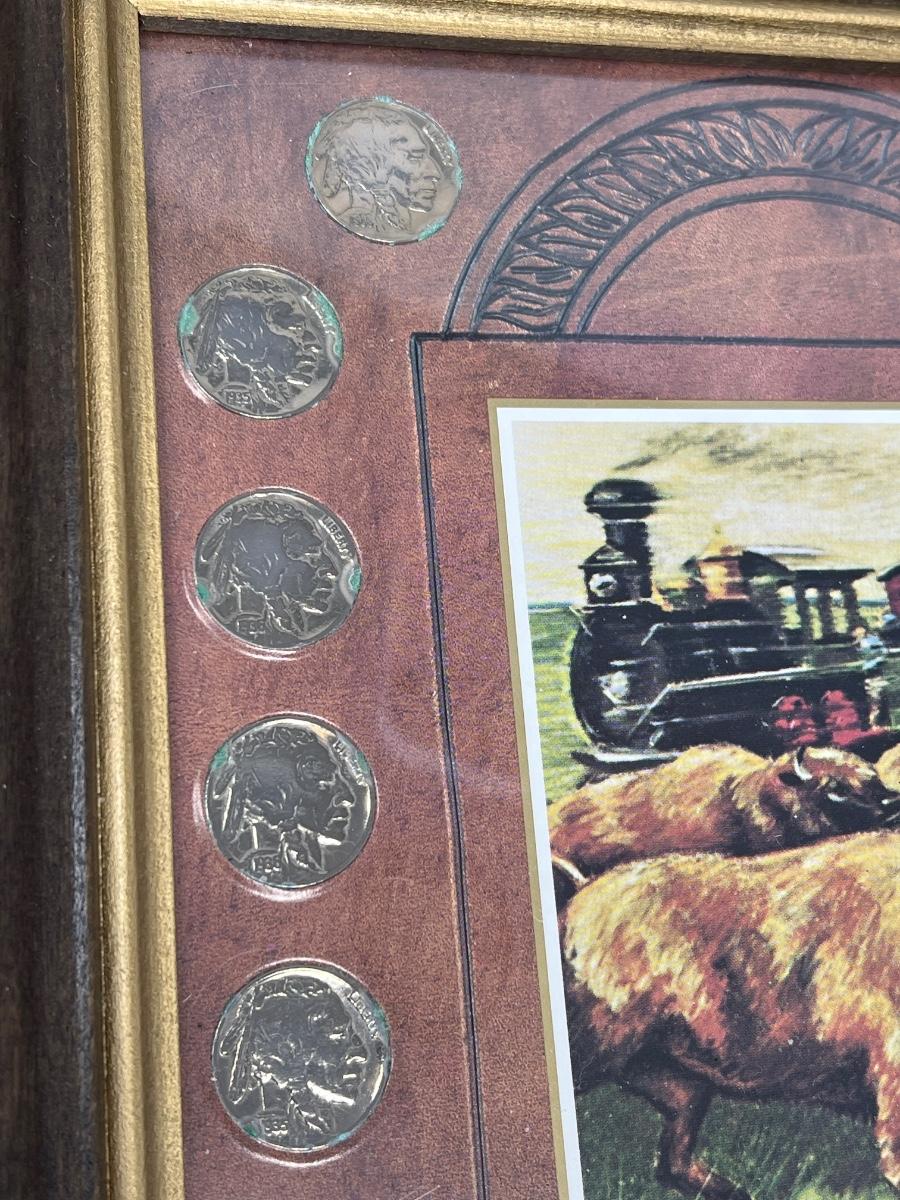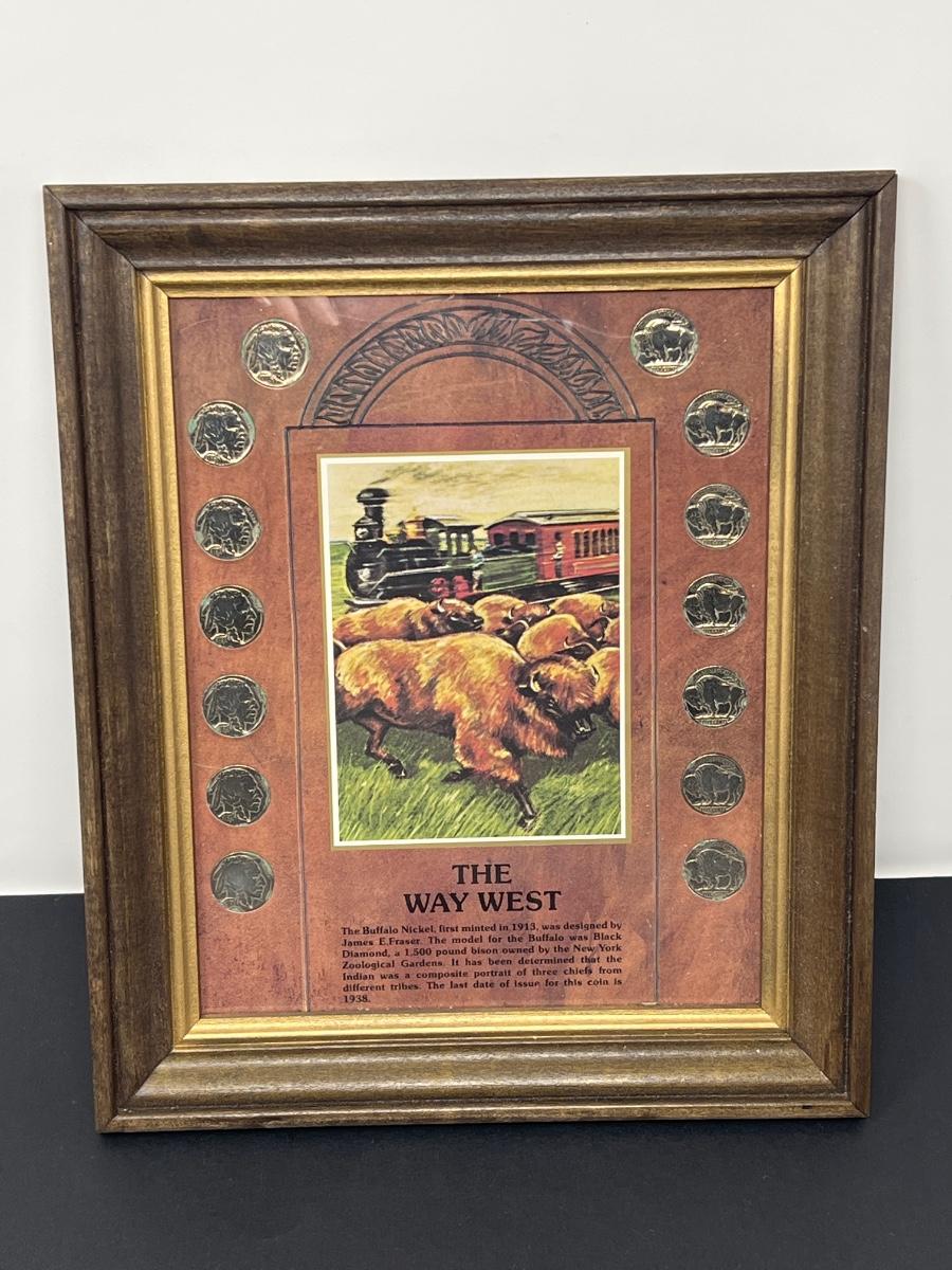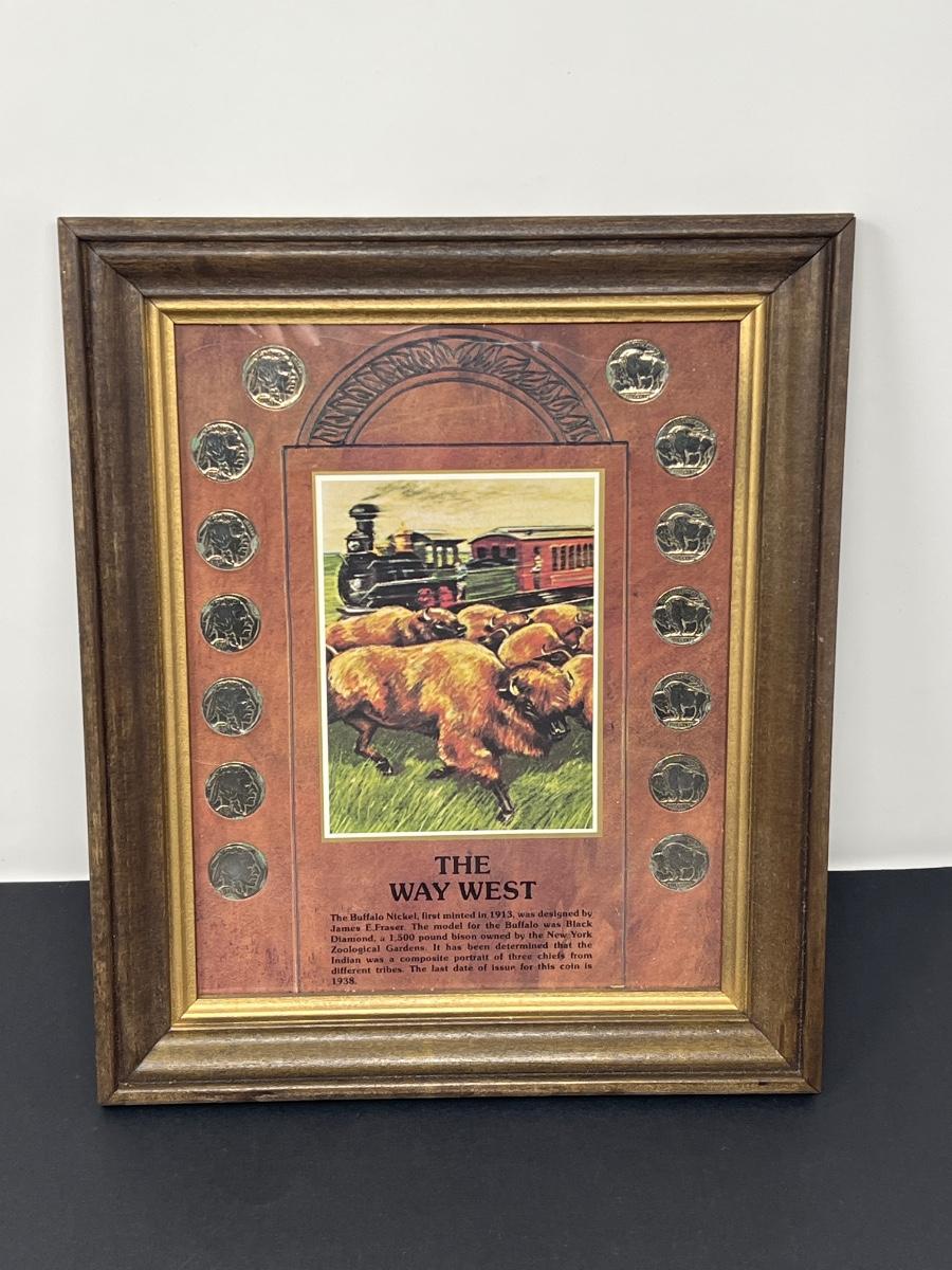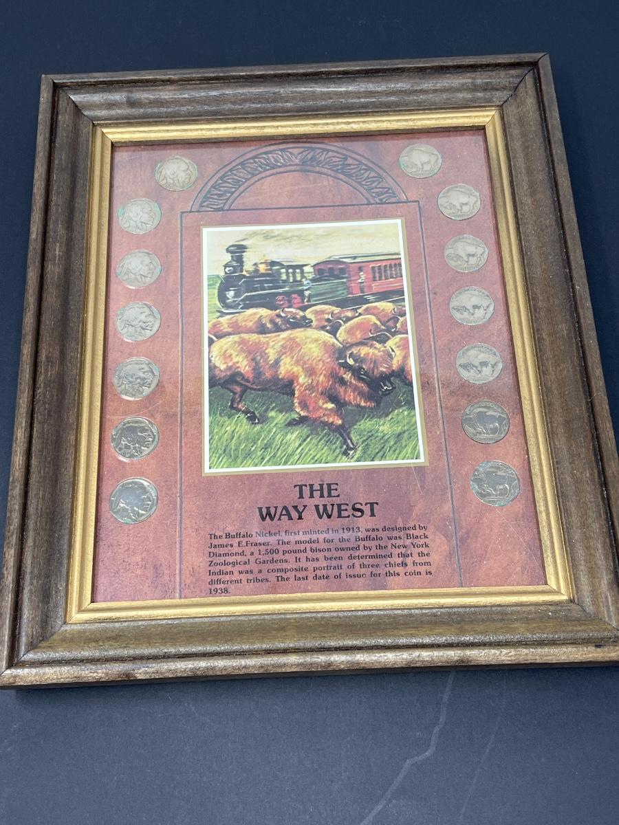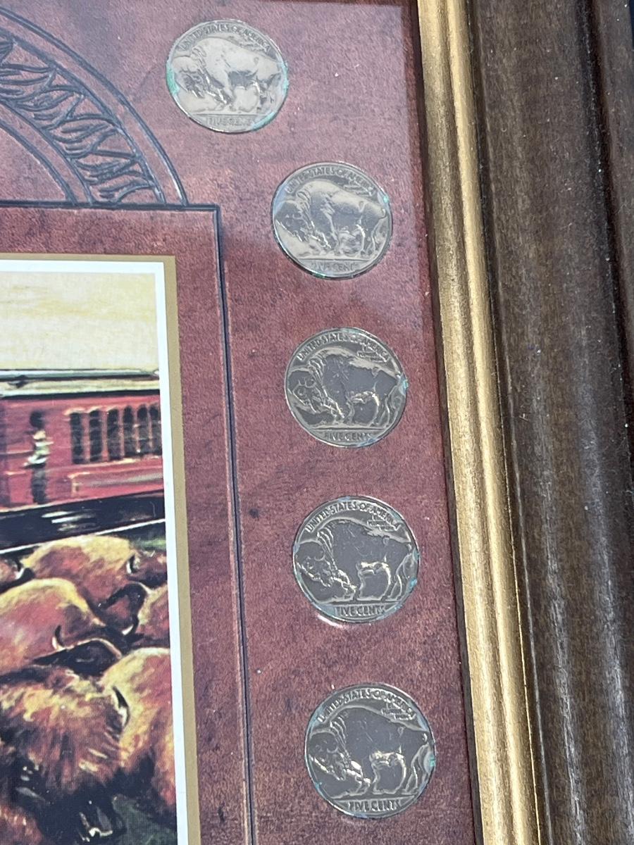 Framed commemorative coin collection of Native American/Buffalo (bison) U.S. coins/nickels. Maybe 1933, 35 and 36. Uncertain as to years where nickel is flipped to buffalo side. Some nickels appear to have corrosion. Wall plaque states the first nickel with this design was issued in 1913 and last date 1938.