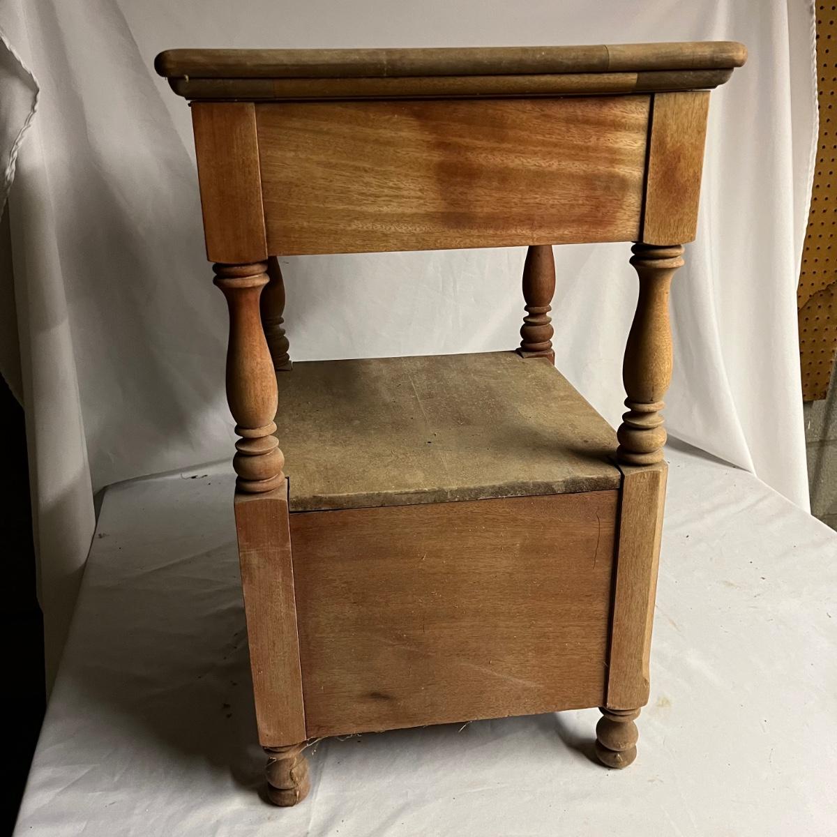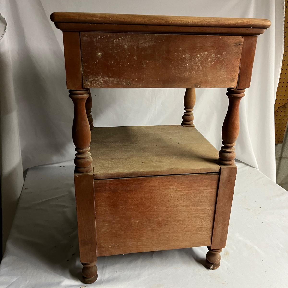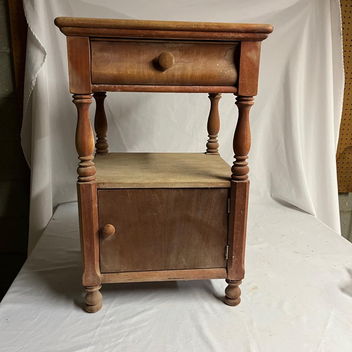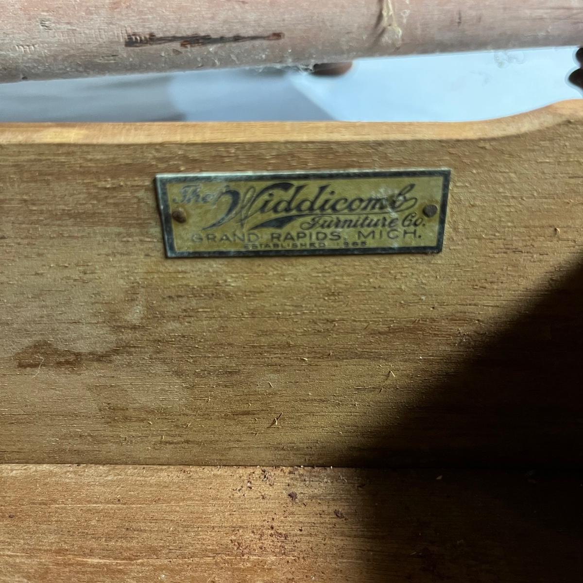 Lot includes an end table with dovetailed drawer and a cabinet below of which the door is not attached. Table is made by The Widdicomb Furniture Company. Wood is a bit faded, see pictures. Table measures 18” x 19” x 29”.