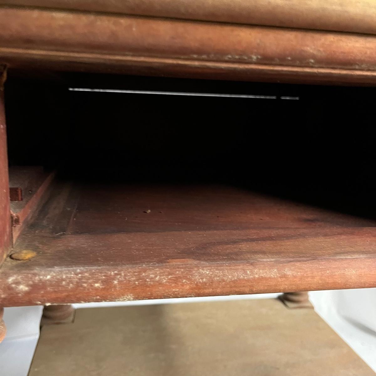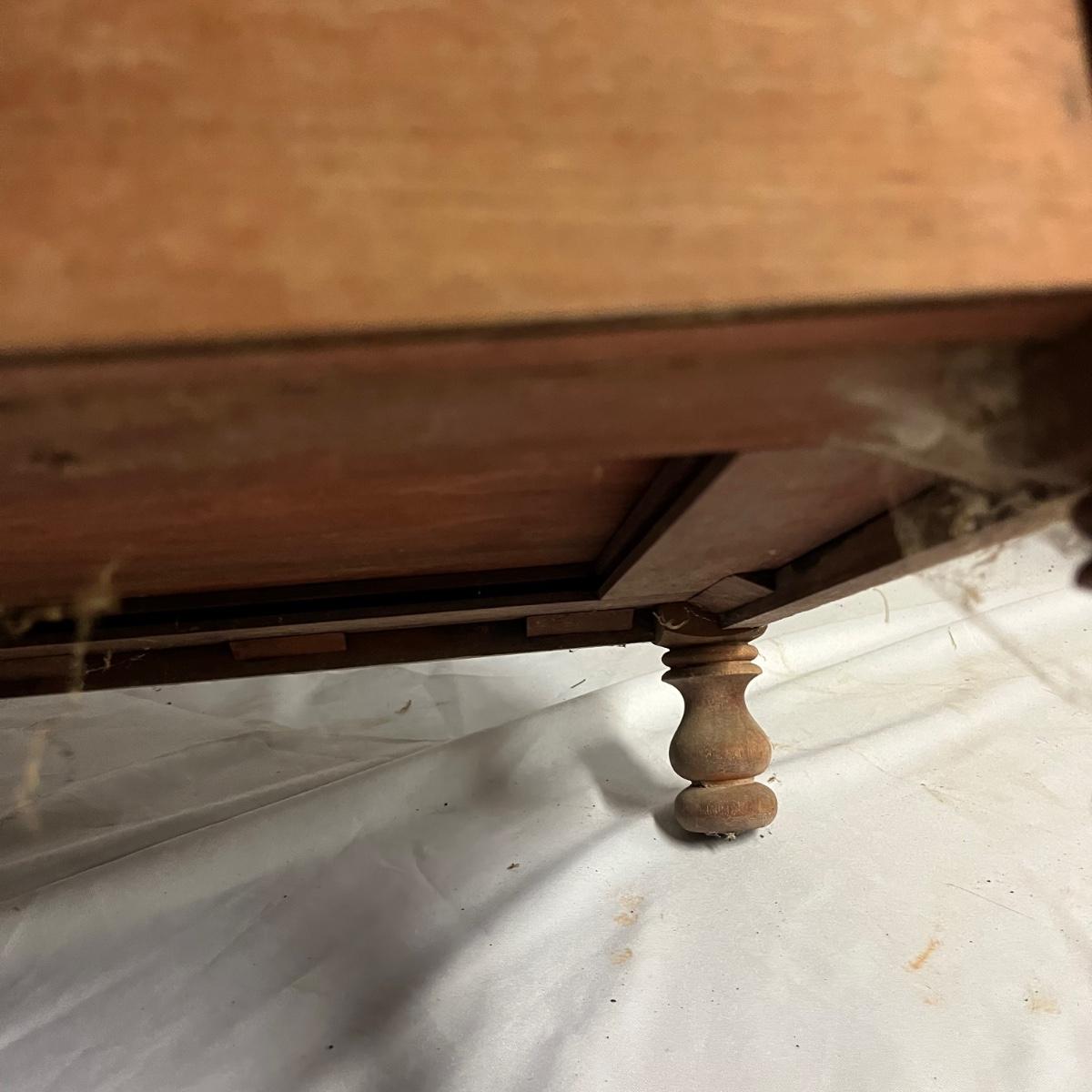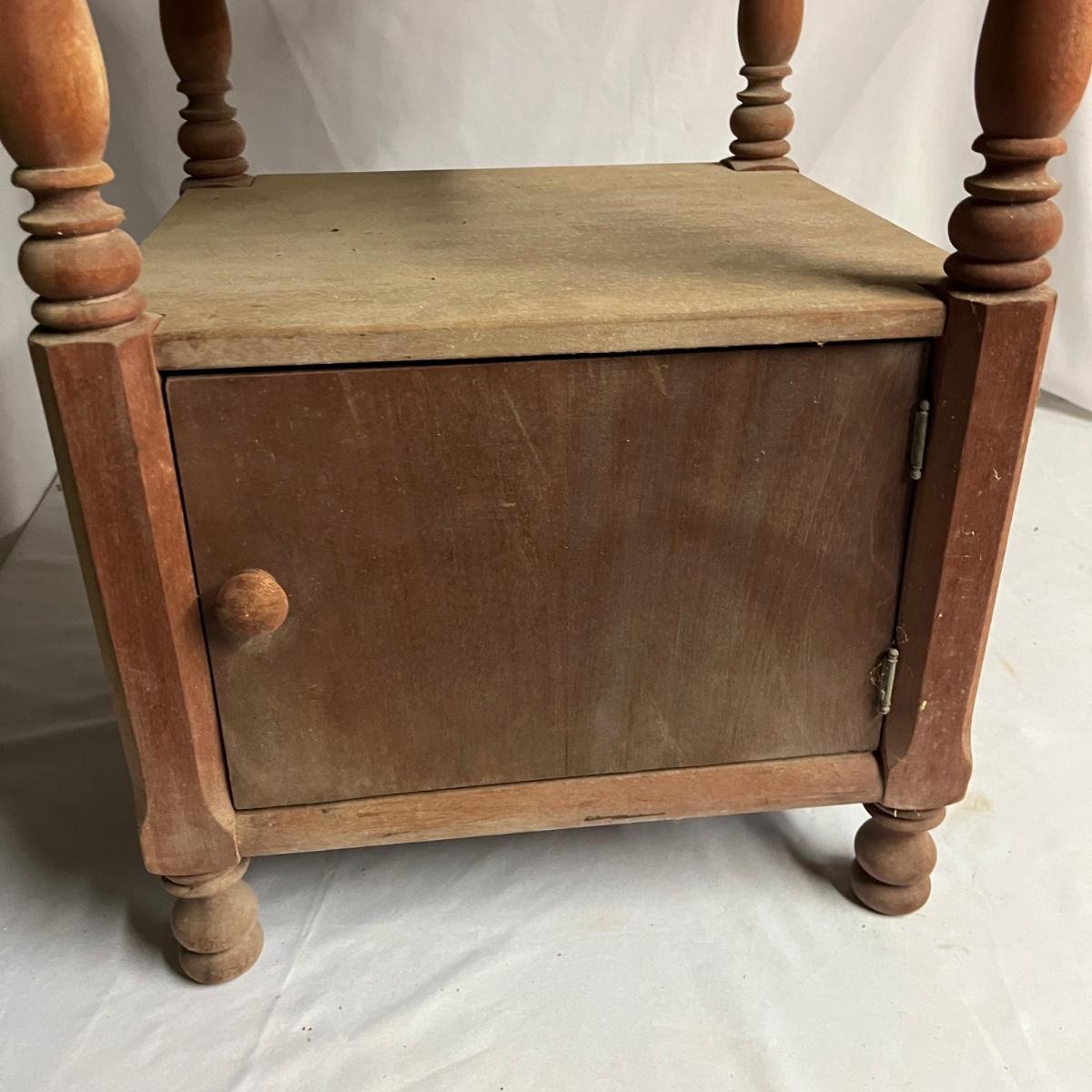 Lot includes an end table with dovetailed drawer and a cabinet below of which the door is not attached. Table is made by The Widdicomb Furniture Company. Wood is a bit faded, see pictures. Table measures 18” x 19” x 29”.