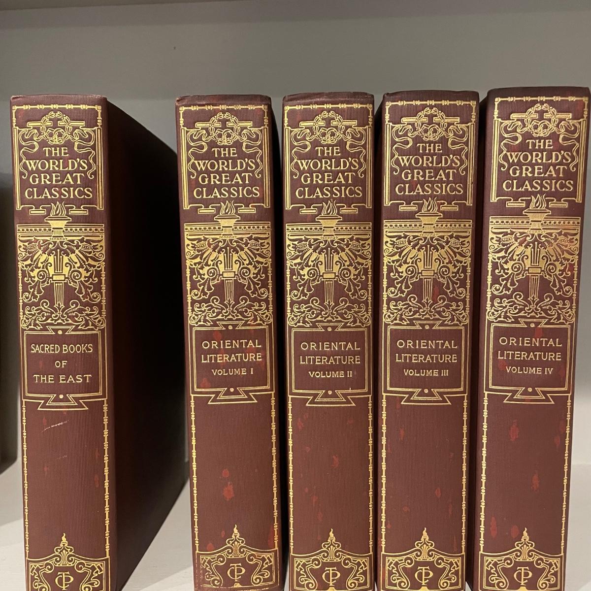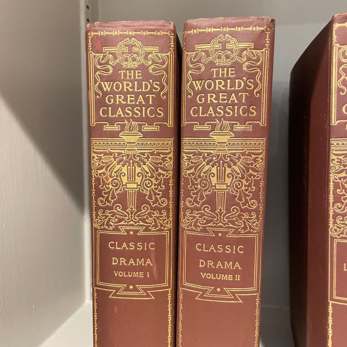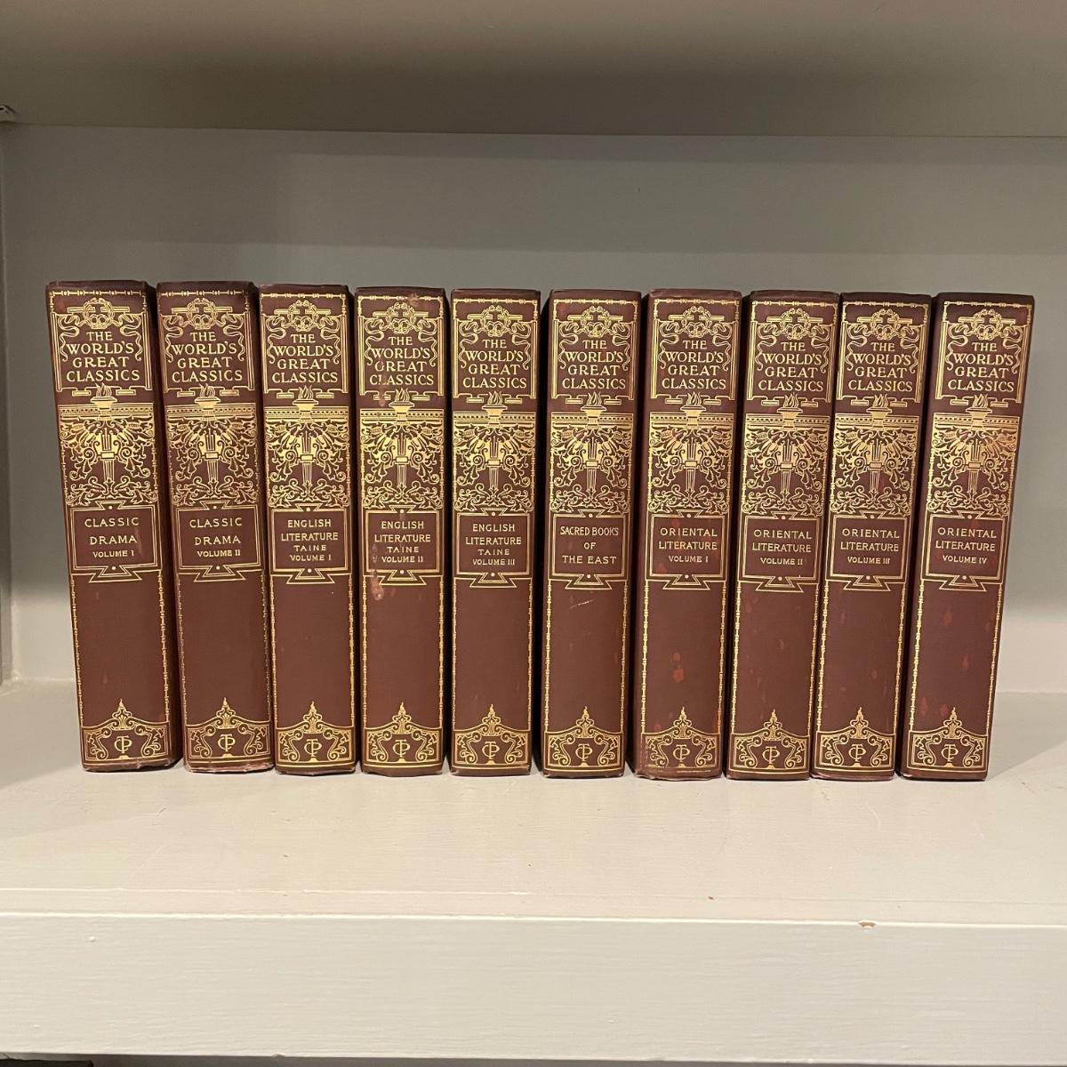 Ten volumes of The World"™s Great Classics published by The Colonial Press. Volumes include Classic Drama I and II, English Literature Vol. I, II, III, Oriental Literature Vol. I through IV and Sacred Books of the East. The books appear to be very nice for their age, some binding issues and blemishes are shown in photos. See images. Shipping available.