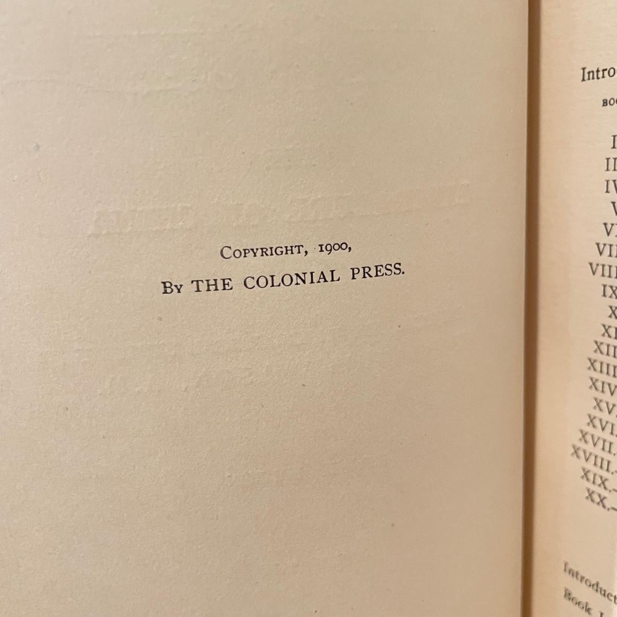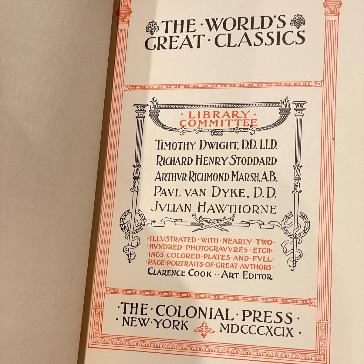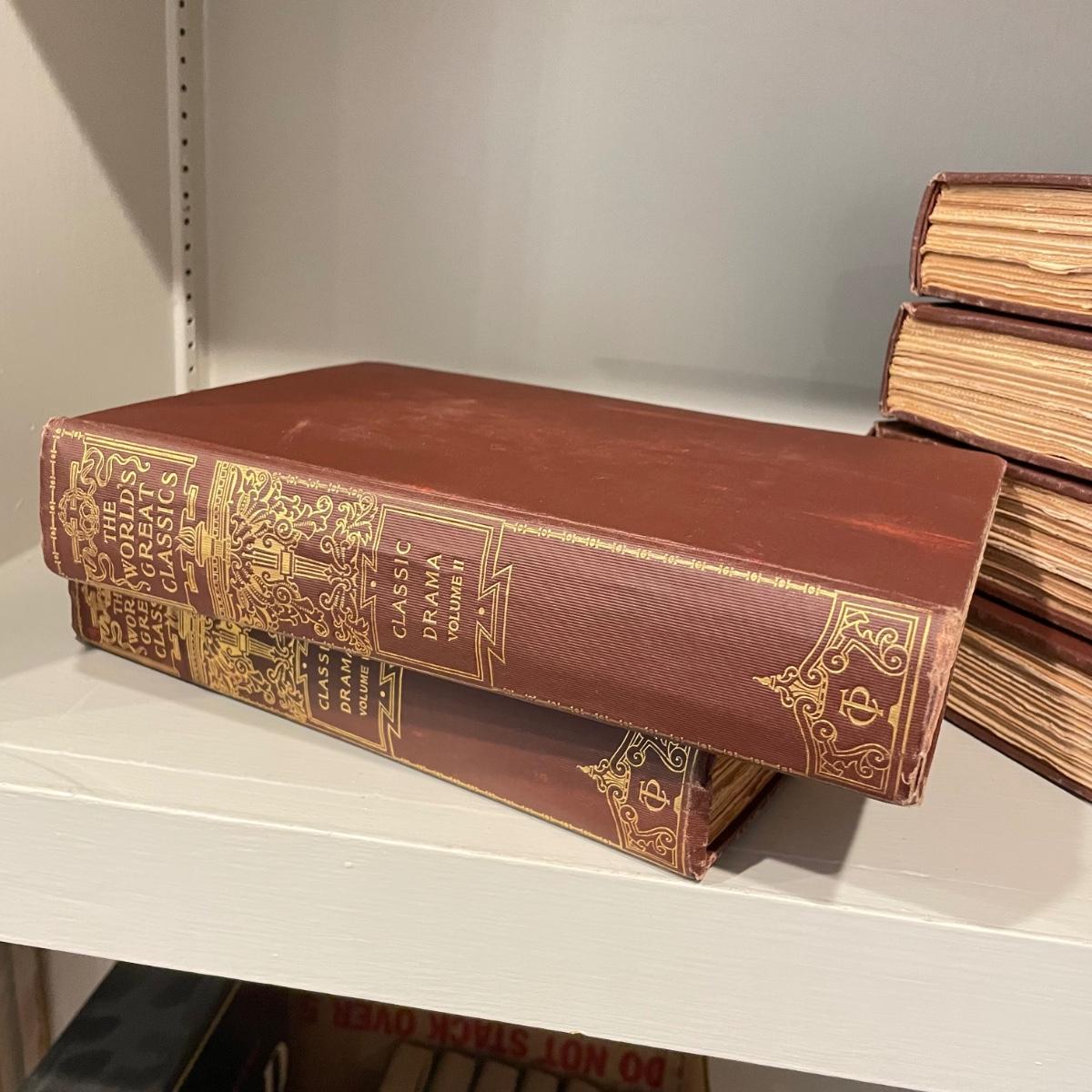 Ten volumes of The World"™s Great Classics published by The Colonial Press. Volumes include Classic Drama I and II, English Literature Vol. I, II, III, Oriental Literature Vol. I through IV and Sacred Books of the East. The books appear to be very nice for their age, some binding issues and blemishes are shown in photos. See images. Shipping available.
