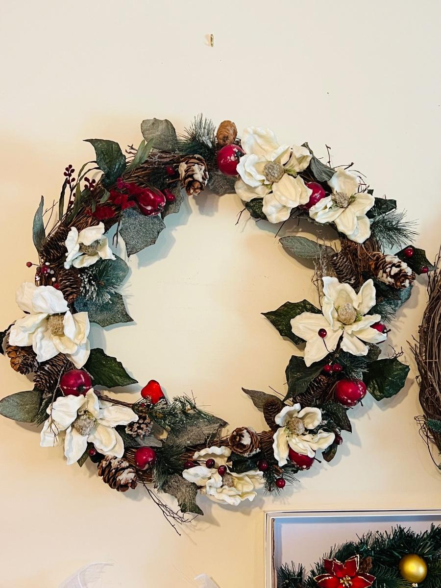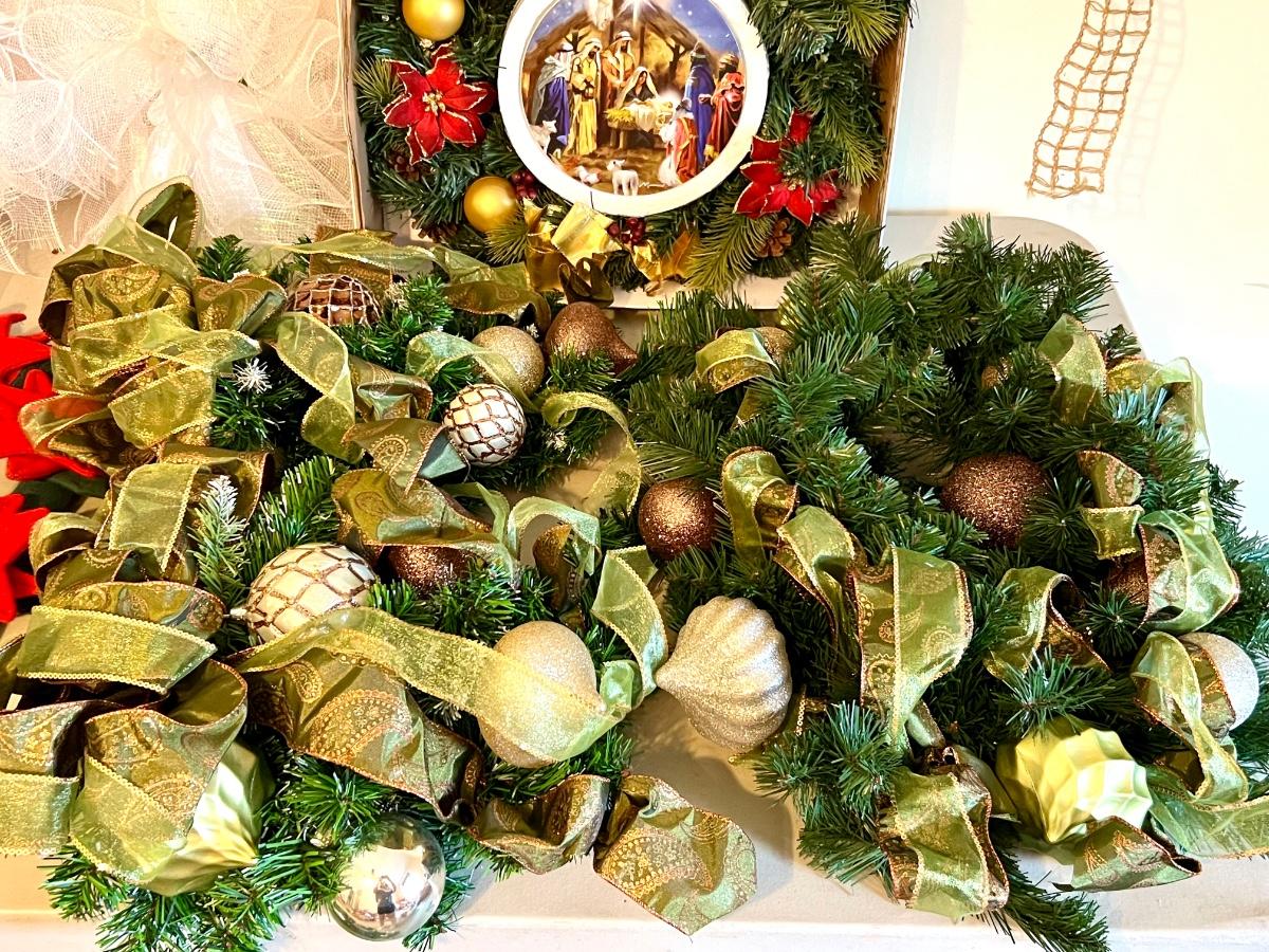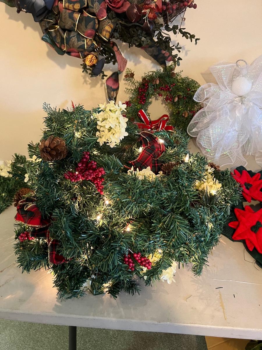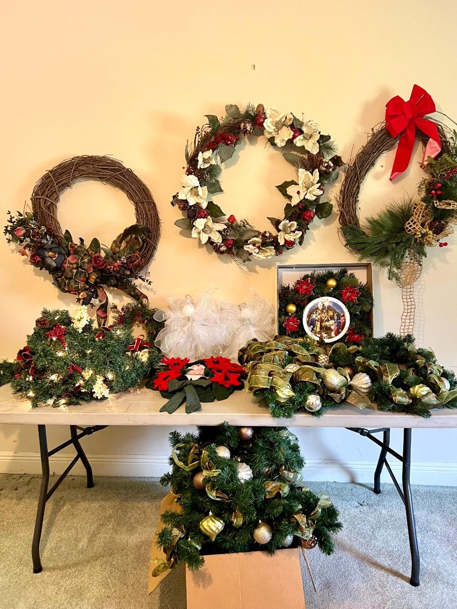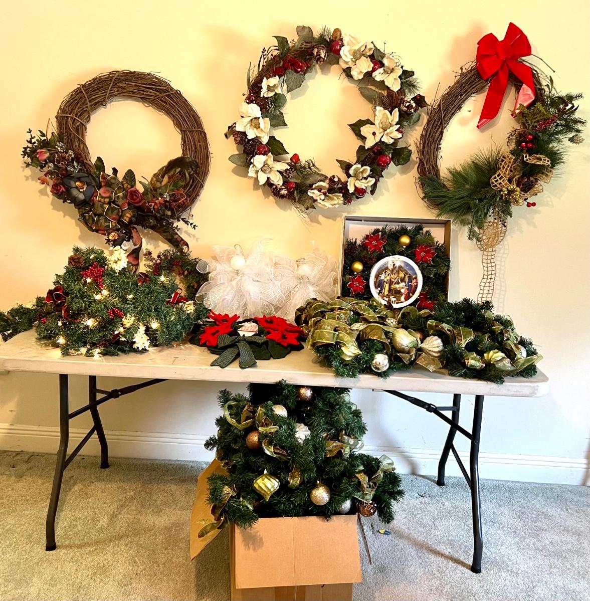 Wreaths and more wreathes. Also comes with light up garland. The box is filled with garland and two matching ones on the table are wreaths. Everything you see here. Table not included.