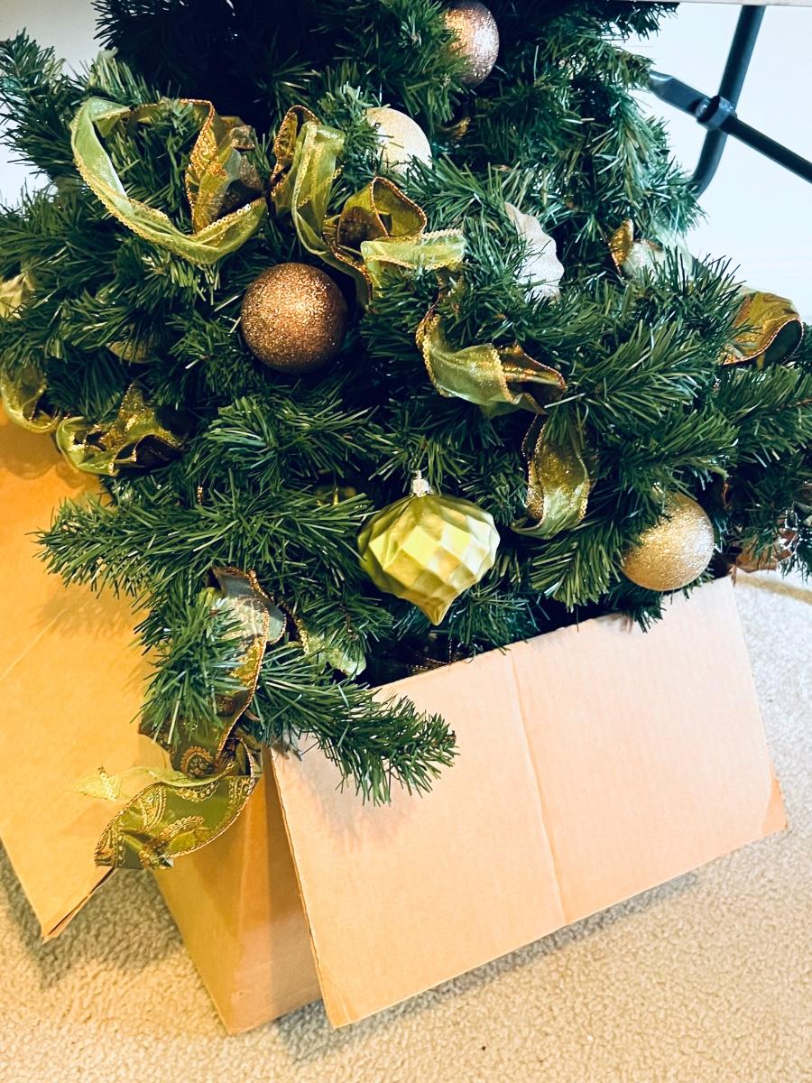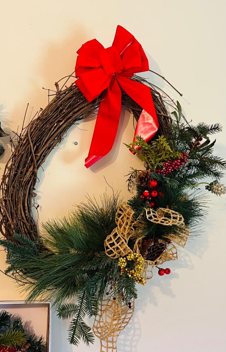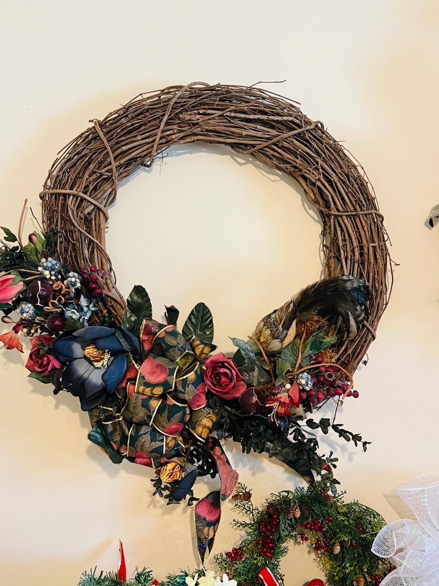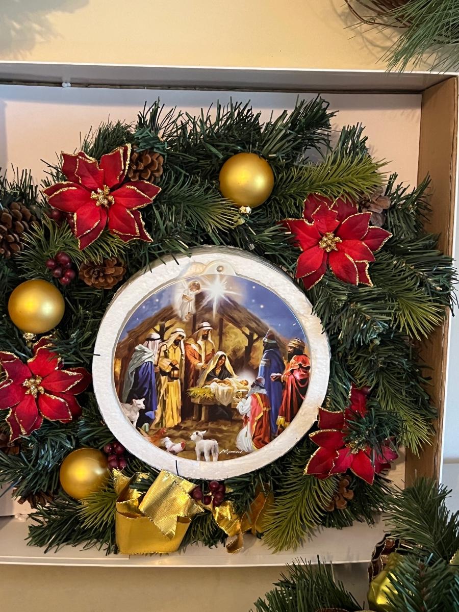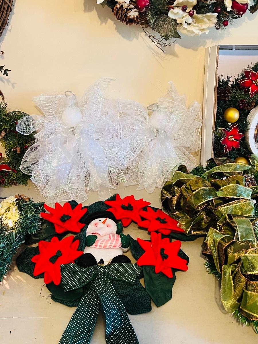 Wreaths and more wreathes. Also comes with light up garland. The box is filled with garland and two matching ones on the table are wreaths. Everything you see here. Table not included.