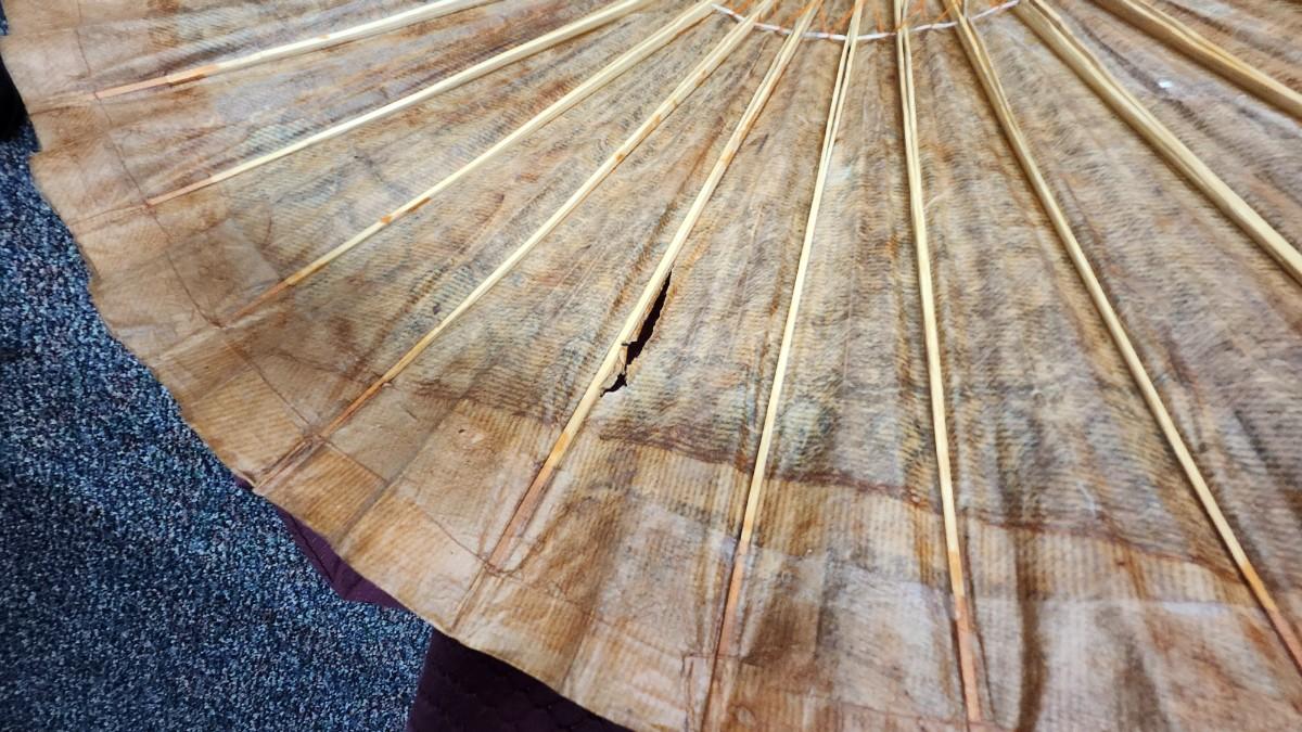 This is perfect for a statement piece! Bamboo, with dragons. 36" diameter, with a 26" tall handle. It is pretty tight, and there is some wear at the top of the handle. There is also a split seam, pictured. All in all, it's a great piece. Retail online for this item is about $500.