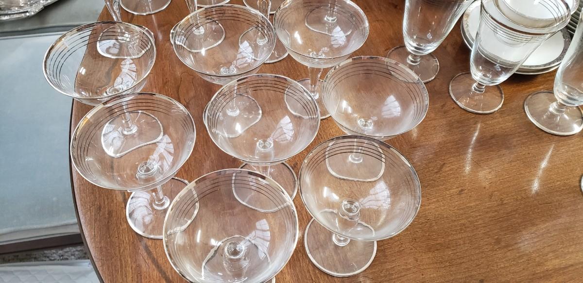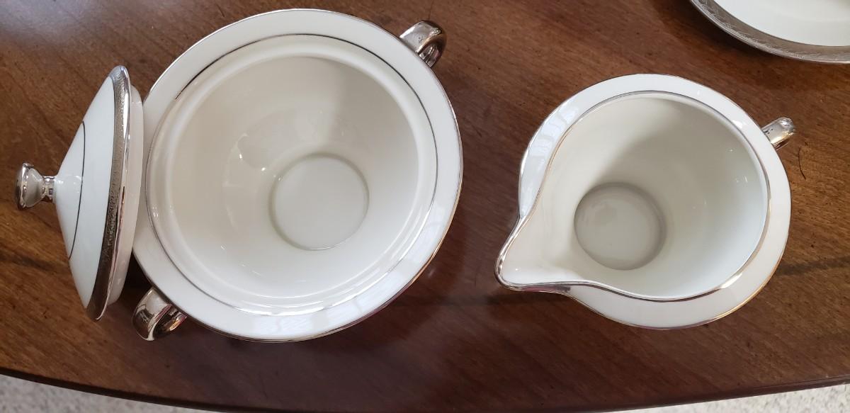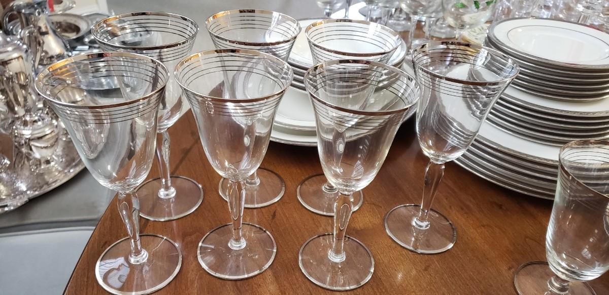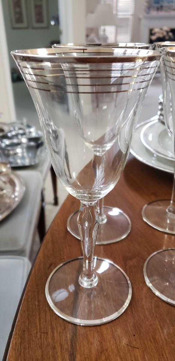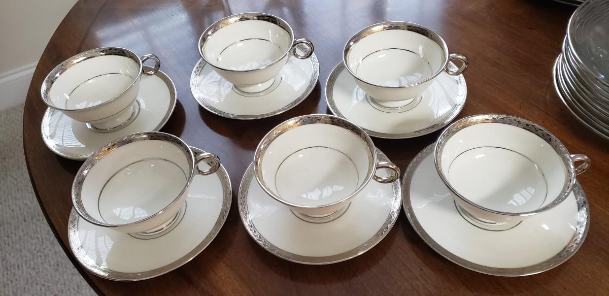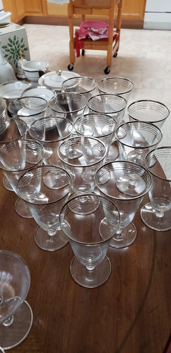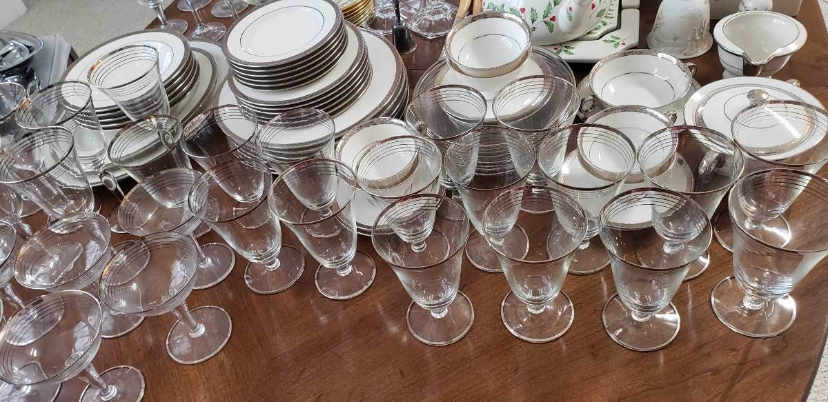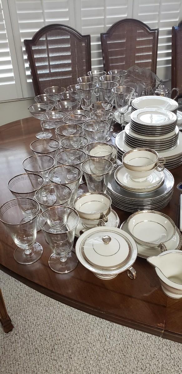 Amazing vintage china set. Platinum rim on white China. Service for 6. Includes all glasses.