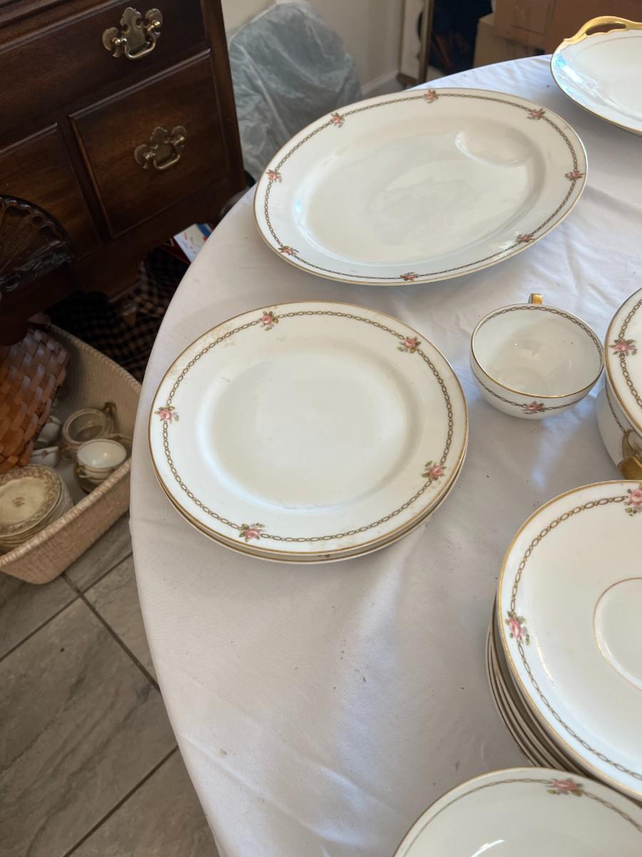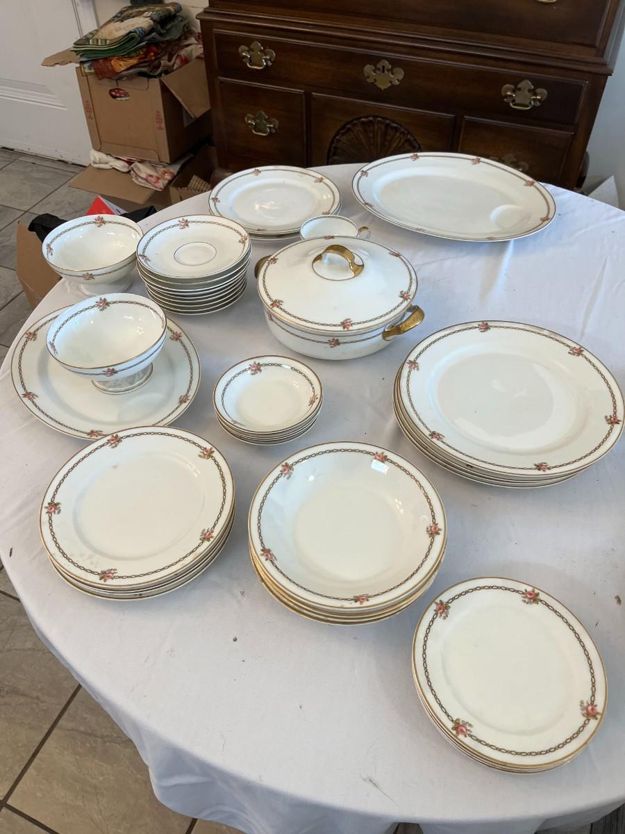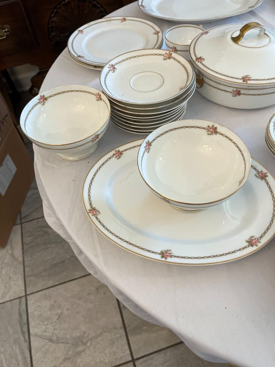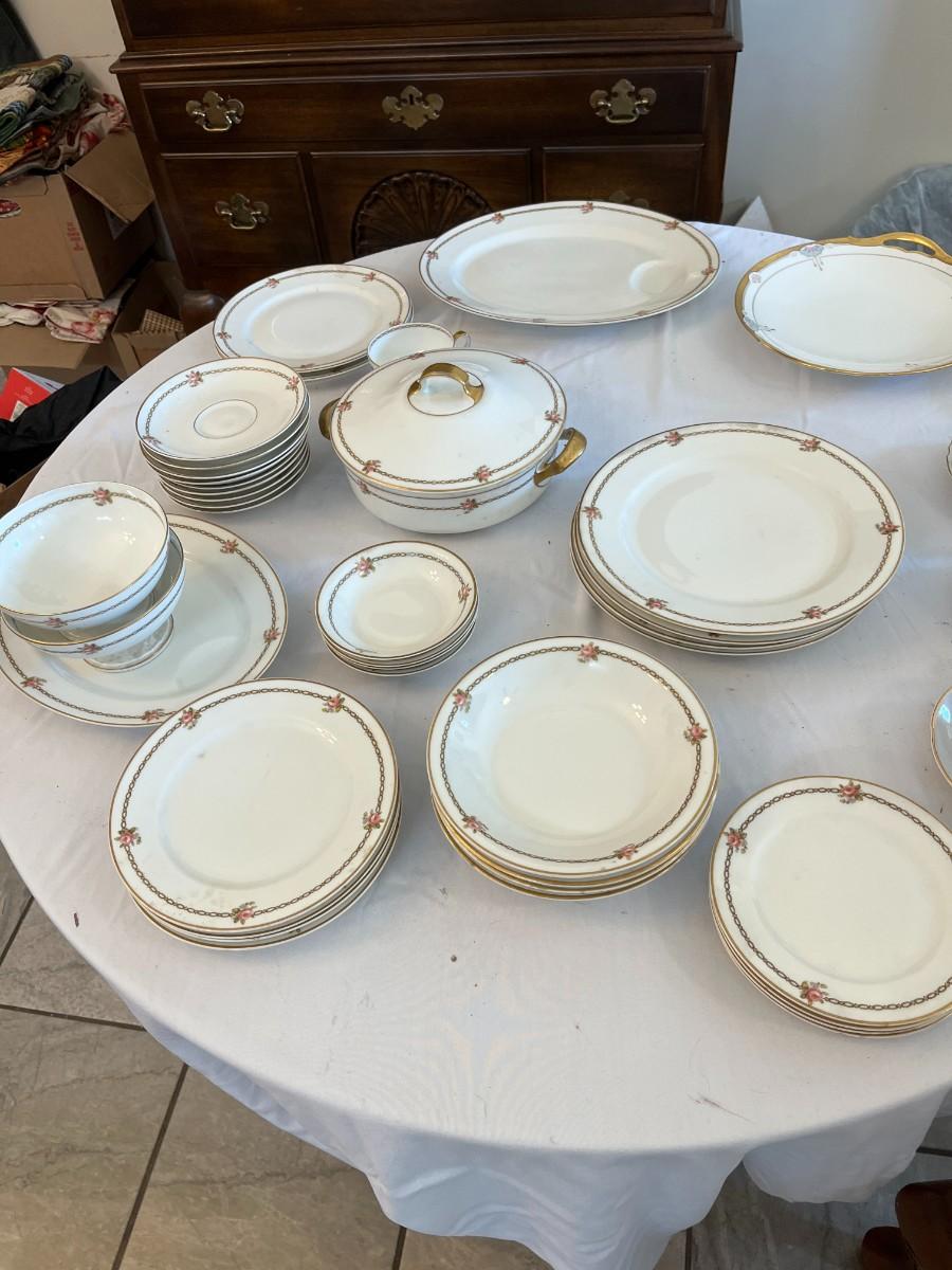 Theodore Haviland The Hanoi China Set Made In France Includes: 1 Serving Platter, 1 Covered Casserole Dish, 1 Coffee cup, 2 Footed Serving Bowls, 2 Salad Plates, 4 Bread Plates, 1 Small Serving Platter, 4 Dinner Plates, 4 Soup Bowls, 4 Desert Bowls, 4 side Plates, 4 Large Saucers, 5 Small Saucers Total of 38 Pieces