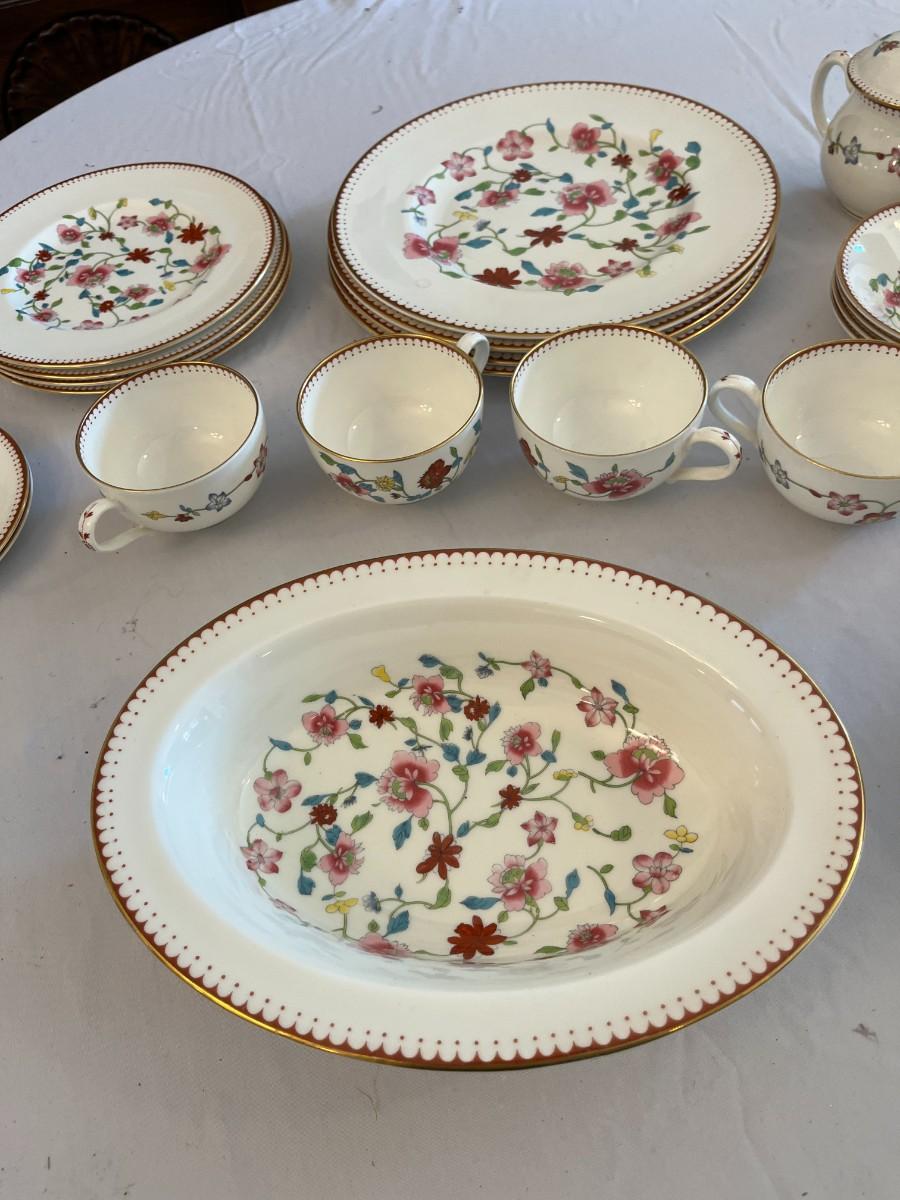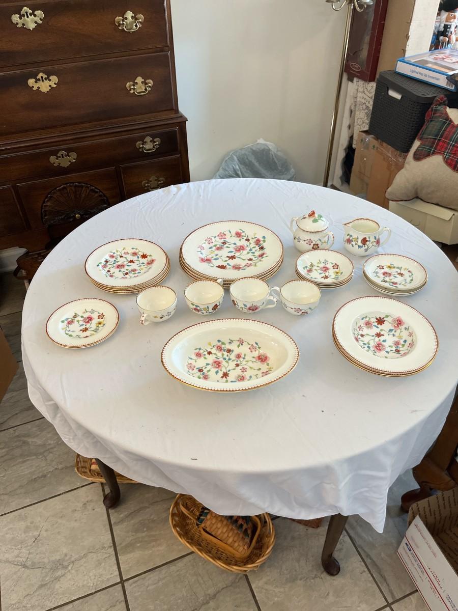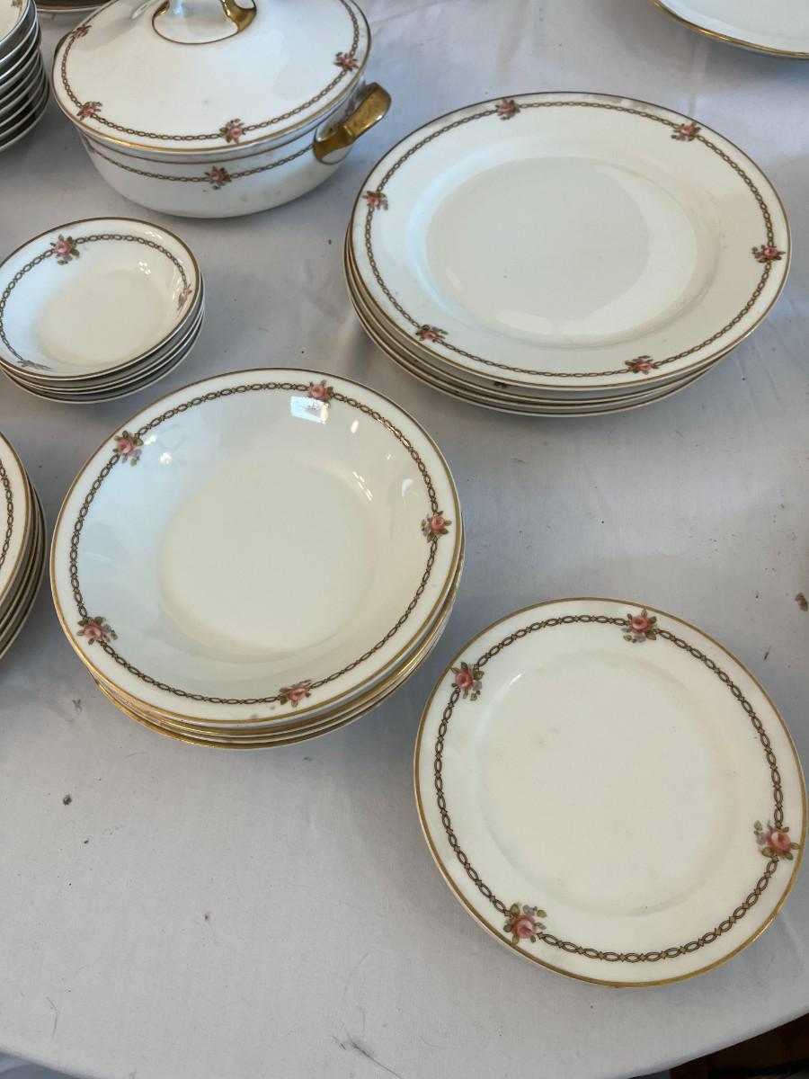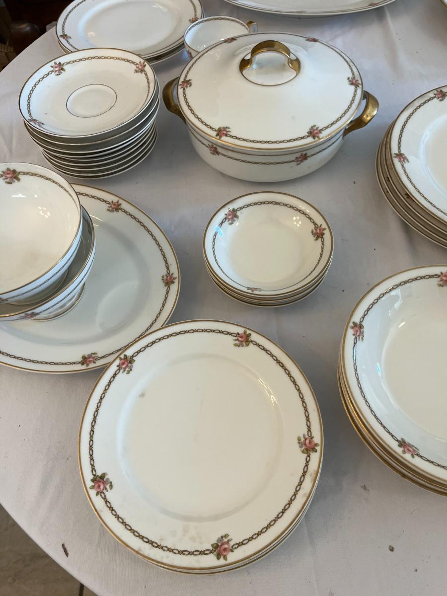 Theodore Haviland The Hanoi China Set Made In France Includes: 1 Serving Platter, 1 Covered Casserole Dish, 1 Coffee cup, 2 Footed Serving Bowls, 2 Salad Plates, 4 Bread Plates, 1 Small Serving Platter, 4 Dinner Plates, 4 Soup Bowls, 4 Desert Bowls, 4 side Plates, 4 Large Saucers, 5 Small Saucers Total of 38 Pieces