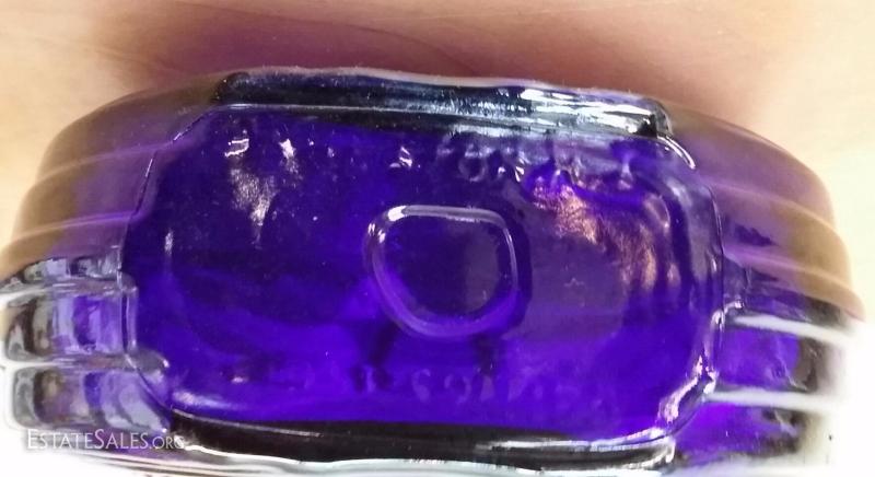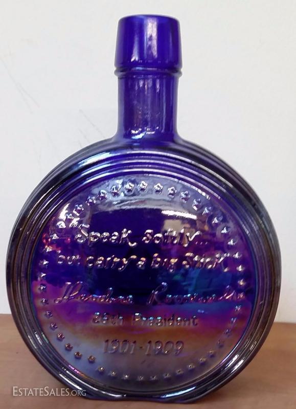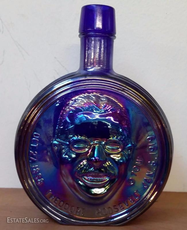 From the Series 1970's Teddy Roosevelt Limited First Edition Commemorative Decanter. 8.25 inch Blue iridescent bottle made by Wheaton Nuline, NJ Bottle