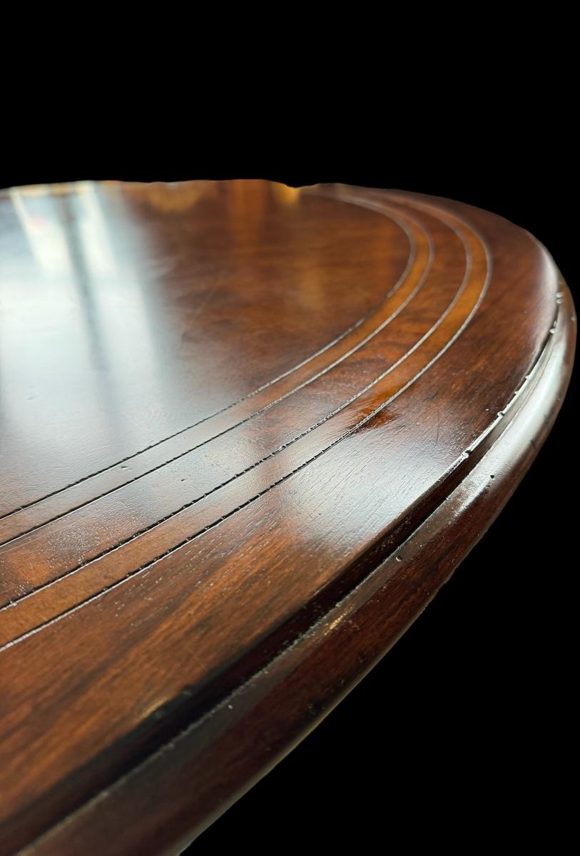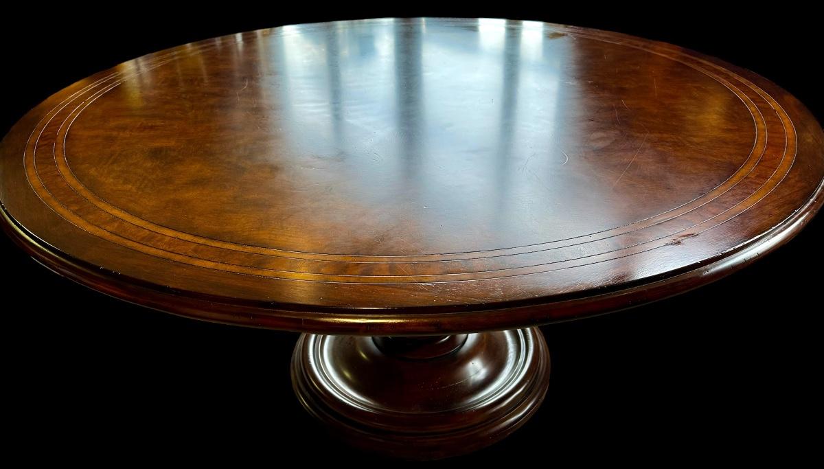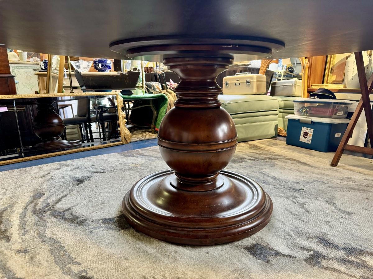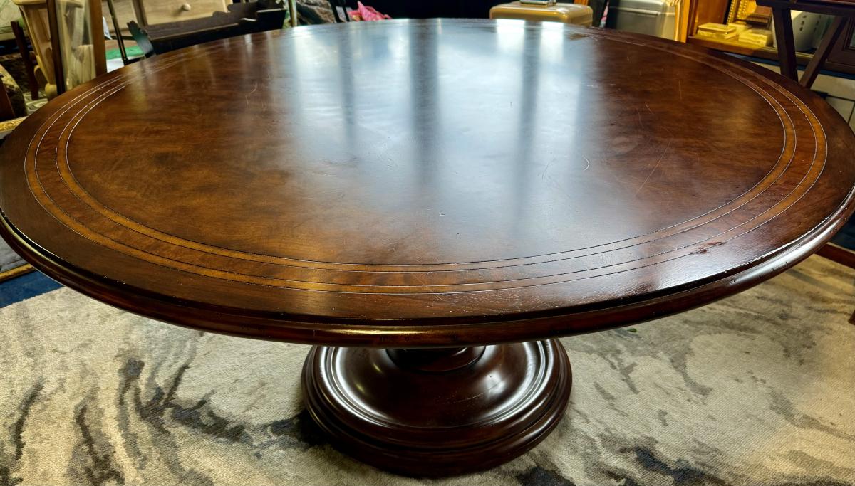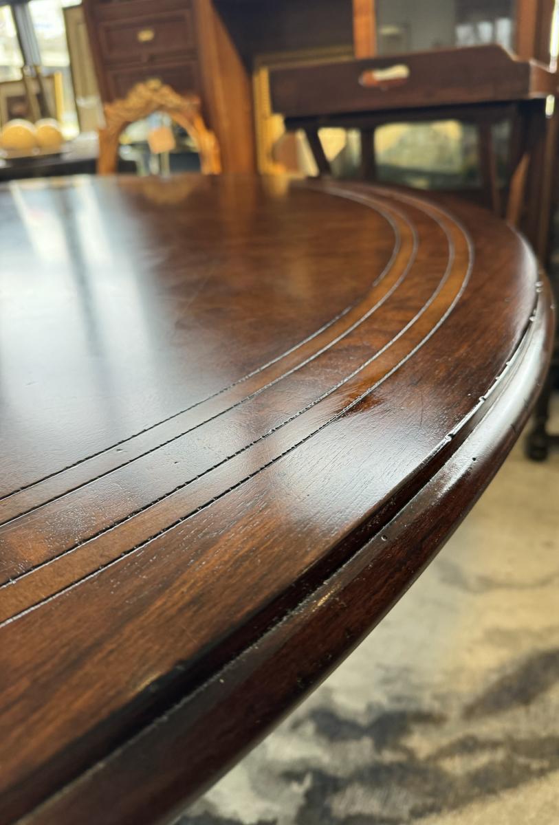 Inspired by a 1930’s French Art Deco original, this Theodore Alexander Mahogany Cerejeira dining table is craftsmanship at its finest. The table with circular crossband and a moulded edge top will comfortably seat 6 people for great entertaining meals. The table also has a sphere and collar column with a turned/ dished base.
