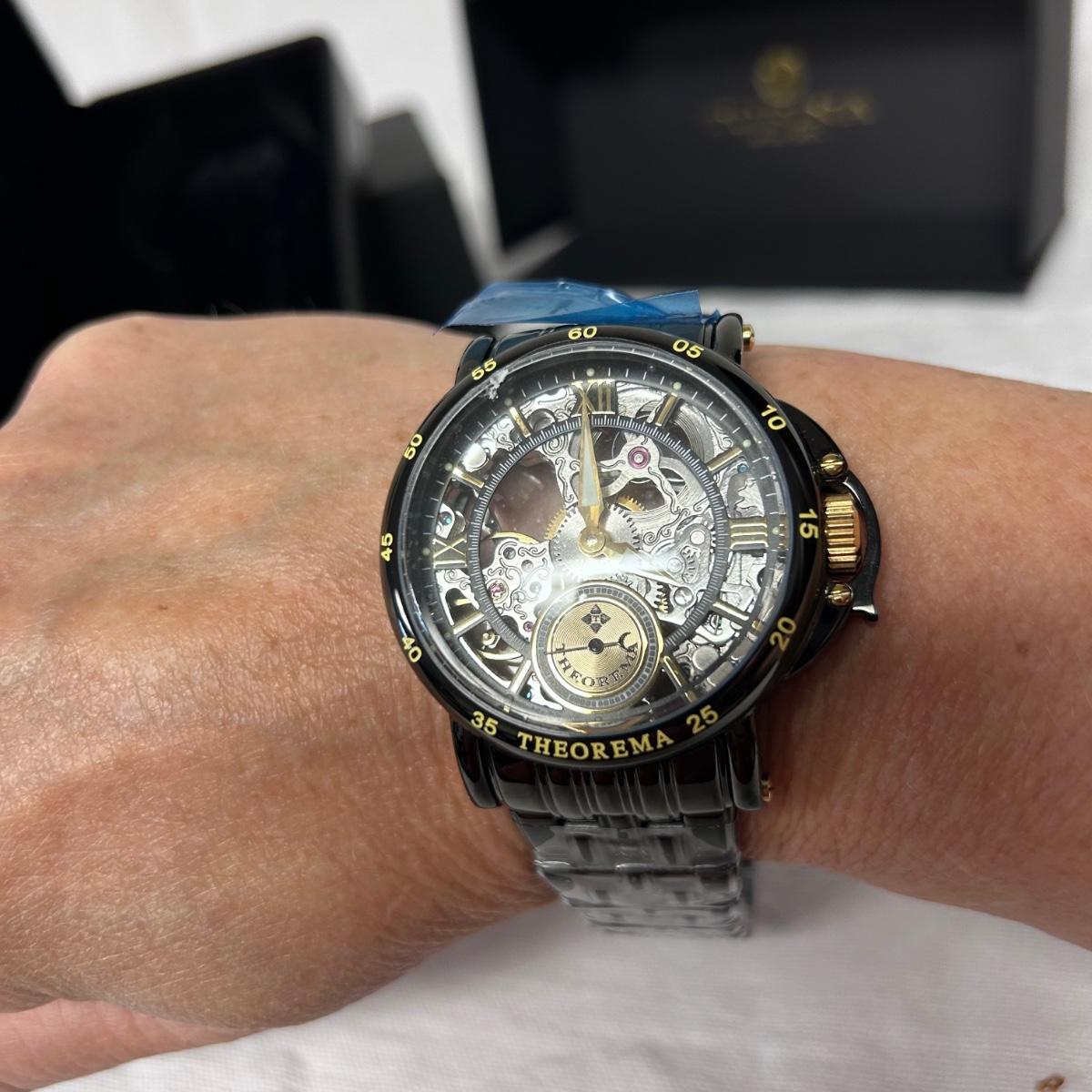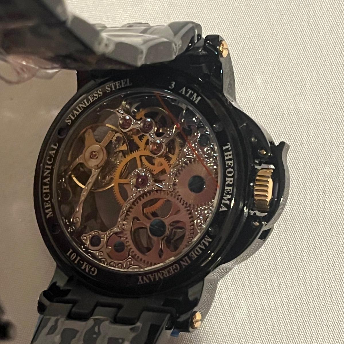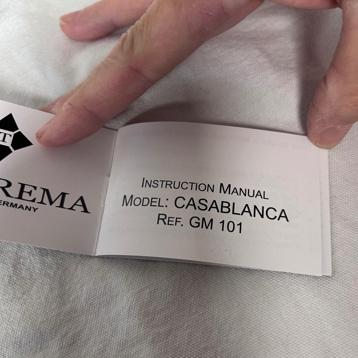 German made Theorema Casablanca model men’s watch. Piece appears new and never worn as plastic coating still on band. Original box, user manual both included. Did not attempt to wind. Box measures 7” x 4” x 2.25”. It’s a heavy piece. Shipping available. All sales are final. No returns or refunds. Please bid accordingly.