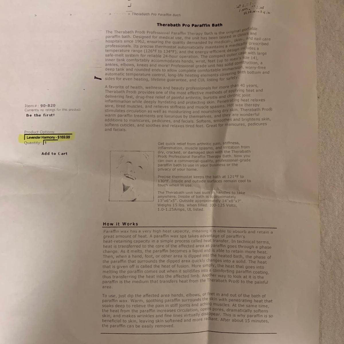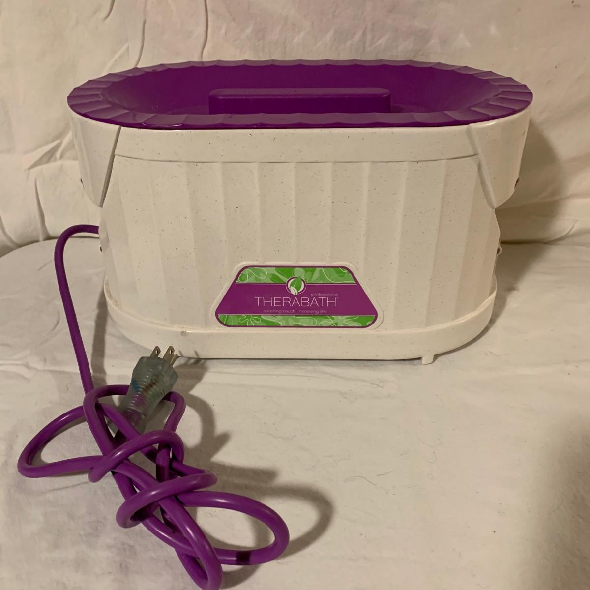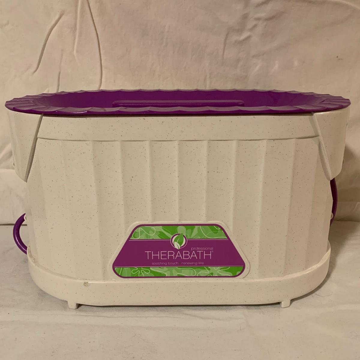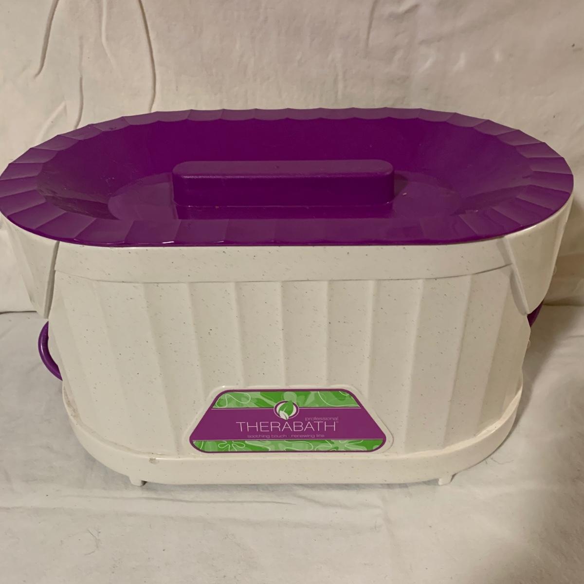 Therabath professional grade parafin bath with gloves, Lavender Harmony wax, and original user manuals. Contents inside unit appears to be paraffin wax, however we are unable to confirm. Unit measures approximately, 14.5” x 8.25” x 8.25”H a powers on when plugging in. Please see photos for more details. Shipping available. Shipping can be costly. We suggest contacting our preferred local shipping provider, Postage Express, with dimensions and getting an estimate before bidding: (828) 670-5501 or postageexpress@yahoo.com.