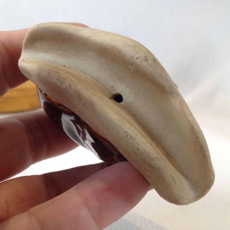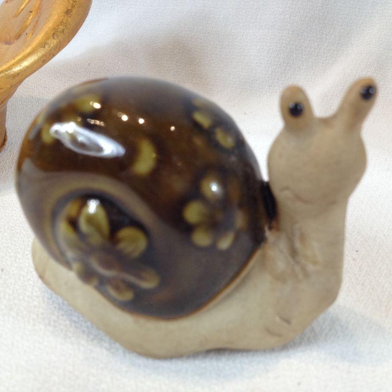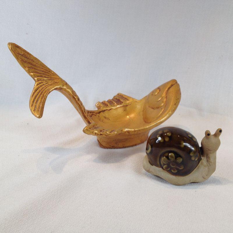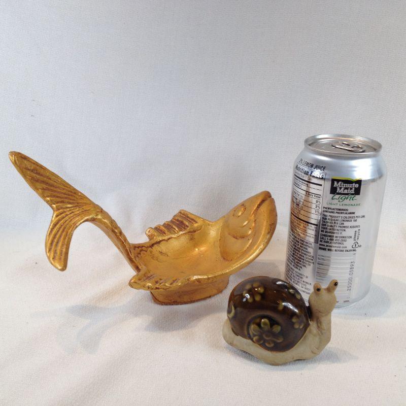 This little pairing is of a California Pottery Fish Bowl which measures 8-inches long X 5-inches tall and a pot rim Snail. The snail is curved and grooved to fit onto a planter's edge. So cool. Both are in very good condition.