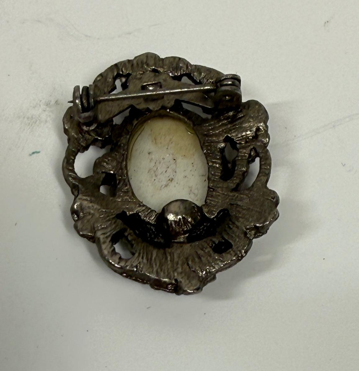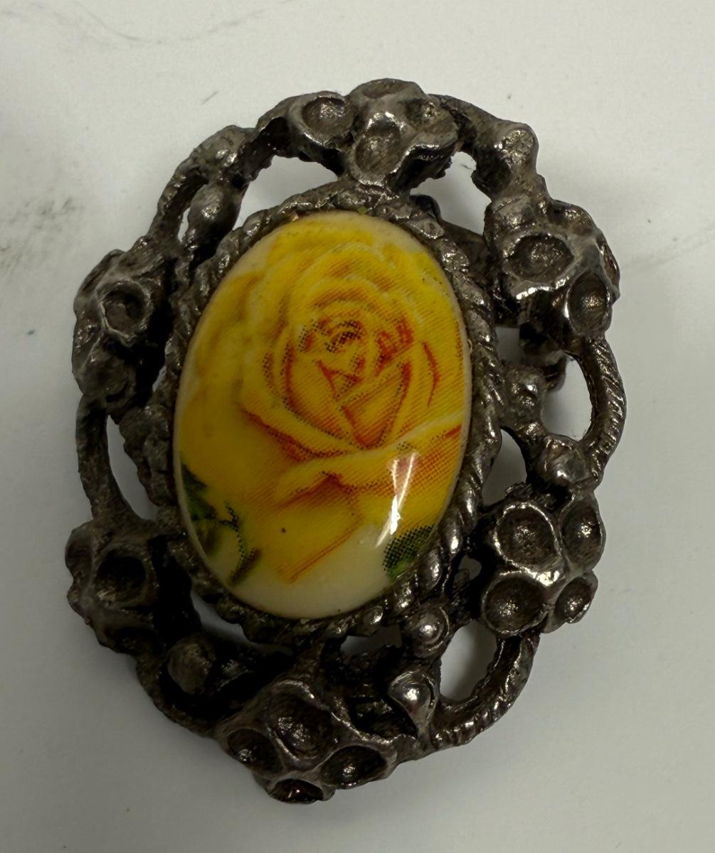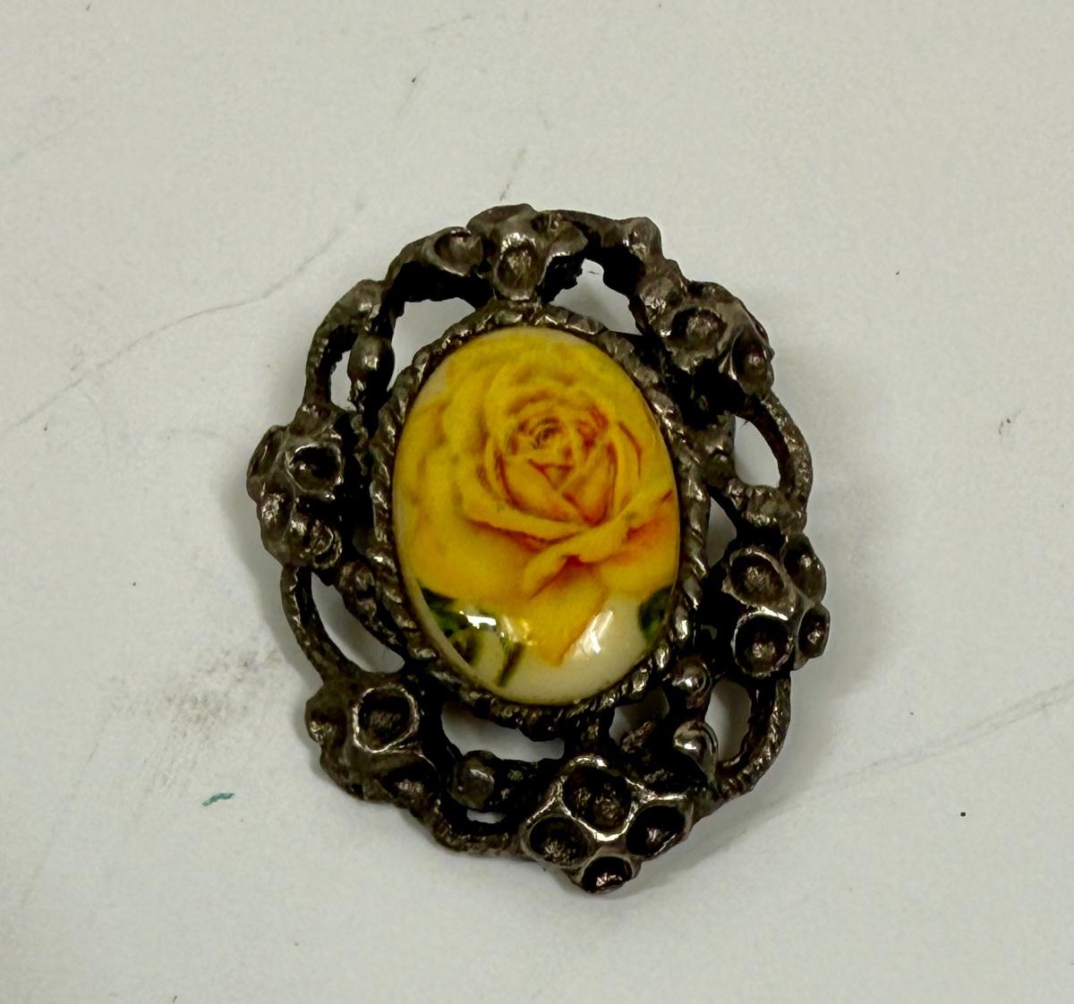 Vintage Brooch Pin - Yellow Rose Cameo inside an Ornate Metal Ring