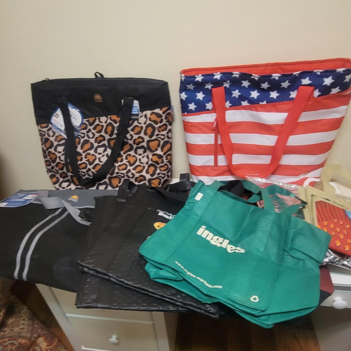 4 thermal totes that hold up to 56 12oz cans, 3 are unused. 7 reusable grocery bags. 3 are thermal, 4 are cloth. Minimal use. Local pickup only