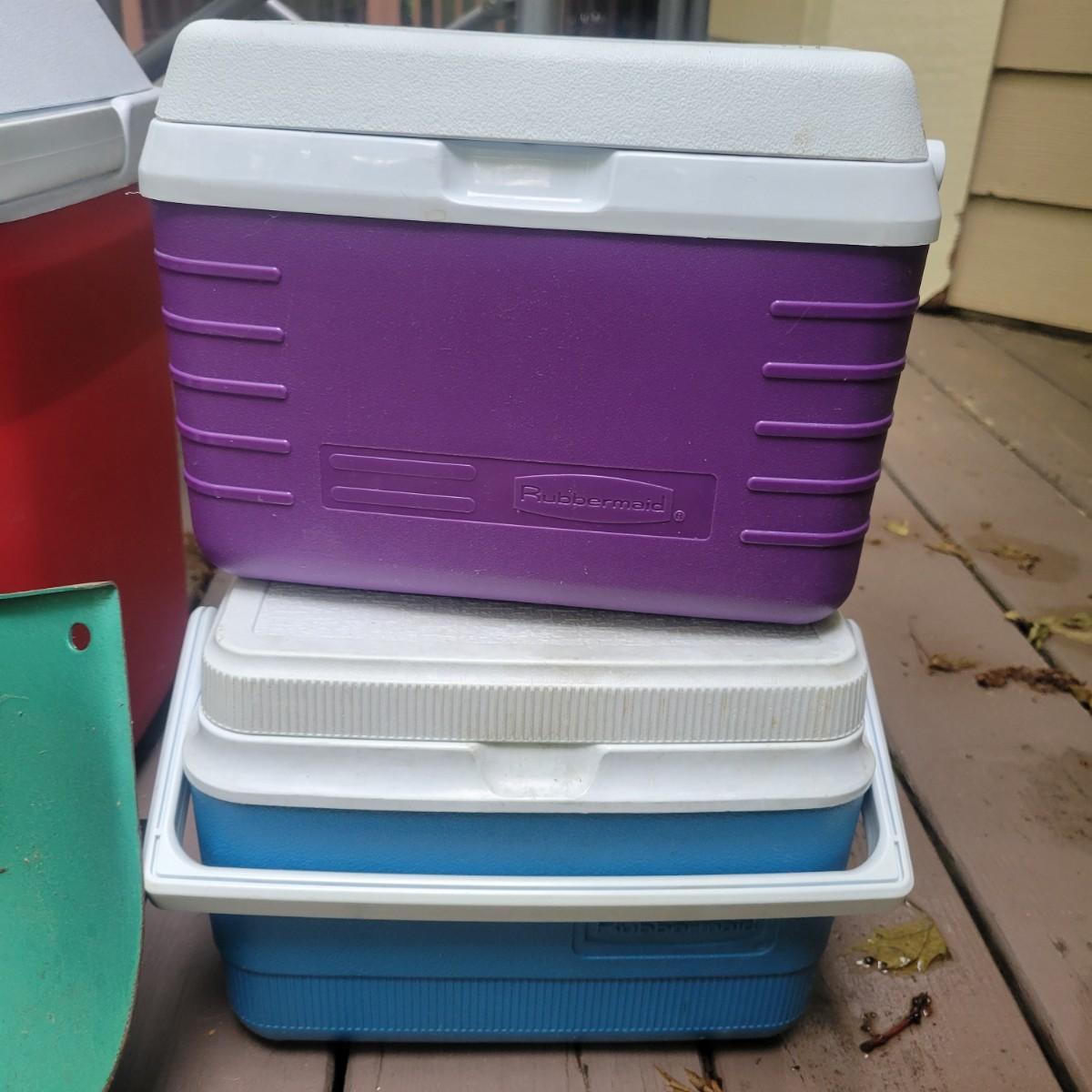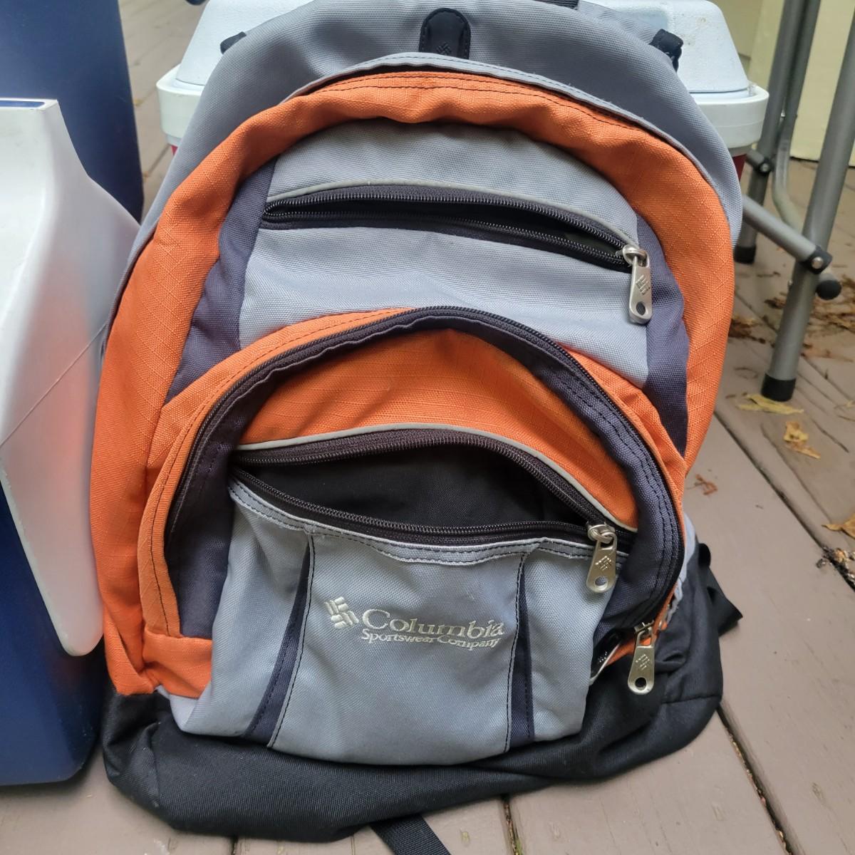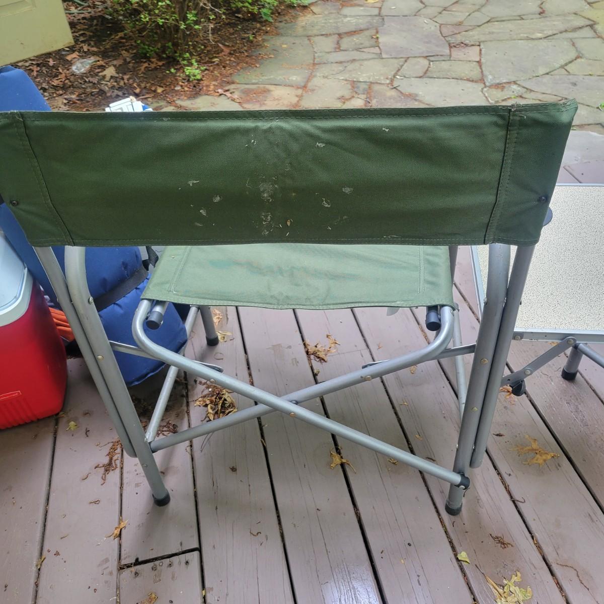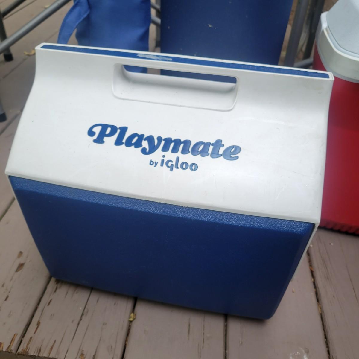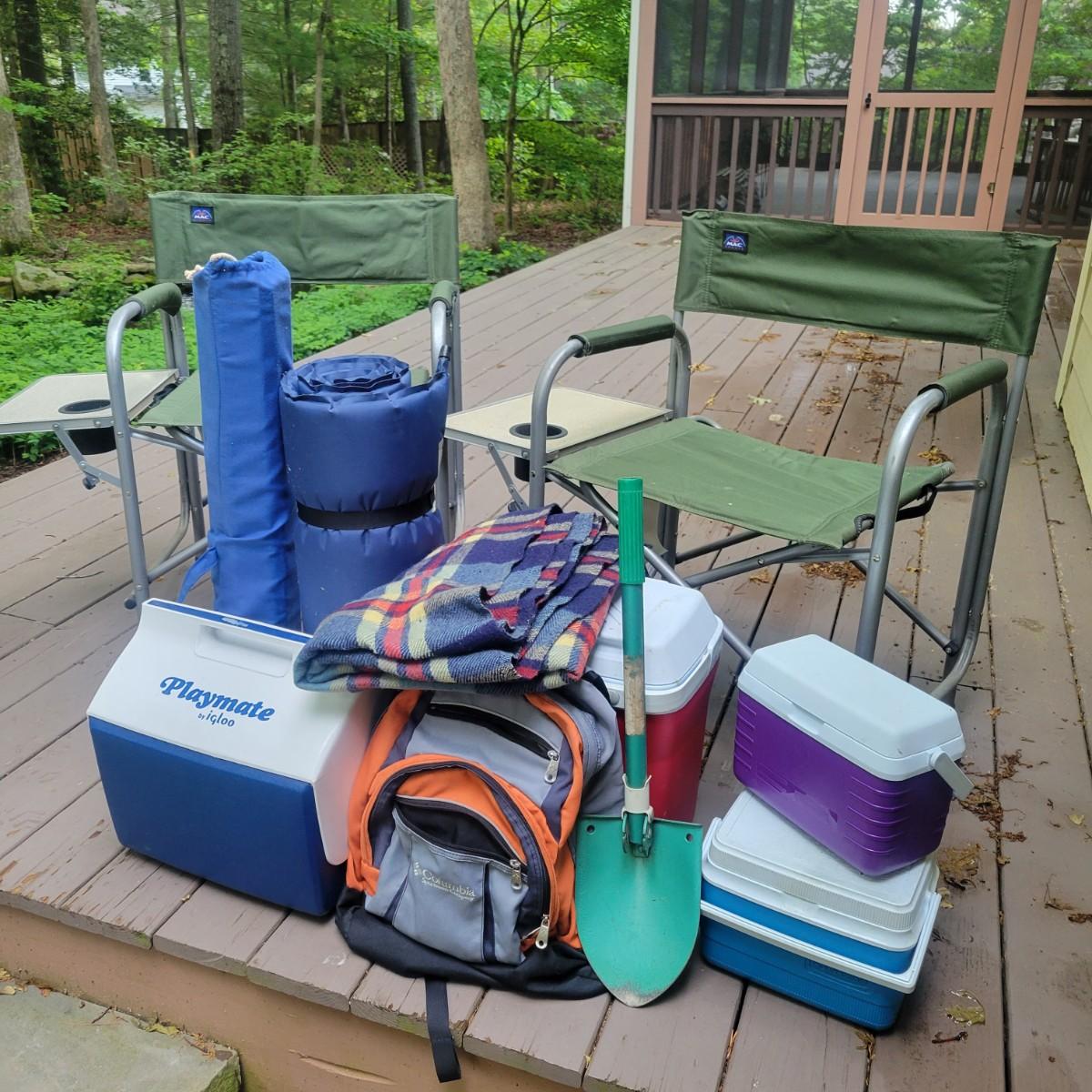 An assortment of camping gear that includes four coolers of different sizes, a Columbia backpack, a folding shovel, and a Therma-Rest inflatable mattress. This lot also includes two folding camp chairs with side tables that measure approximately 32" x 19" x 31.5"H with a seat height of 18". A folding wooden slats table also comes with this that measures approximately 30" x 30" x 15"H. Local pickup only