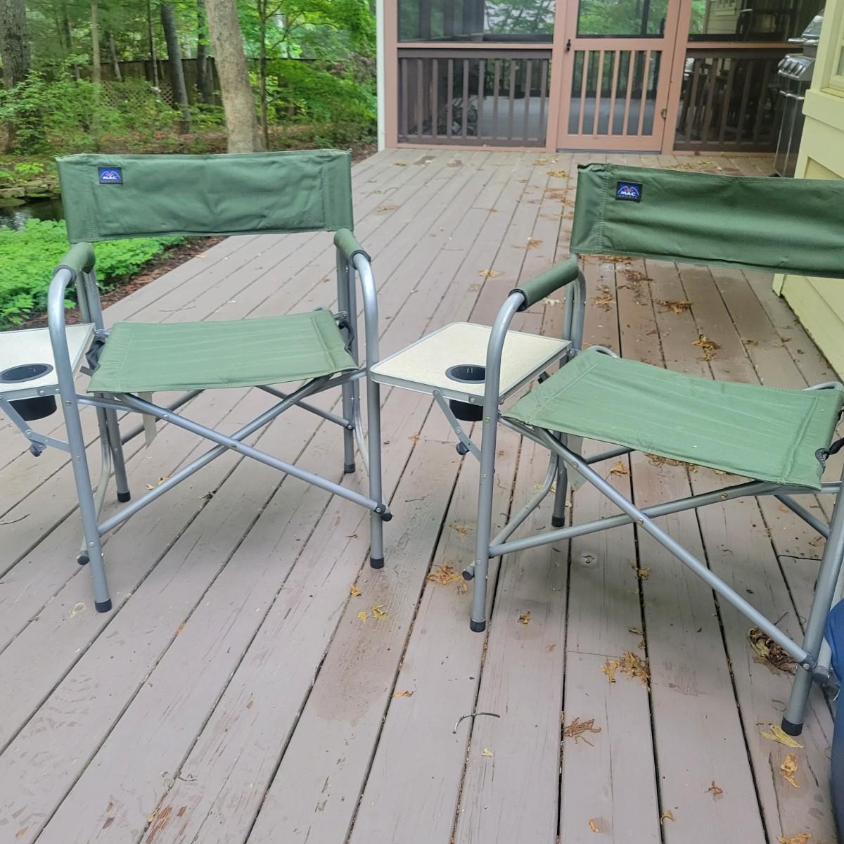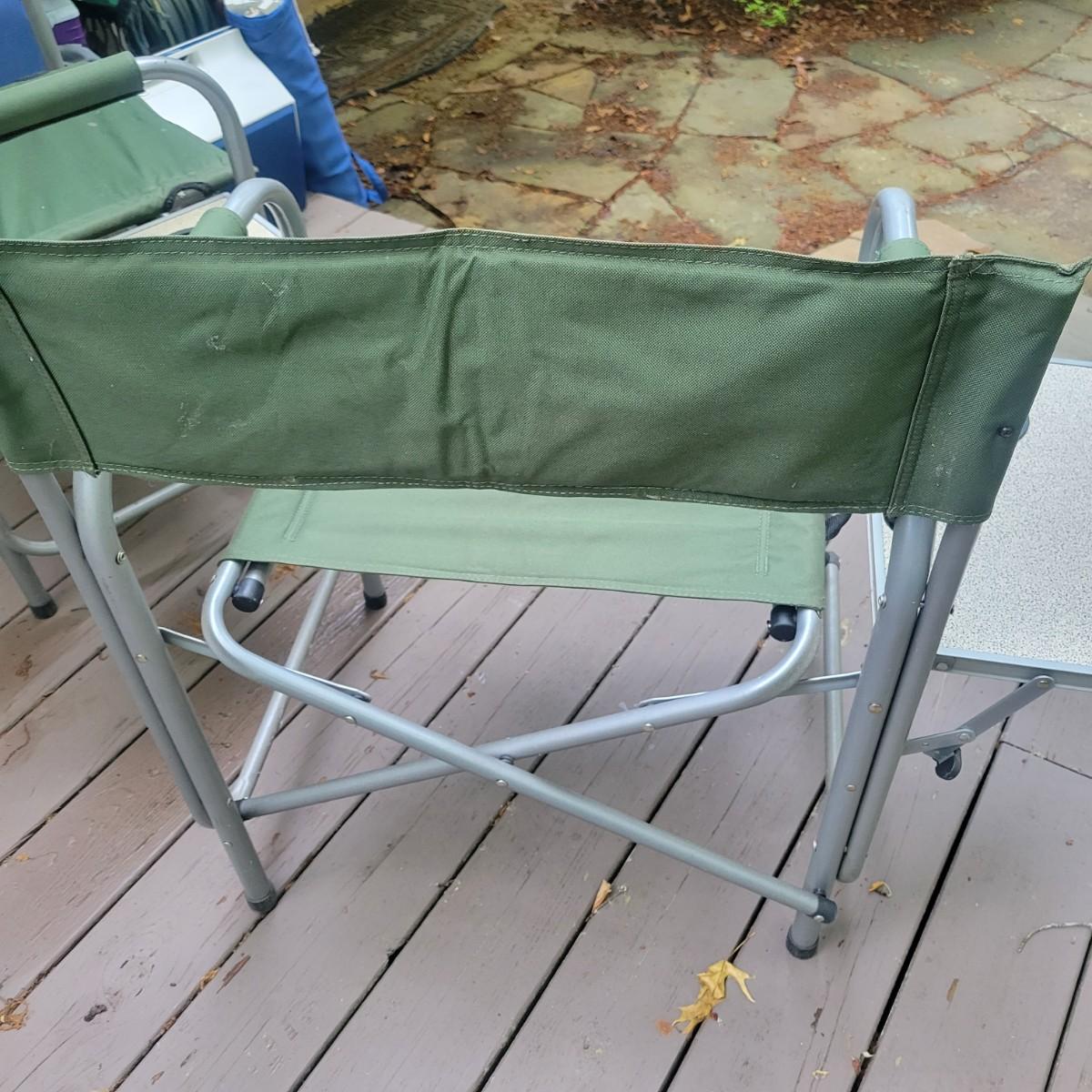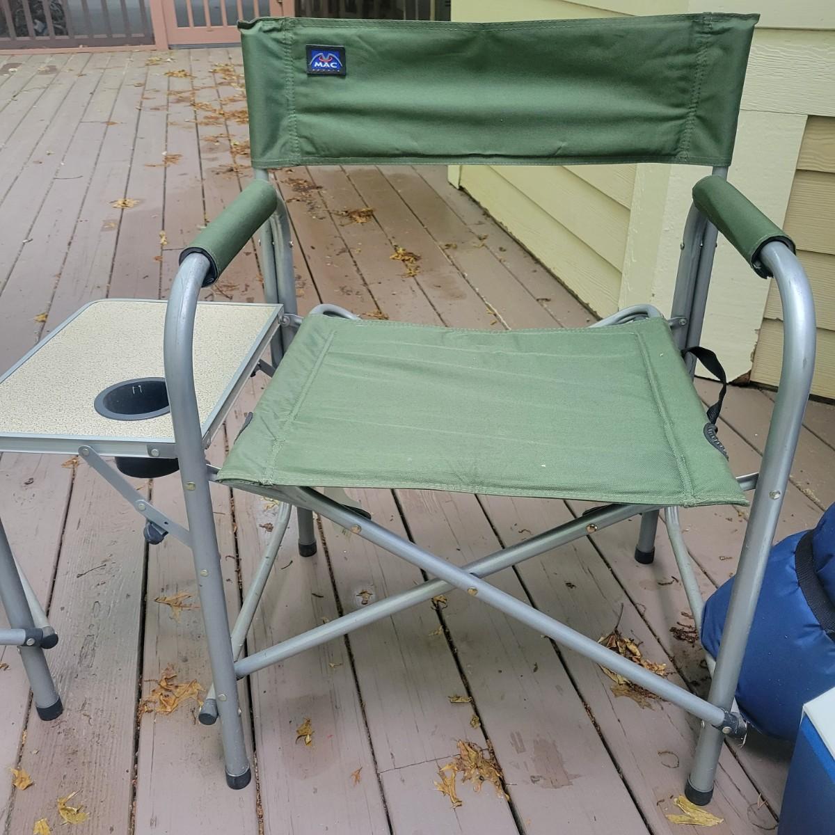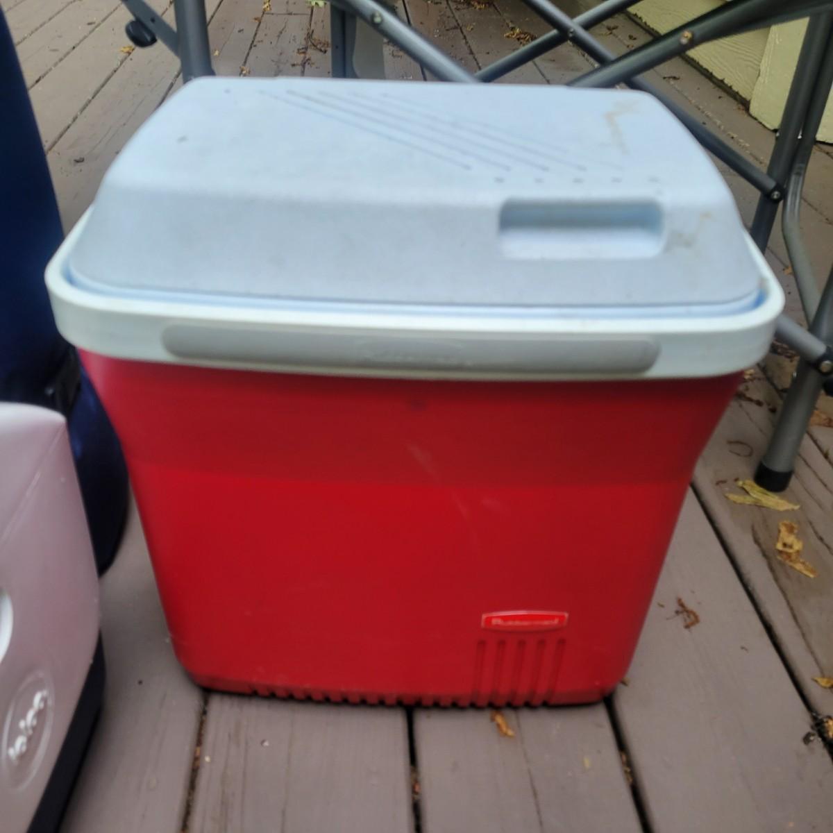 An assortment of camping gear that includes four coolers of different sizes, a Columbia backpack, a folding shovel, and a Therma-Rest inflatable mattress. This lot also includes two folding camp chairs with side tables that measure approximately 32" x 19" x 31.5"H with a seat height of 18". A folding wooden slats table also comes with this that measures approximately 30" x 30" x 15"H. Local pickup only