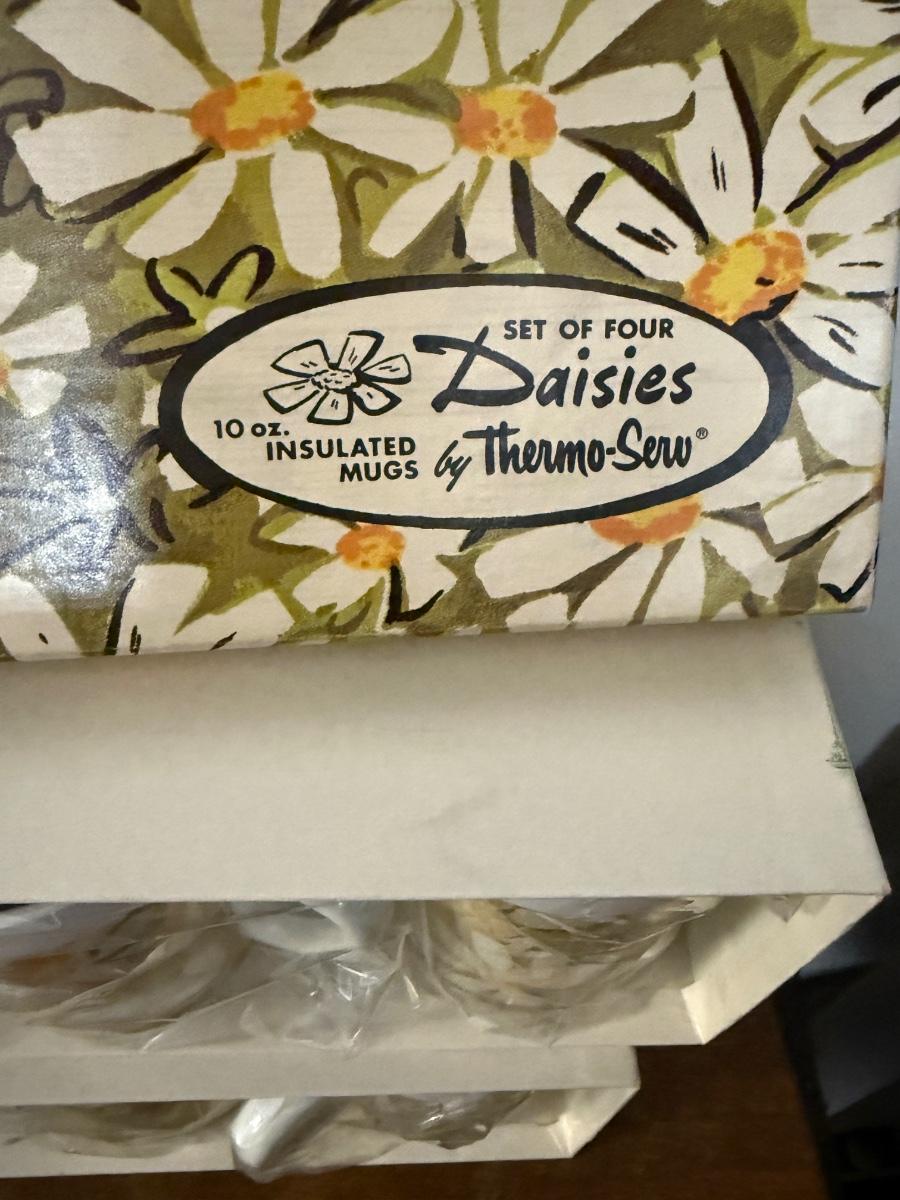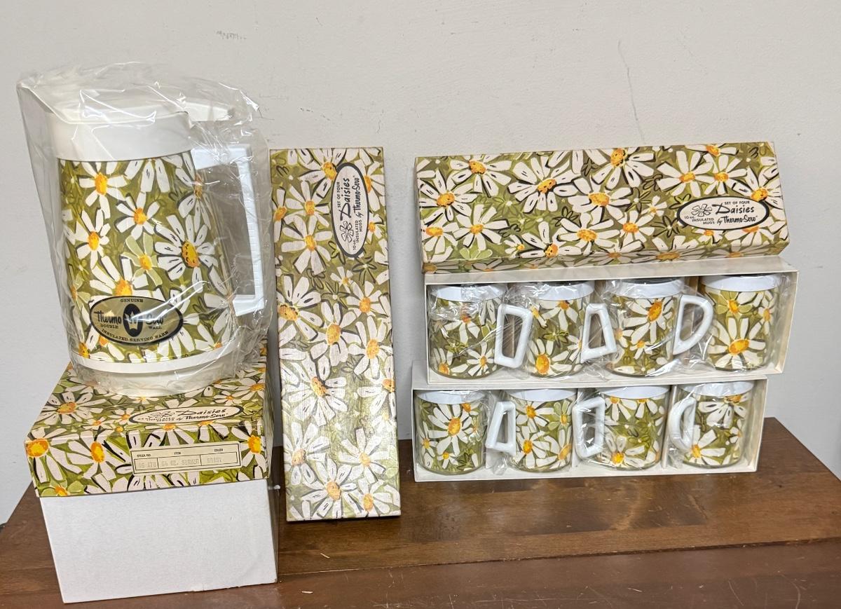 Vintage Daisies Insulated Servers by Thermo-Serv in very rare NEW condition in original boxes Pitcher & Mugs