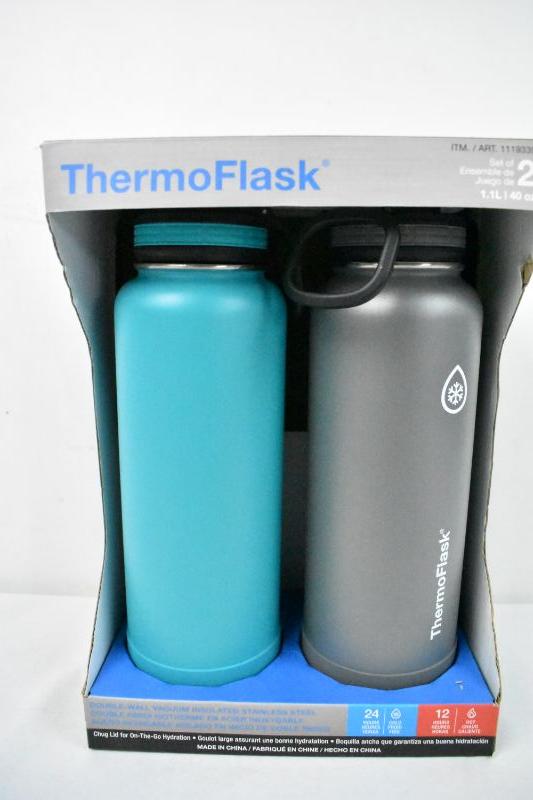 ThermoFlask 1.1 L Set of 2, Vacuum Insulated Stainless Steel, Blue/Gray - New