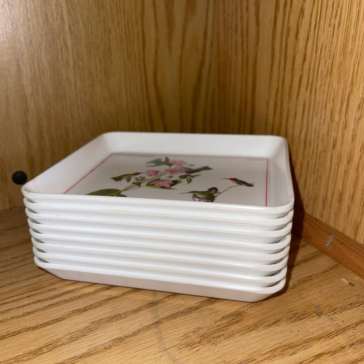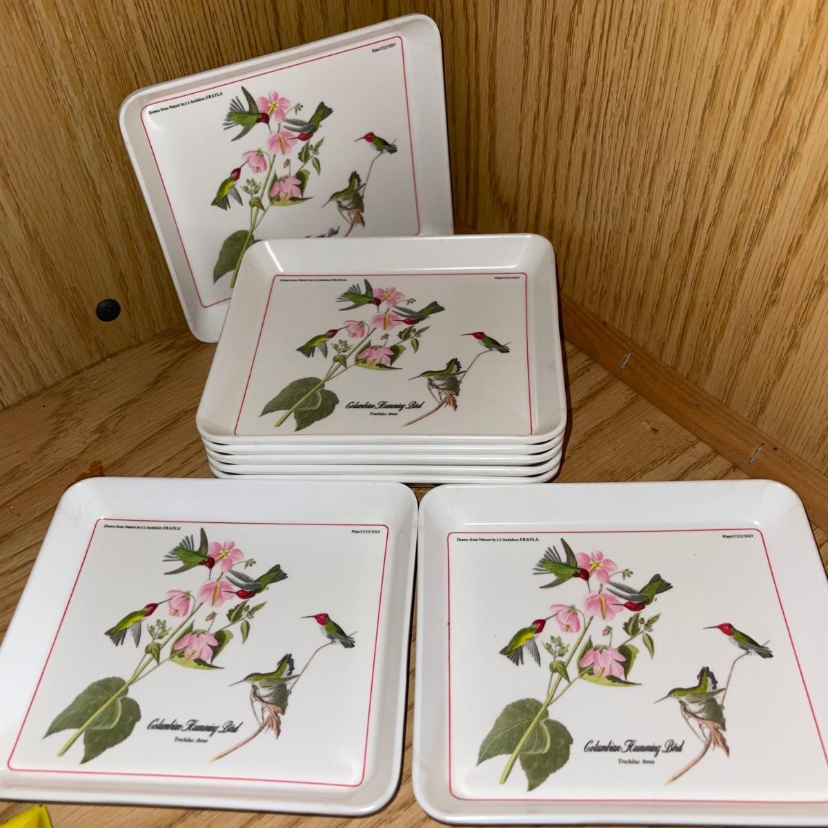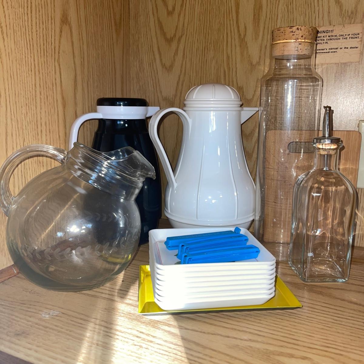 In this lot are two thermos pitchers one black (10” tall) and one white (11” tall). There is also corked cylinder glass bottle (13.5” tall), a glass oil bottle, and a round glass pitcher. There are Eight square plastic hummingbird plates (5.5”x 5”), three chip clips, a plastic yellow plate and a small wooden cutting board.
