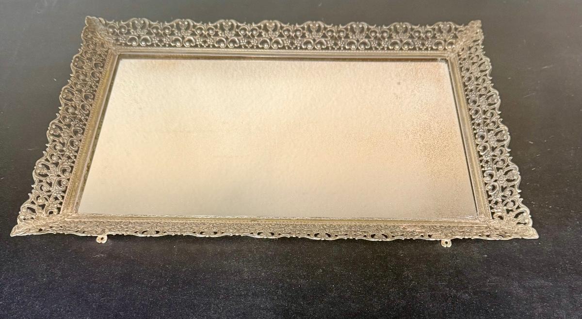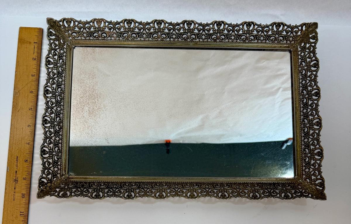 Vintage Vanity Mirror Dresser Tray Perfume Make-Up Silver-tone Metal Filigree