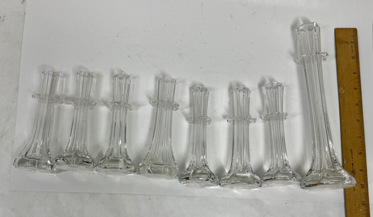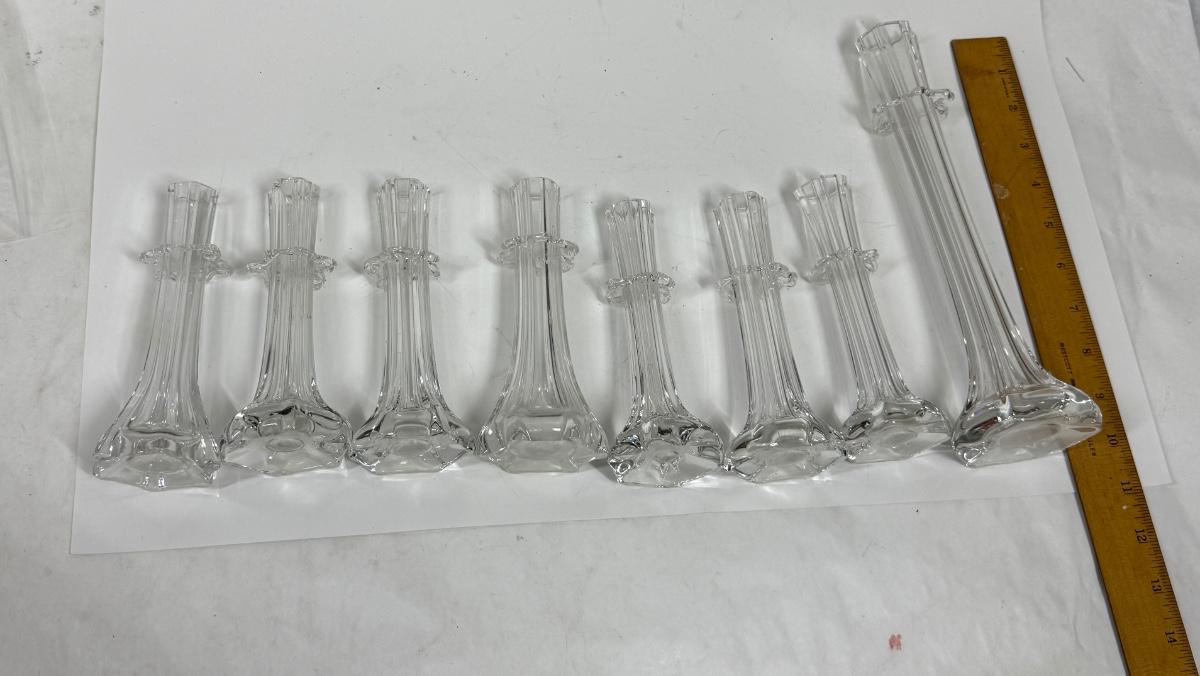 Different sizes: 7 short vases and 1 tall vase. All in good condition. See photos for sizes.