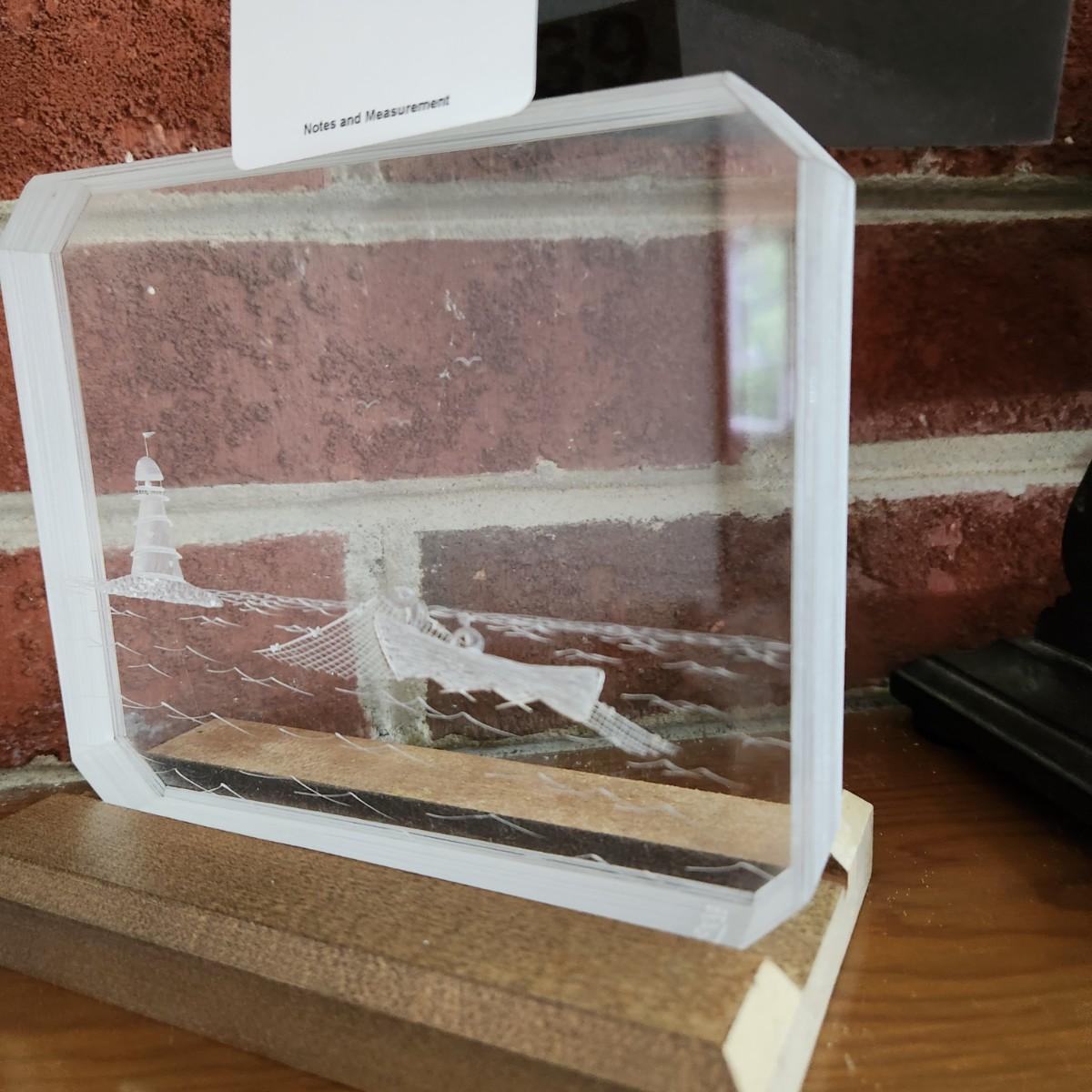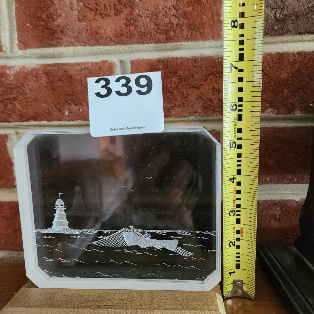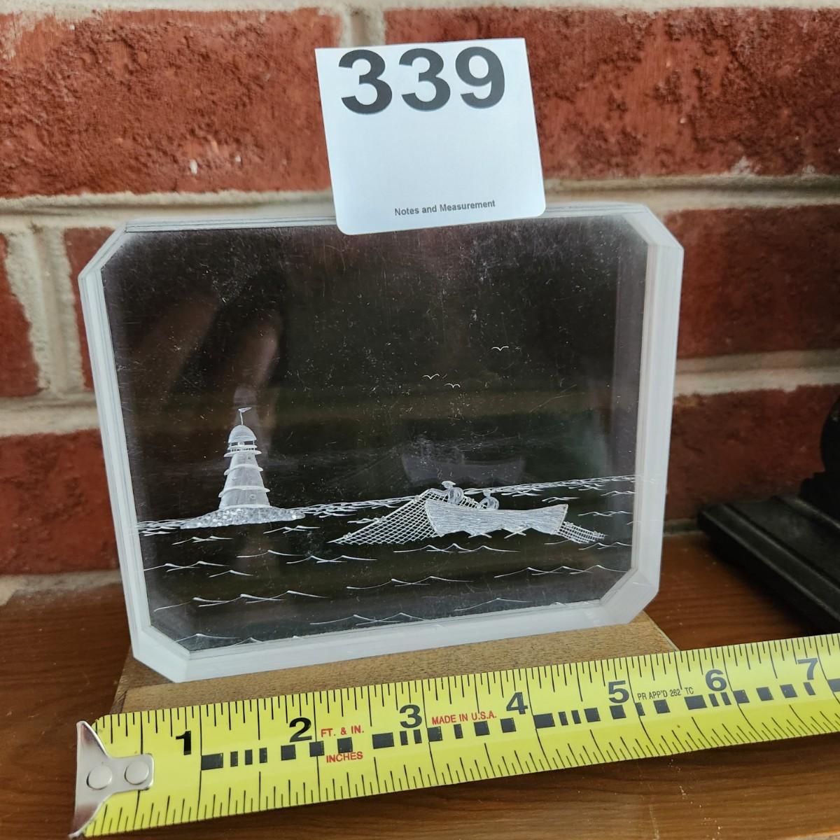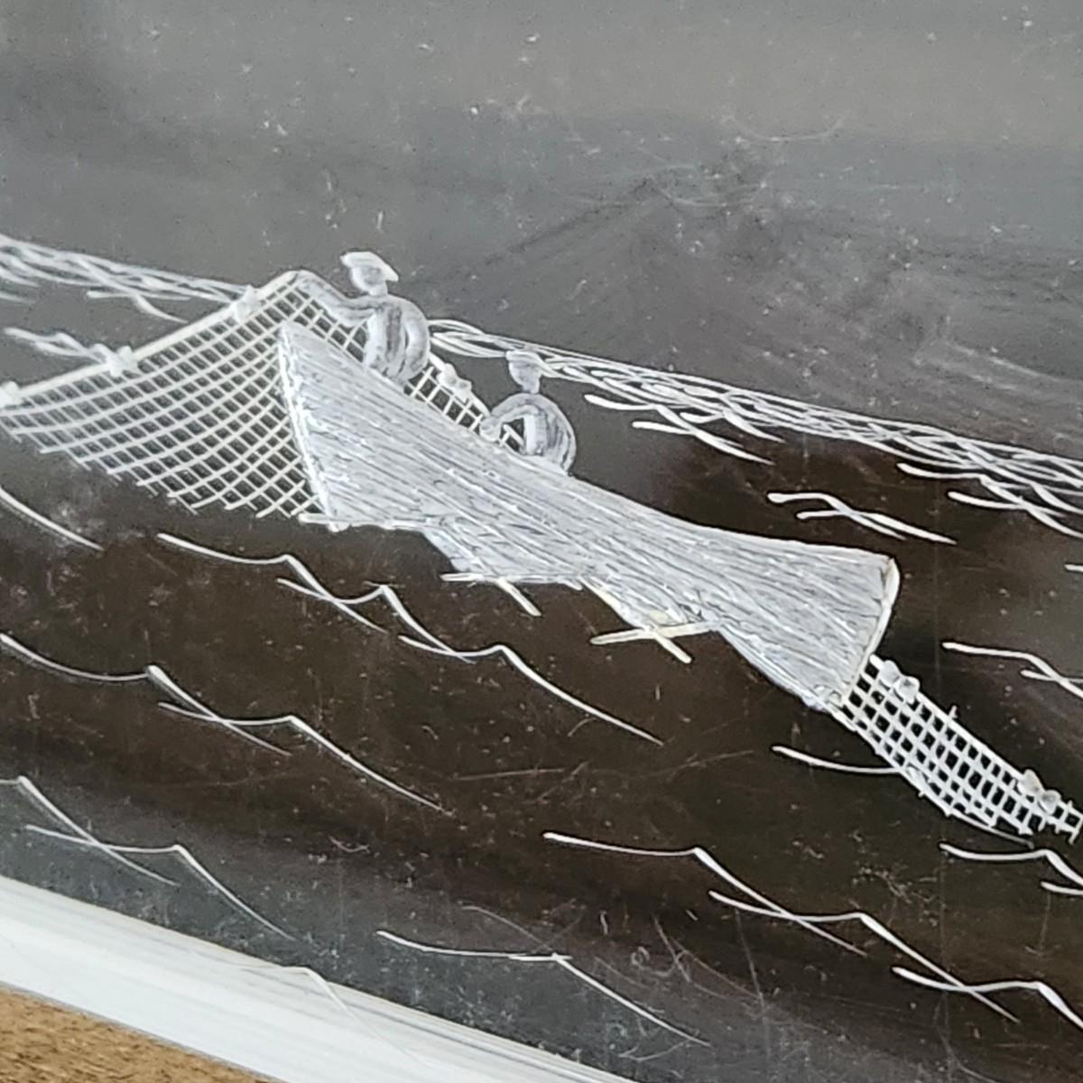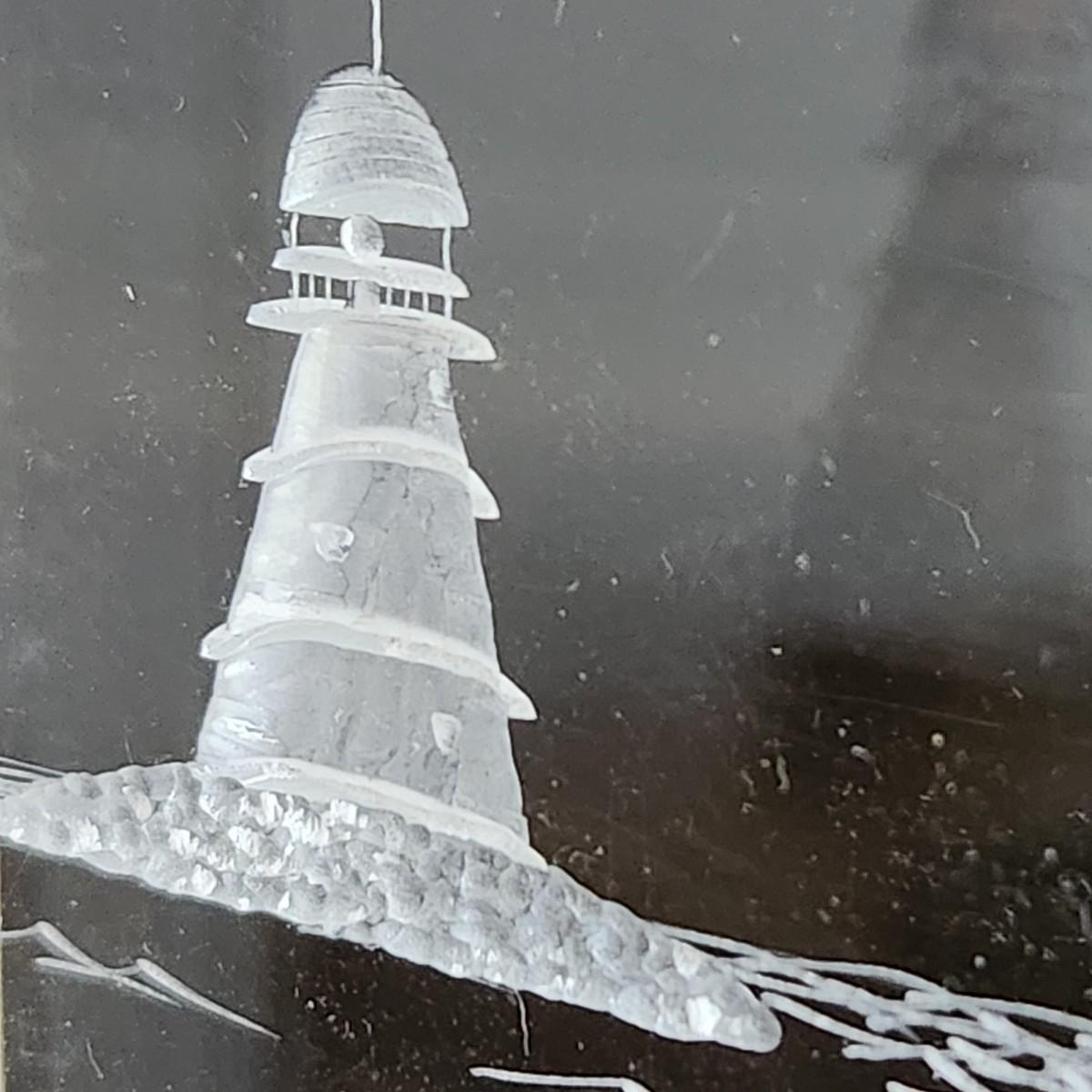 Thick Etched Glass Art Ocean Sea Lighthouse Fisherman w Boat & nets
