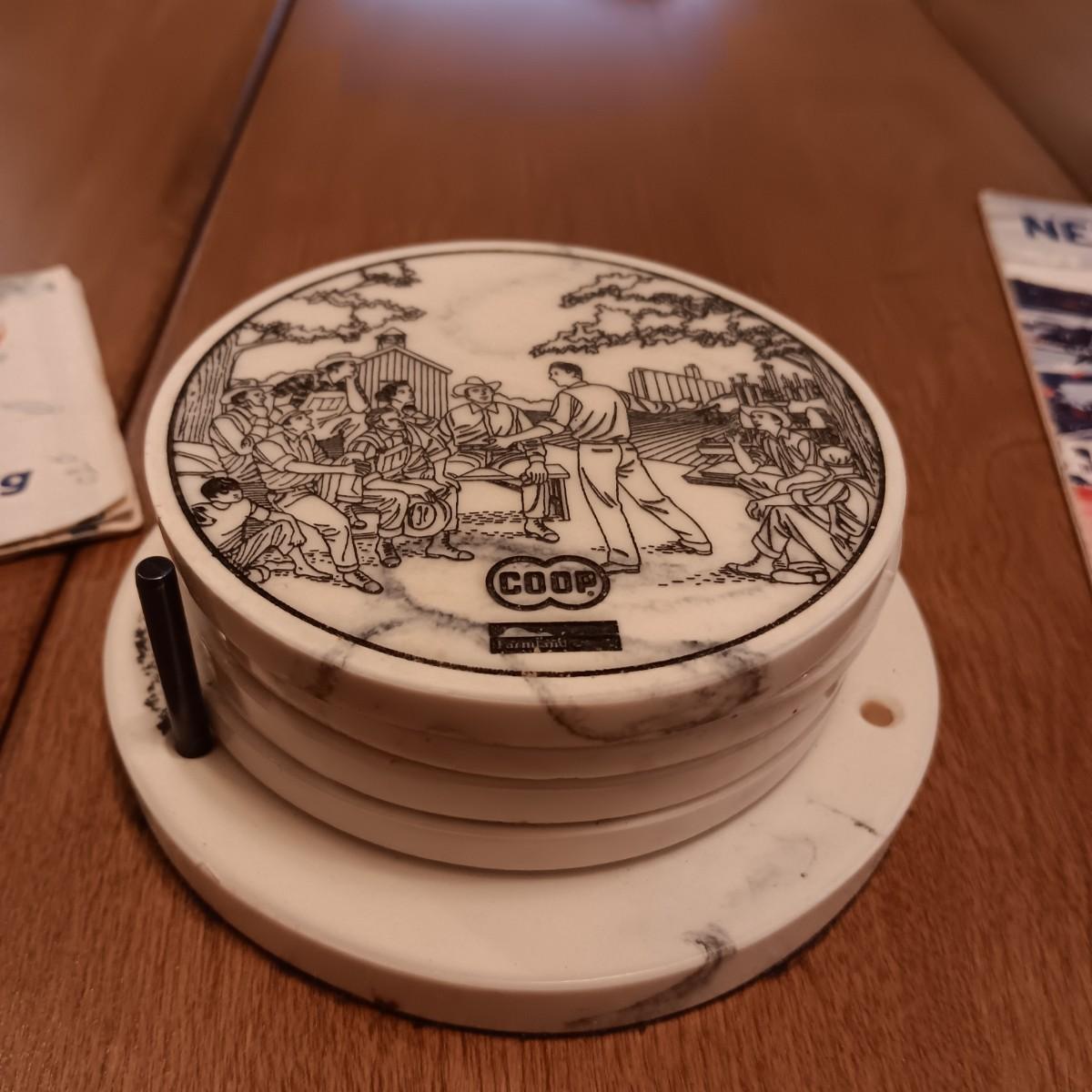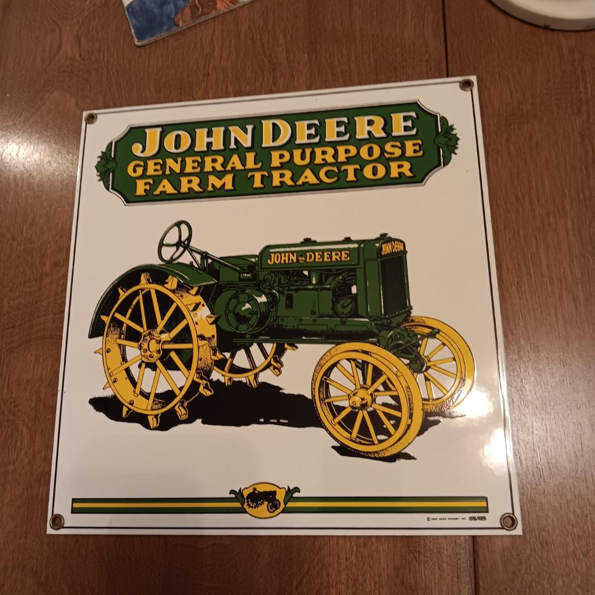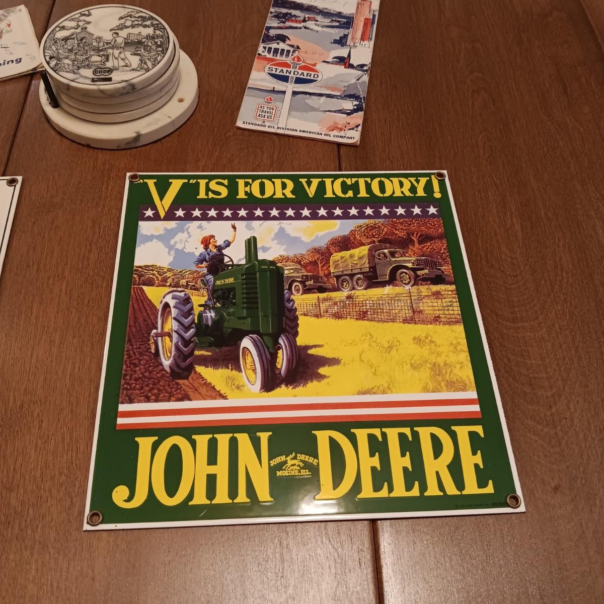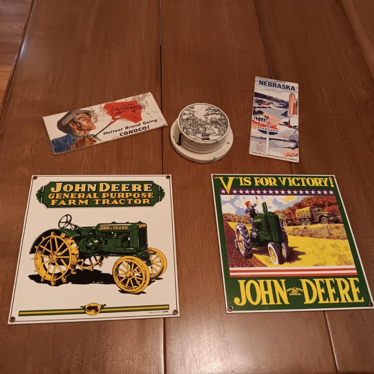 THICK METAL JOHN DEERE SIGNS, CO-OP COASTERS AND 2 VINTAGE ROAD MAPS