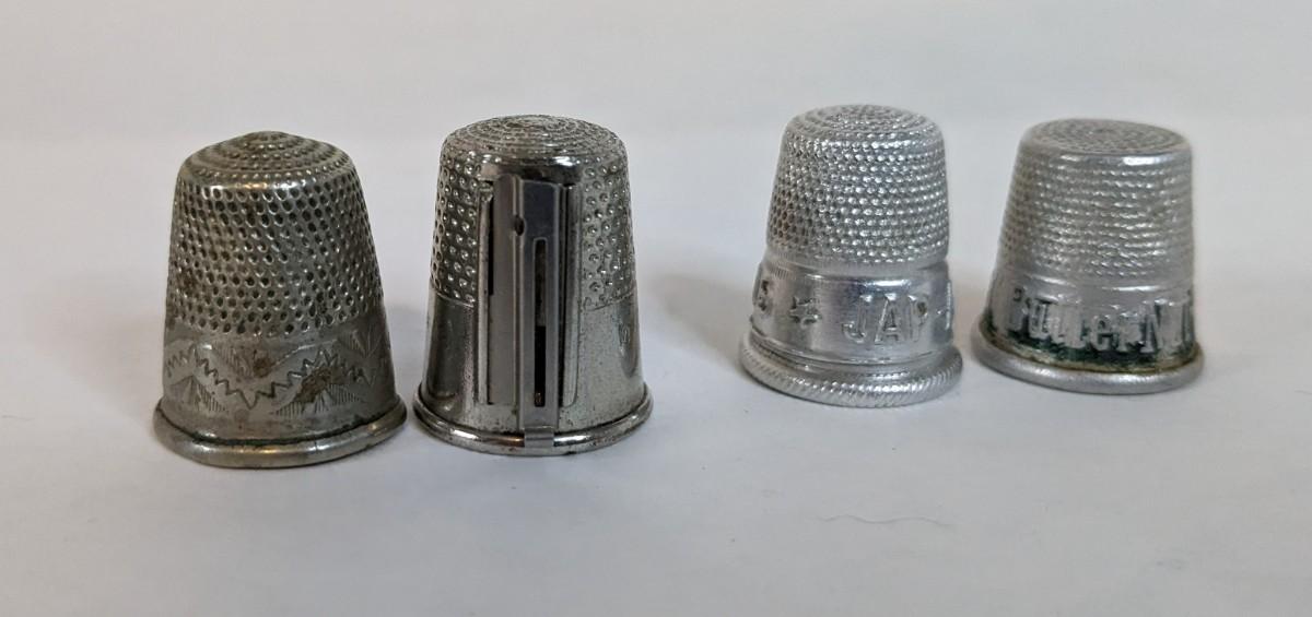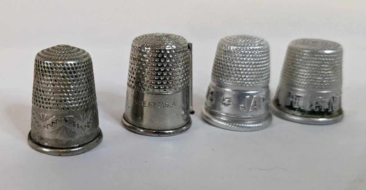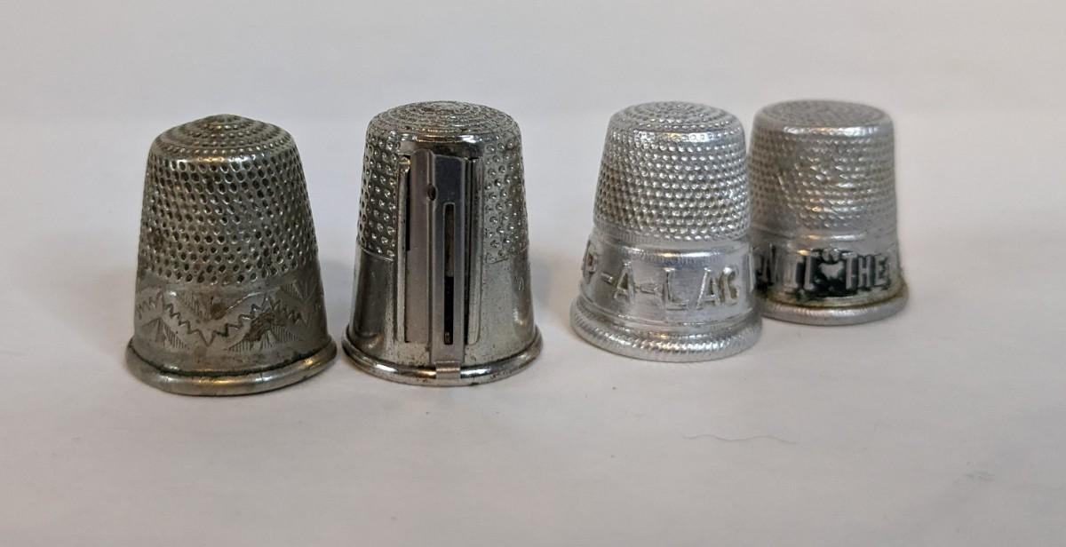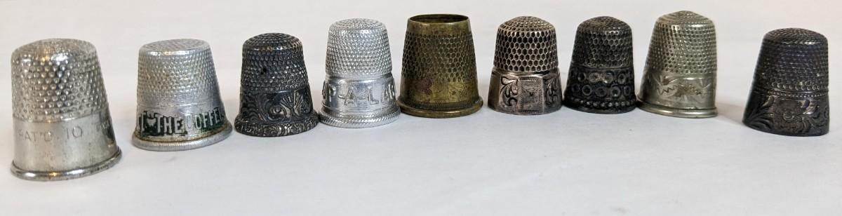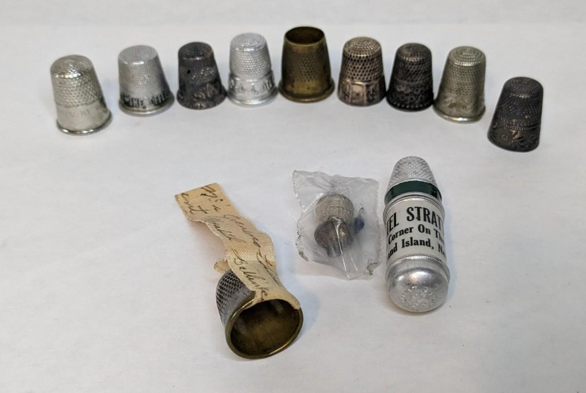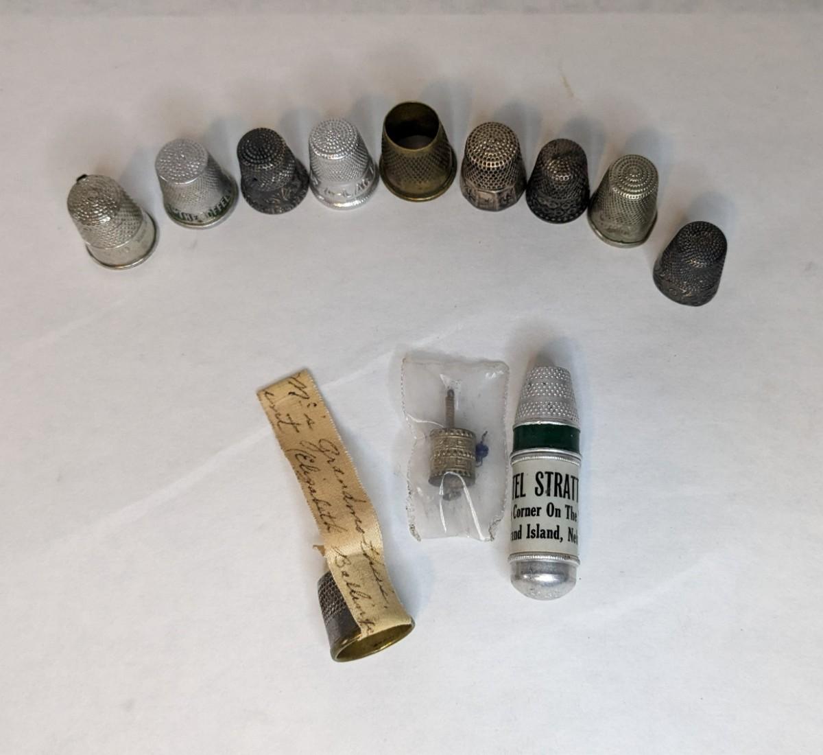 (10) thimbles, 2 of which are open top, a strange screw piece, and Hotel Stratton travelling piece. 4 are marked sterling and come in at 18.9g total weight. Also includes neat Butter-Nut promo, and 4 other stamped aluminum pieces.