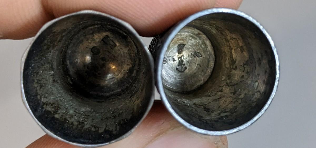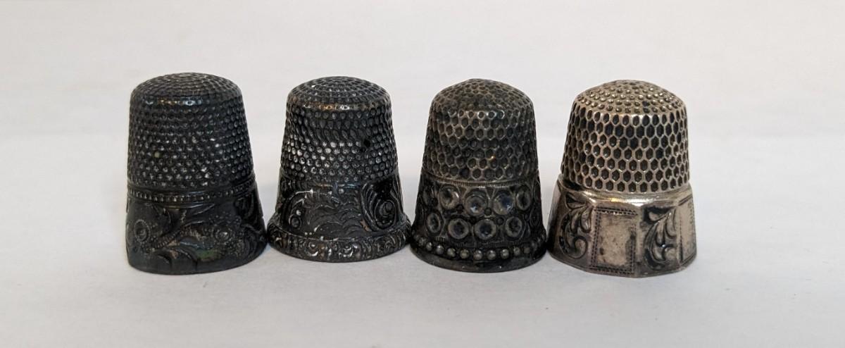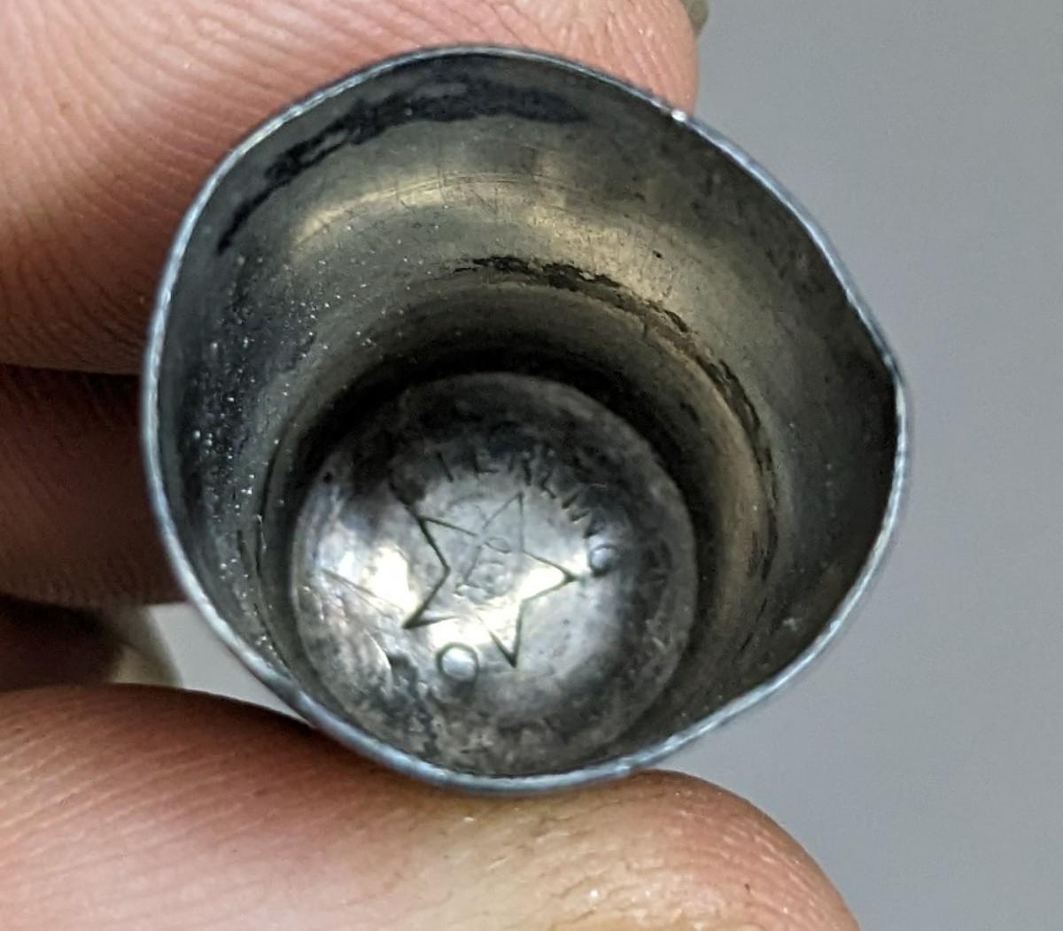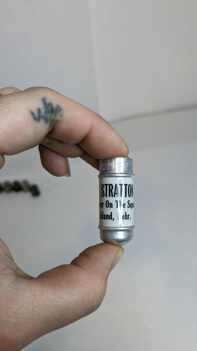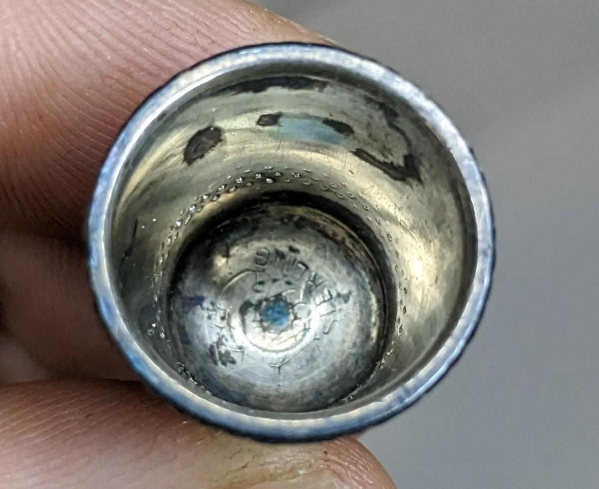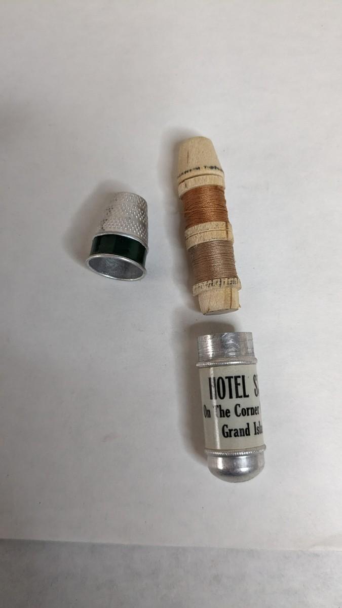 (10) thimbles, 2 of which are open top, a strange screw piece, and Hotel Stratton travelling piece. 4 are marked sterling and come in at 18.9g total weight. Also includes neat Butter-Nut promo, and 4 other stamped aluminum pieces.