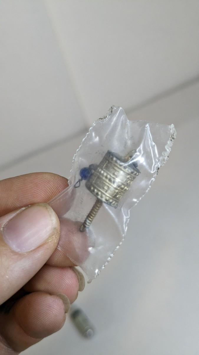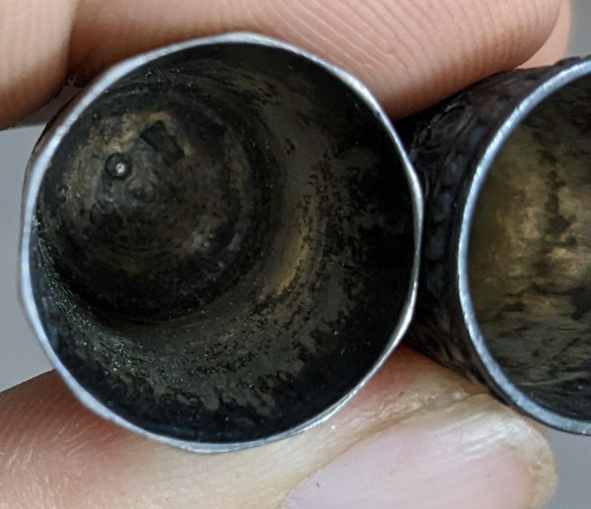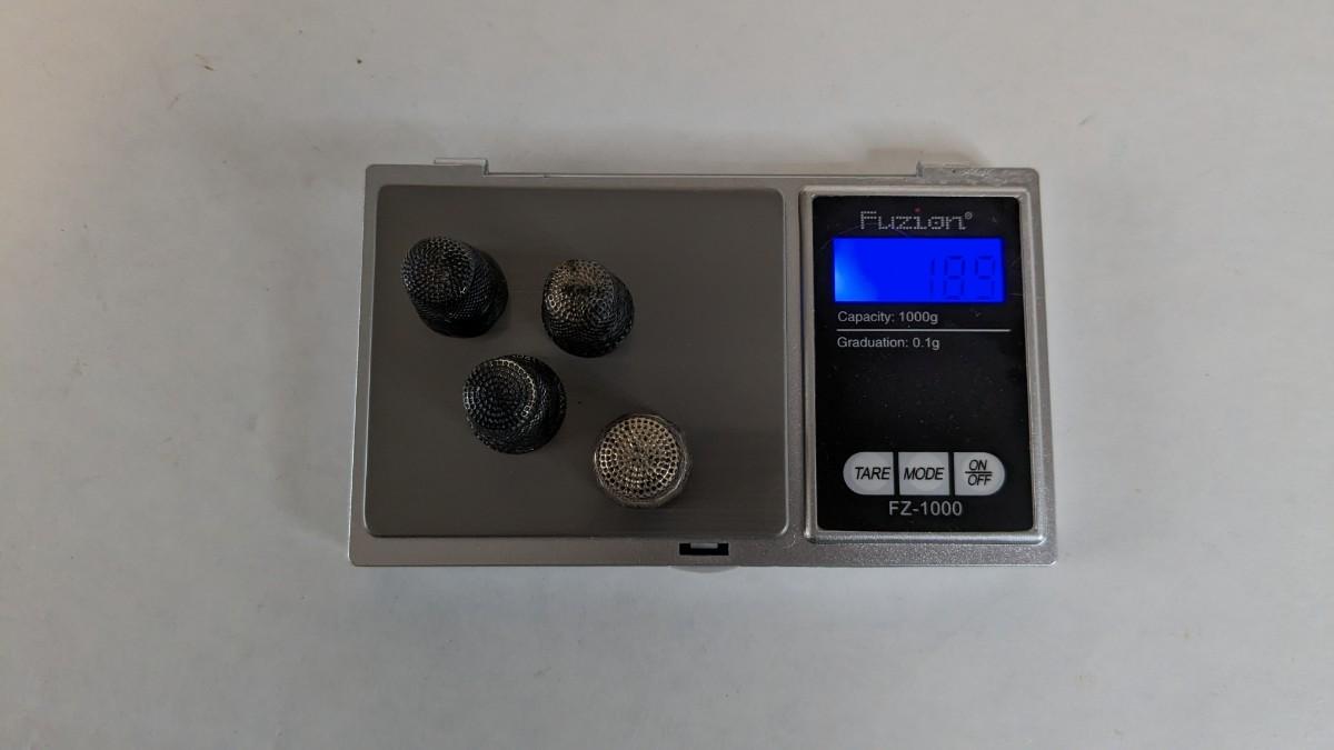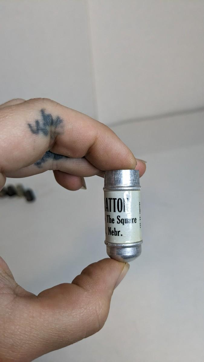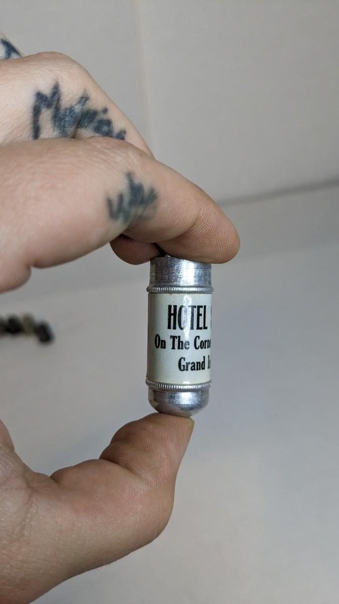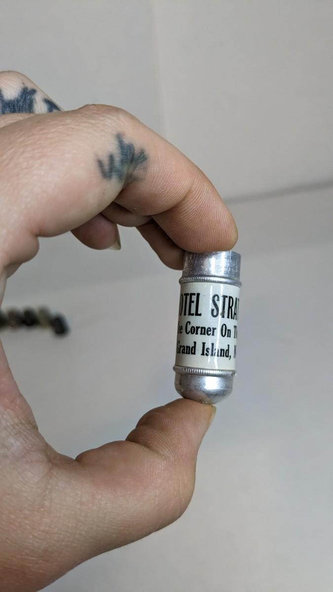 (10) thimbles, 2 of which are open top, a strange screw piece, and Hotel Stratton travelling piece. 4 are marked sterling and come in at 18.9g total weight. Also includes neat Butter-Nut promo, and 4 other stamped aluminum pieces.