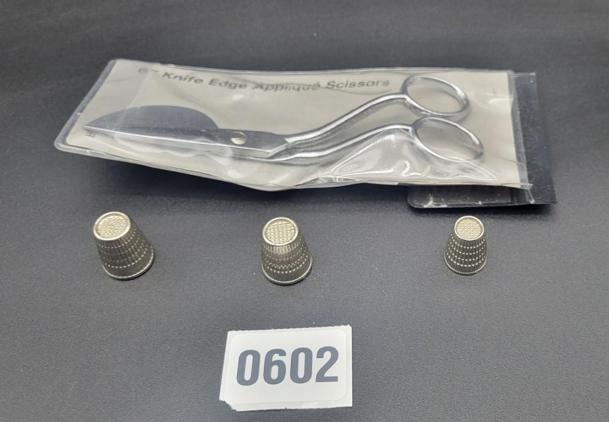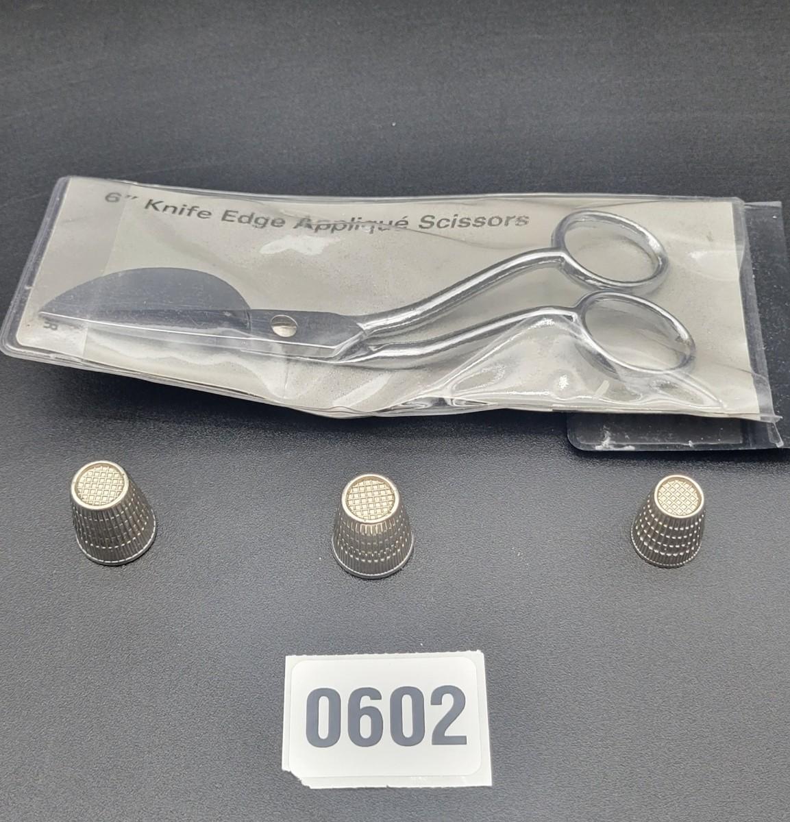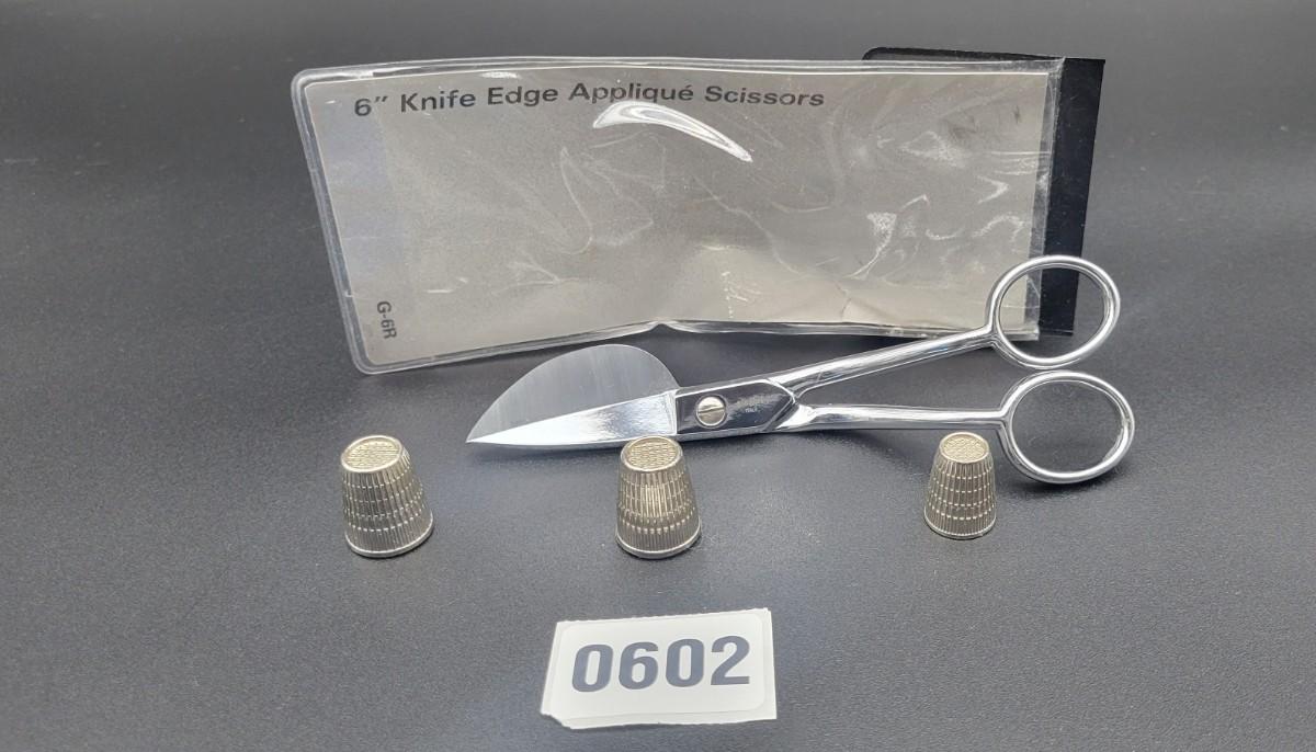 Three Thimbles and a 6" Knife Edge Applique Scissors in case