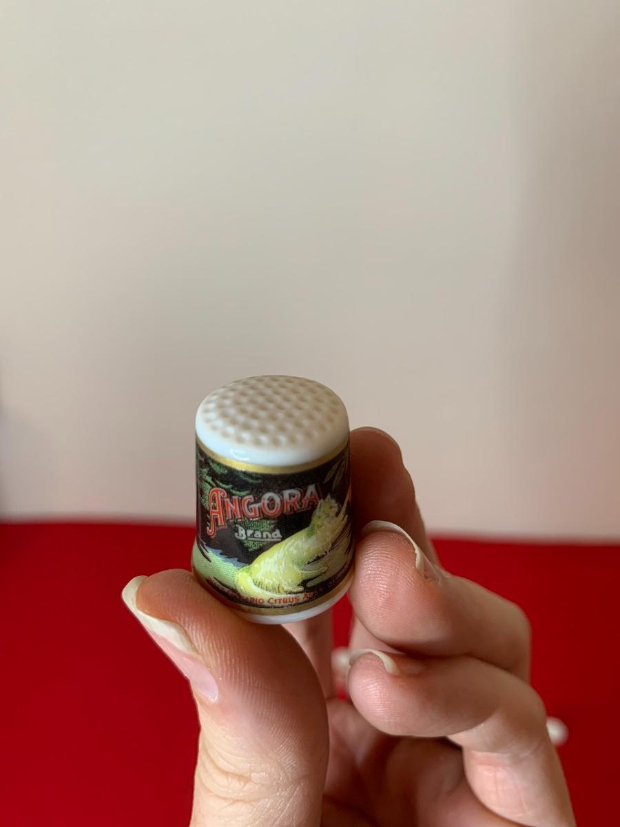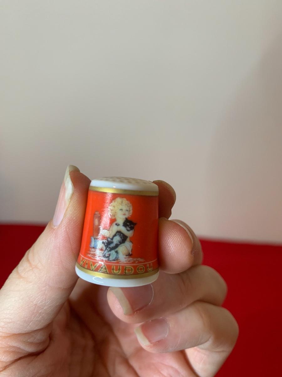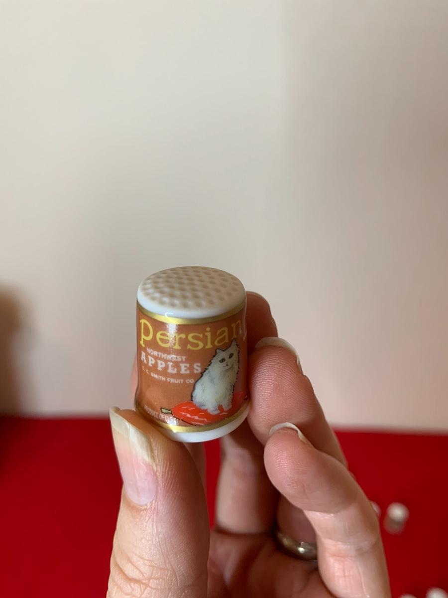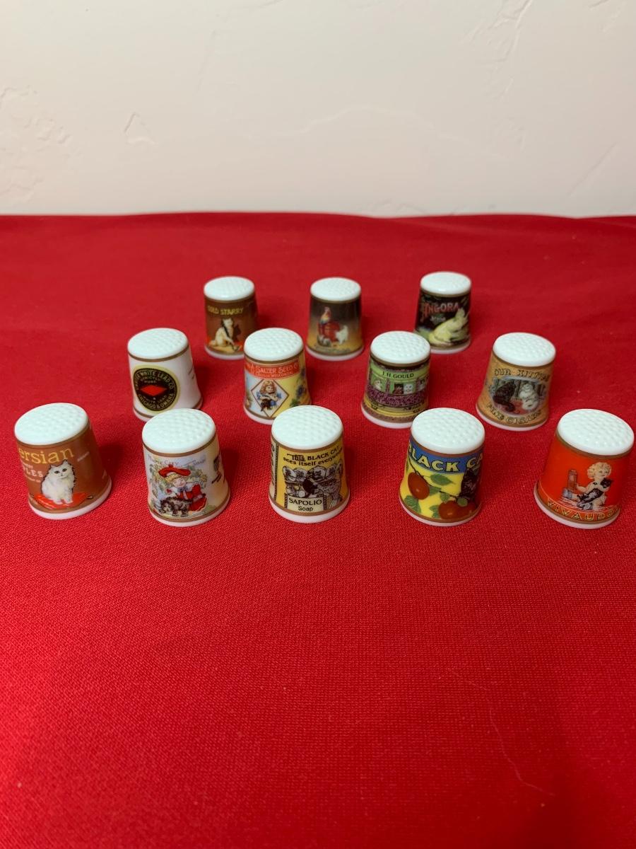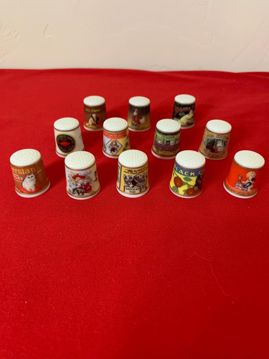 Super cute, repro cat advertising poster porcelain thimbles. NEW - Made in Japan. Total of 12 thimbles.