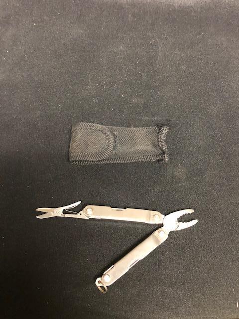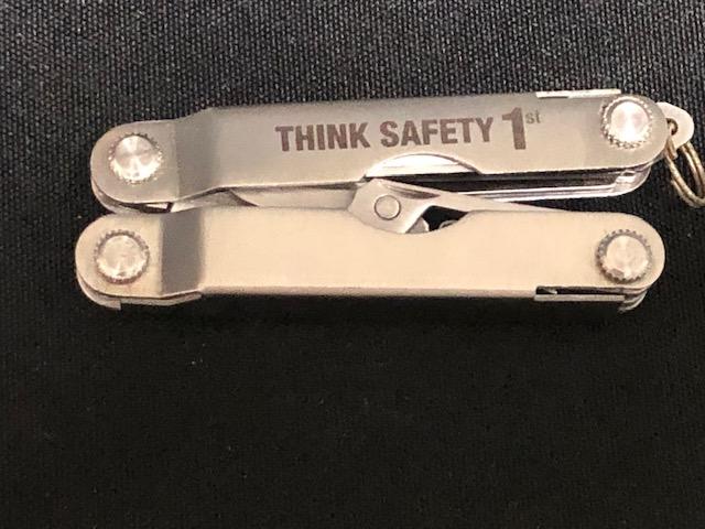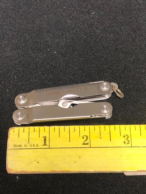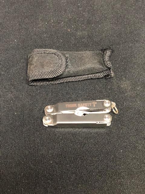 Pocket size multitool with case. "Think Safety 1st" is written on one side. Small, 2.5" in size.