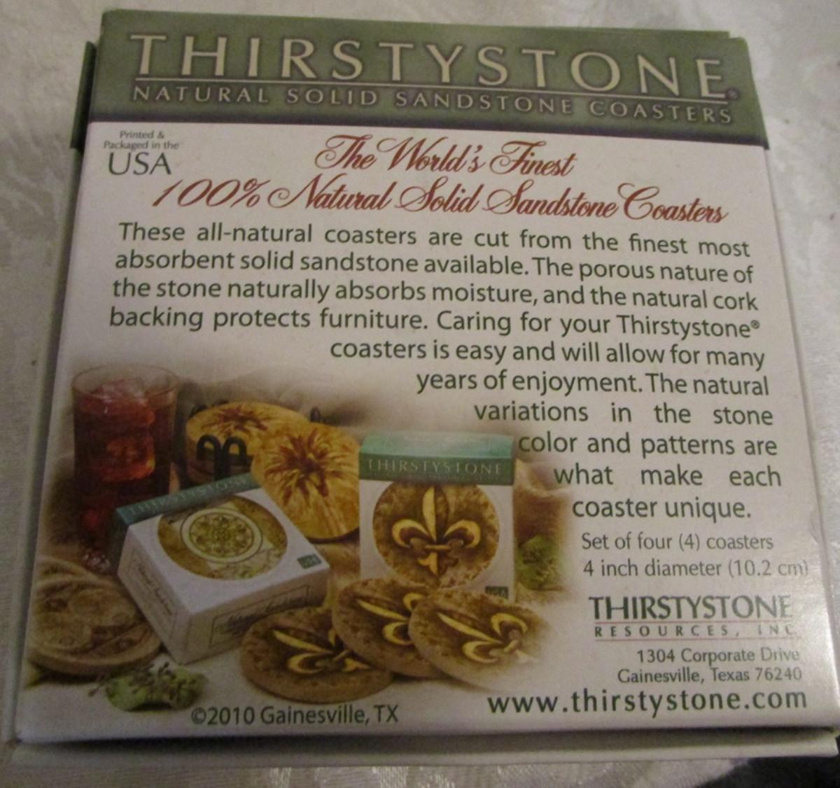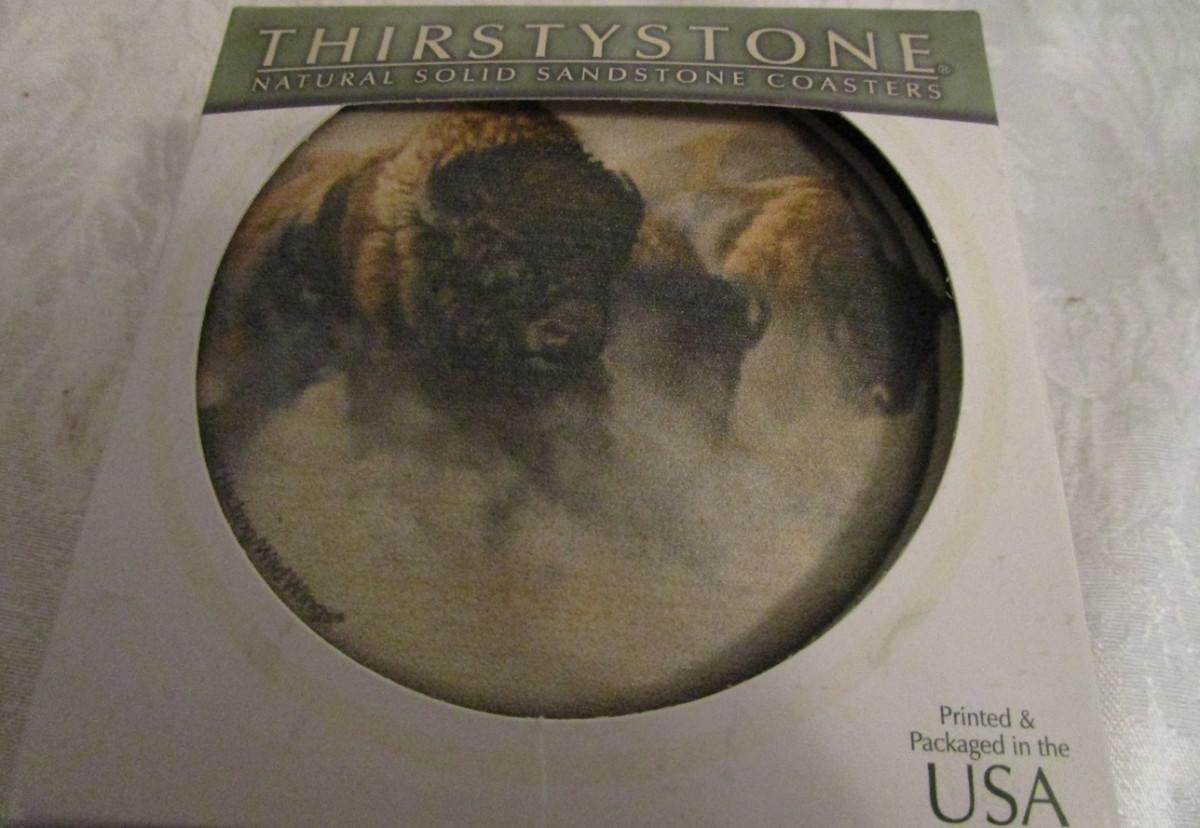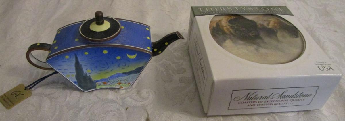 buffalo coasters natural solid sandstone; teapot Trade Plus Aid #cc444 (not to be used for food)