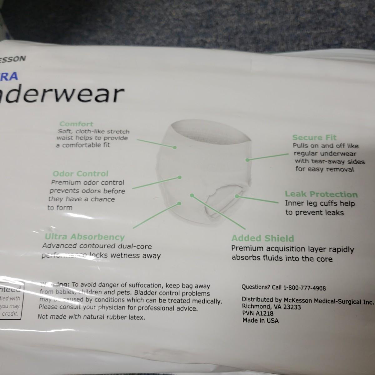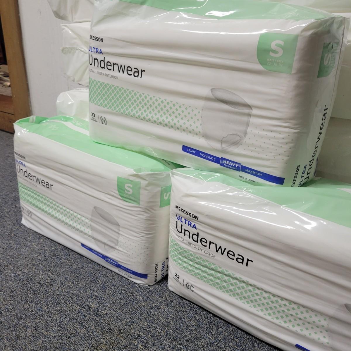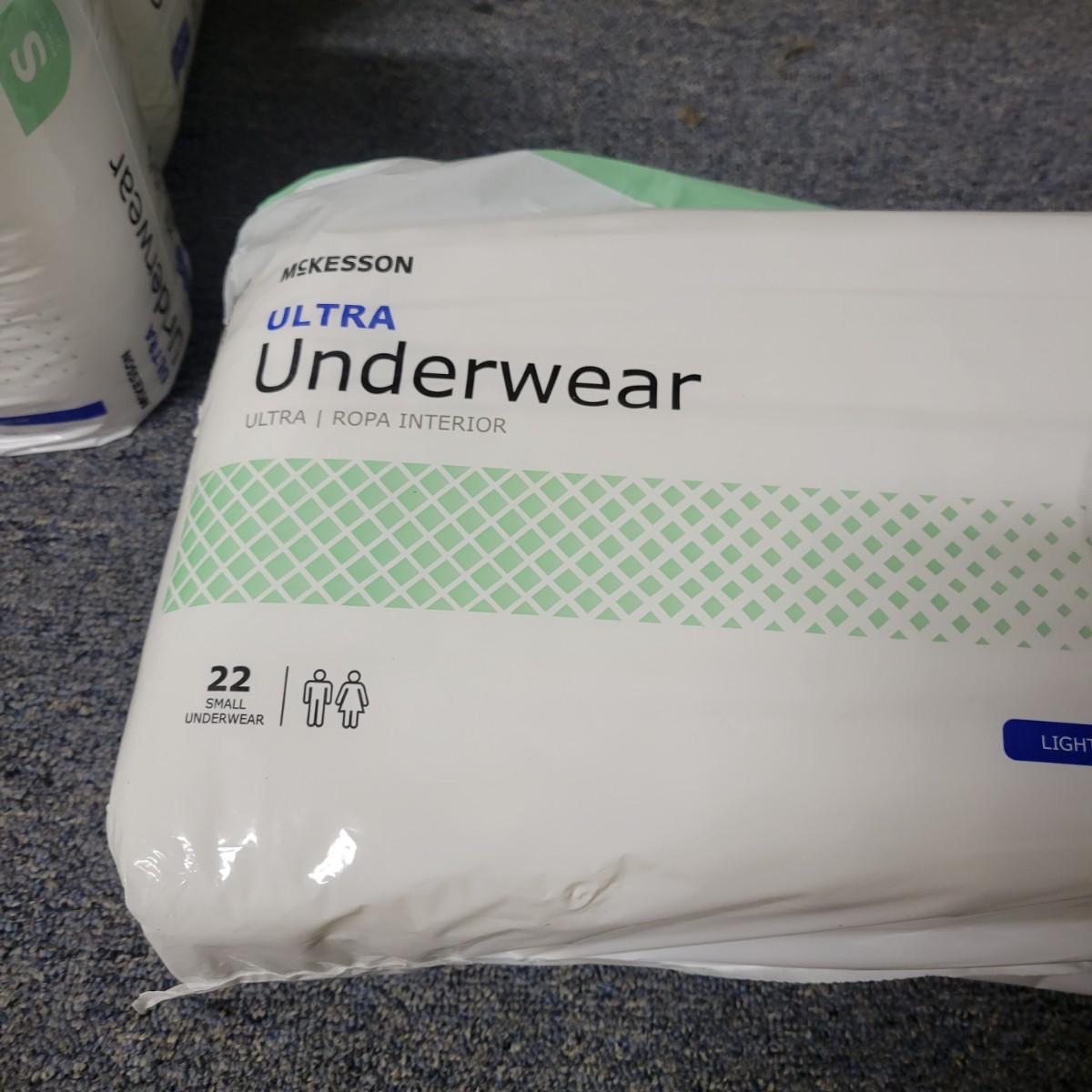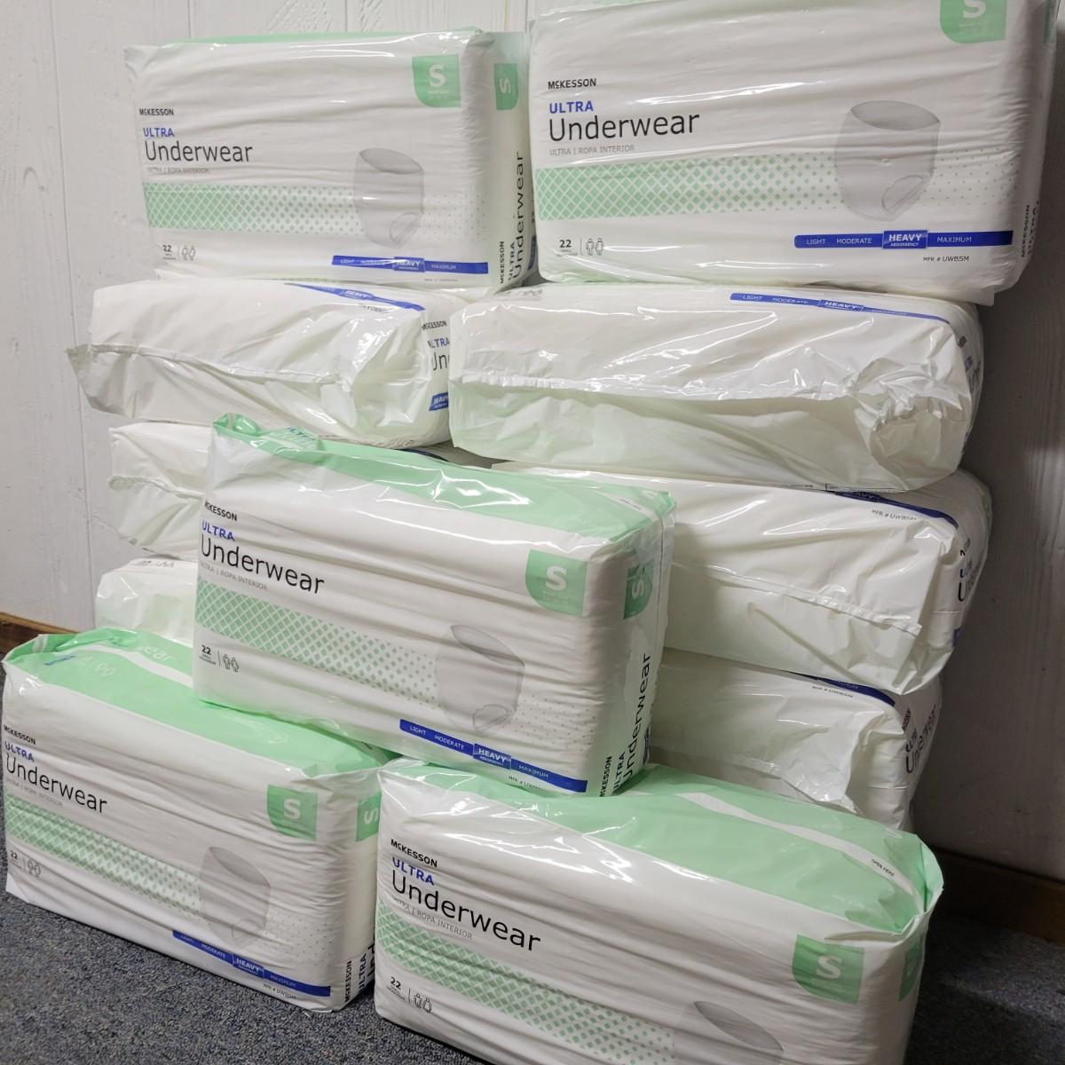 Thirteen new and unopened packages of McKesson ultra underwear. Each package contains 22 pairs. Heavy absorption and size small.