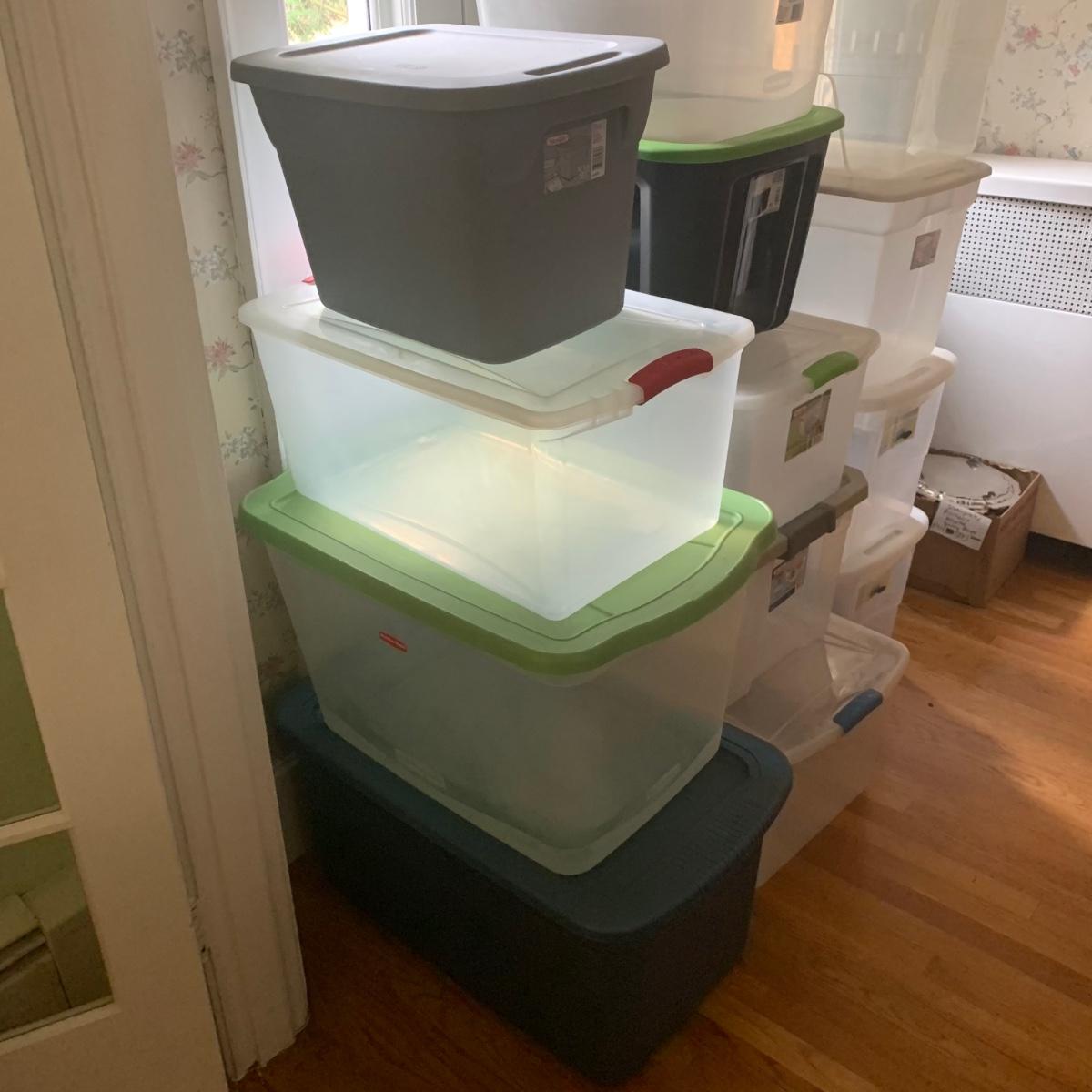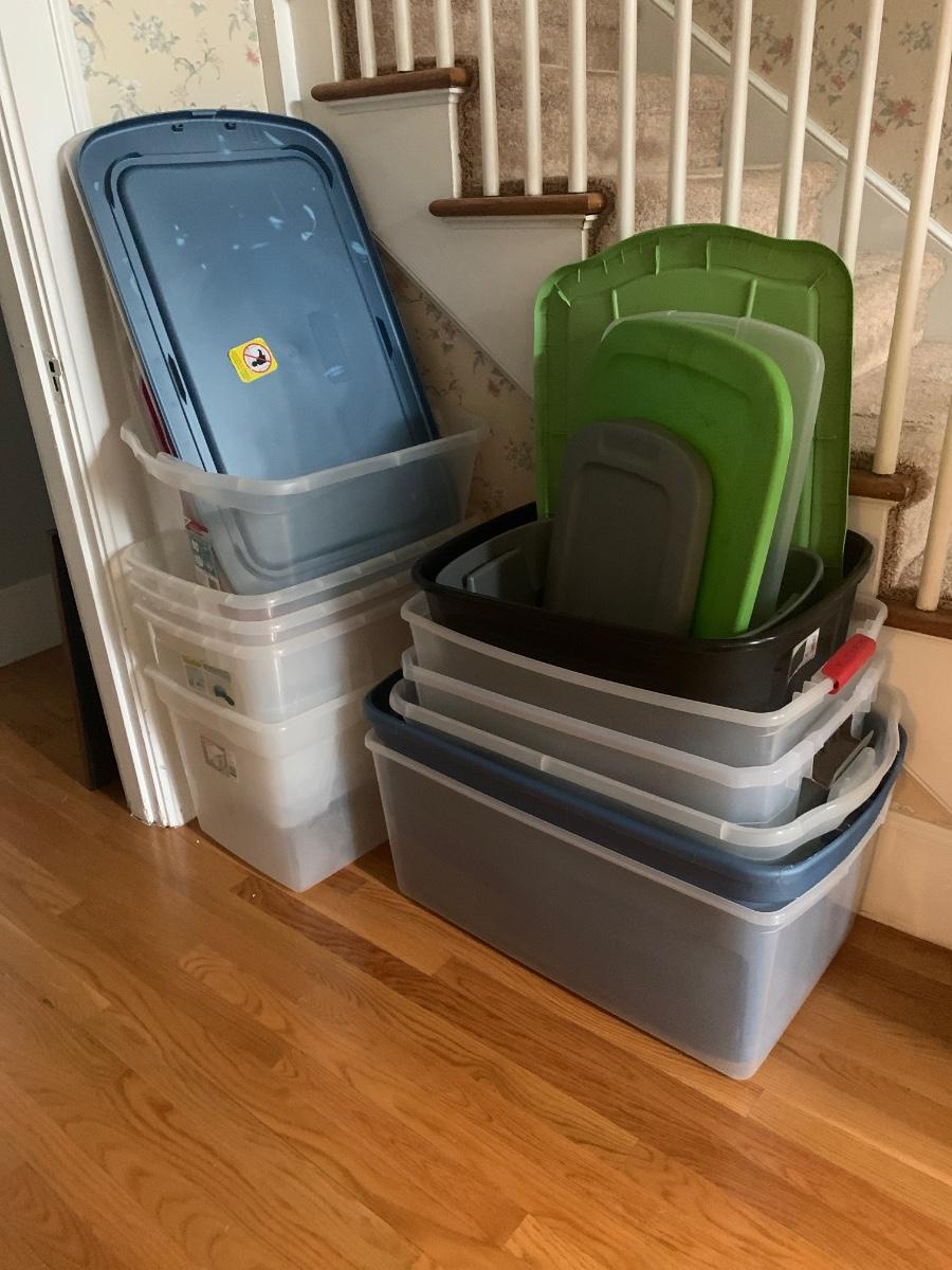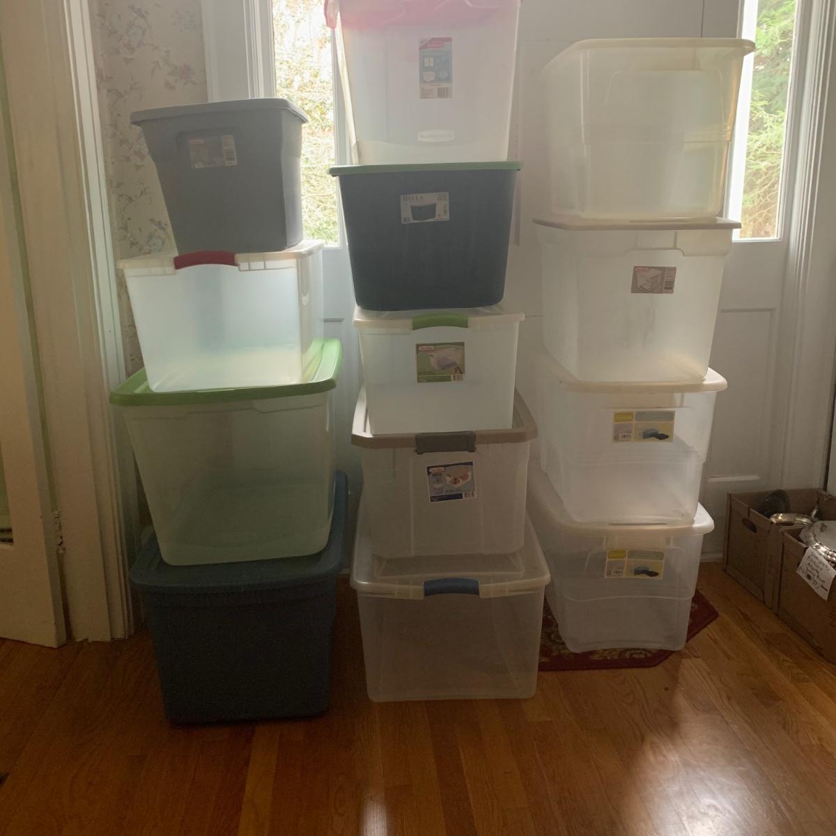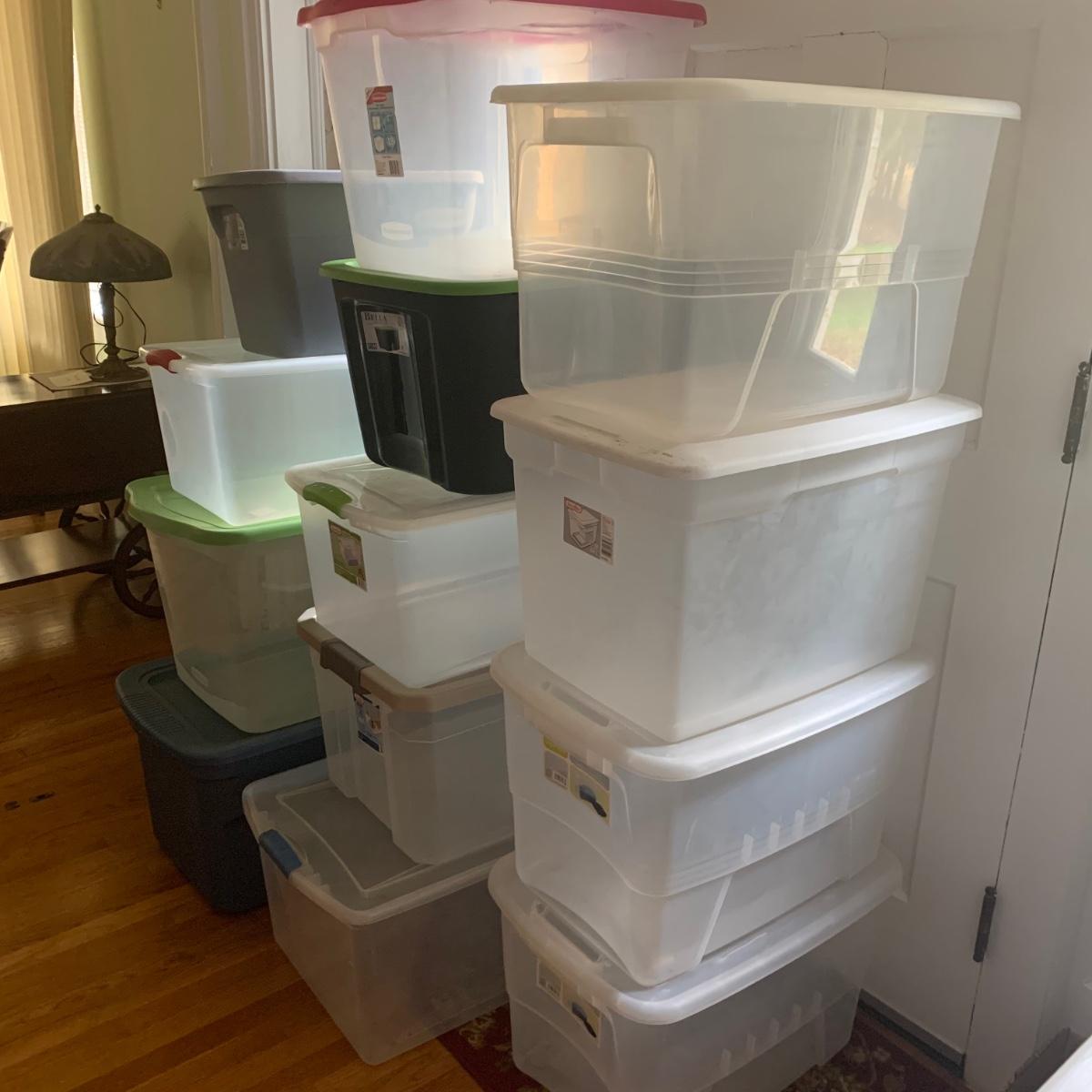 Lot includes 13 plastic storage bins with lids by Rubbermaid, Sterilite, Bella and Real Organized. Local pick up only.