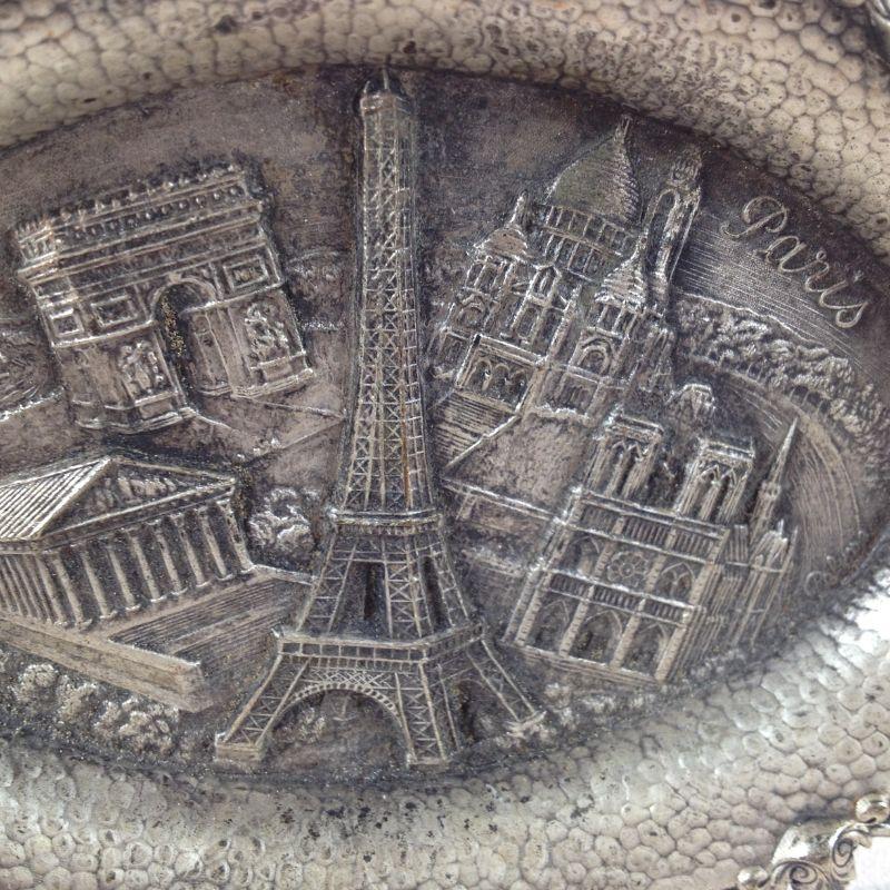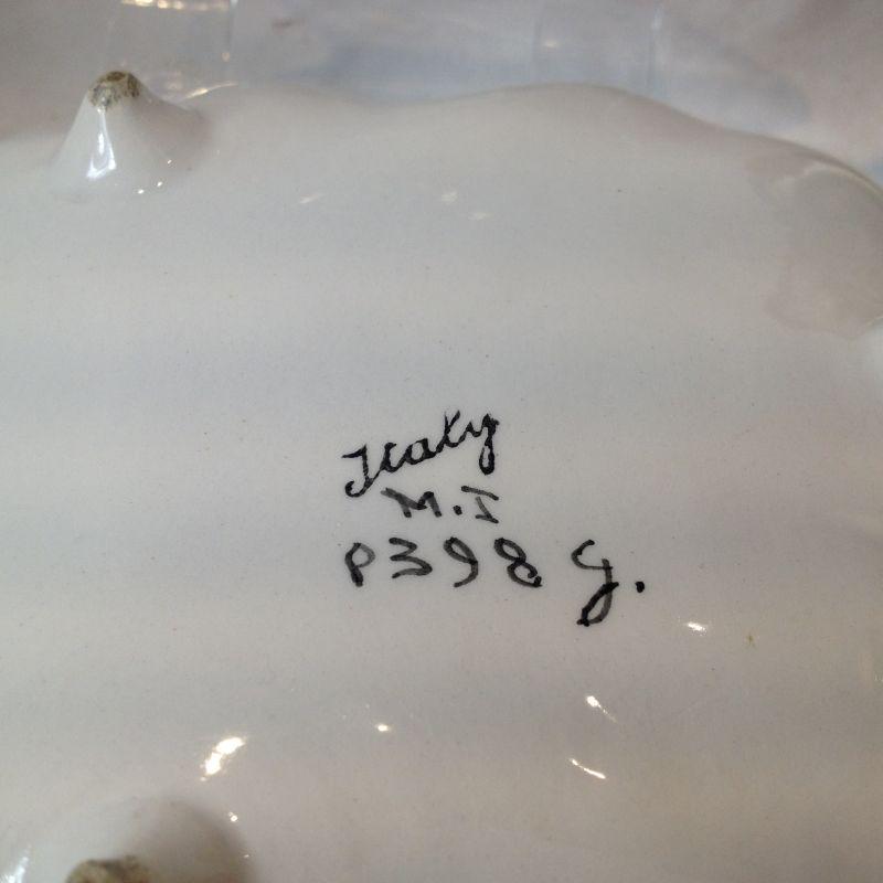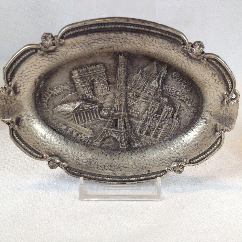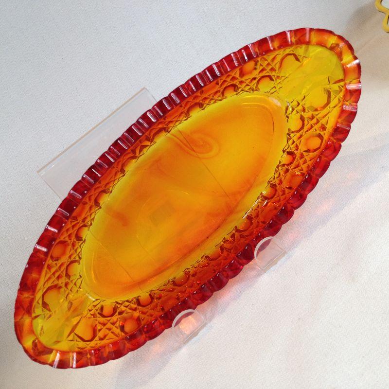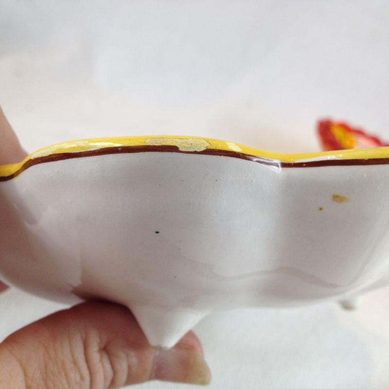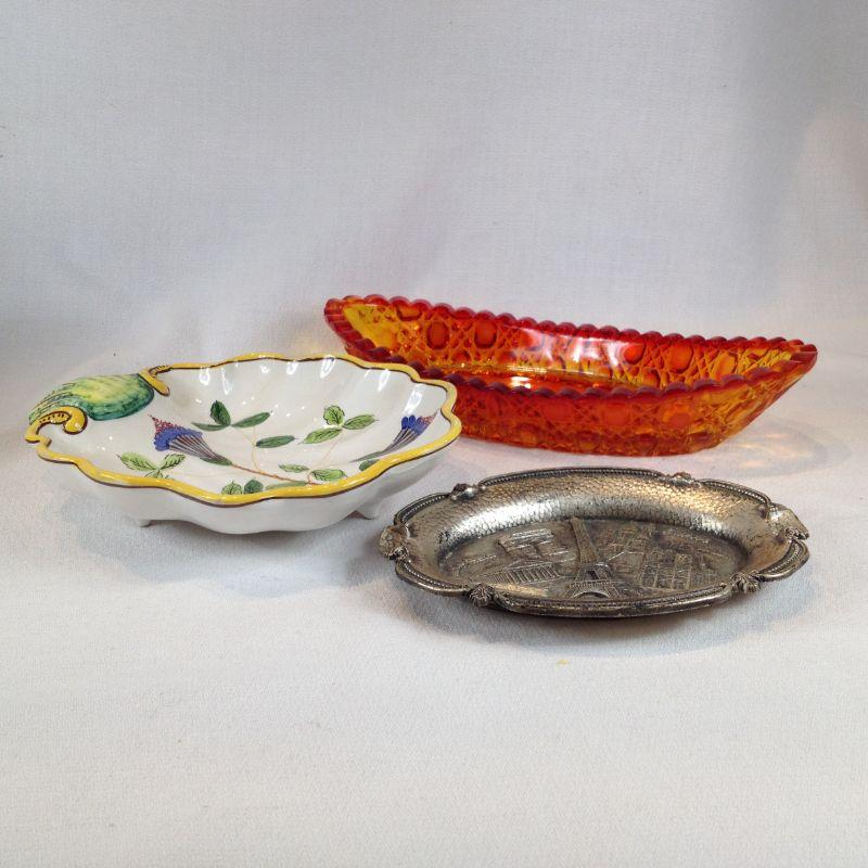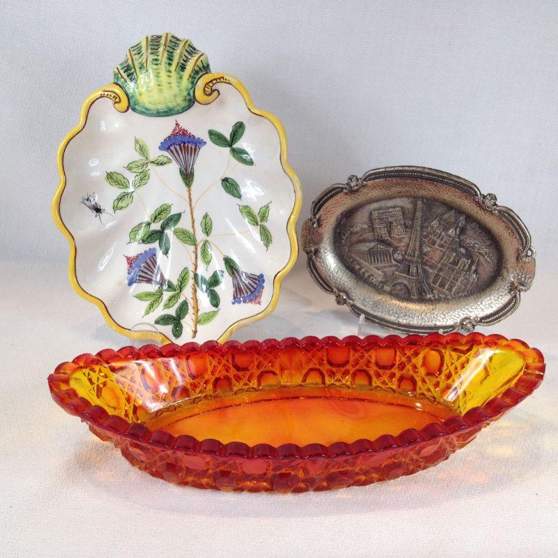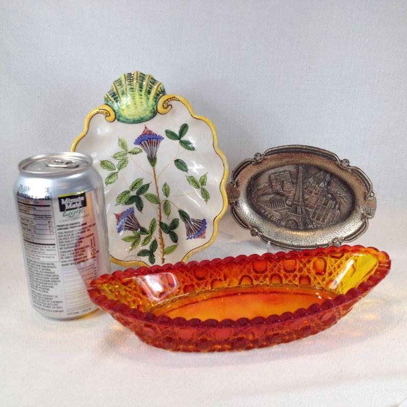 This odd duck grouping includes a hand-painted shell dish made in Italy, a metal "Paris" souvenir plate and a period pressed glass pickle bowl in a great orange color. The shell dish as a tiny chip on edge (see picture) and measures 7 3/4-inches long, the Paris piece measures 5 3/4-inches long and lastly the pickle dish measures 9-inches long X 4-inches wide - no chips or cracks.