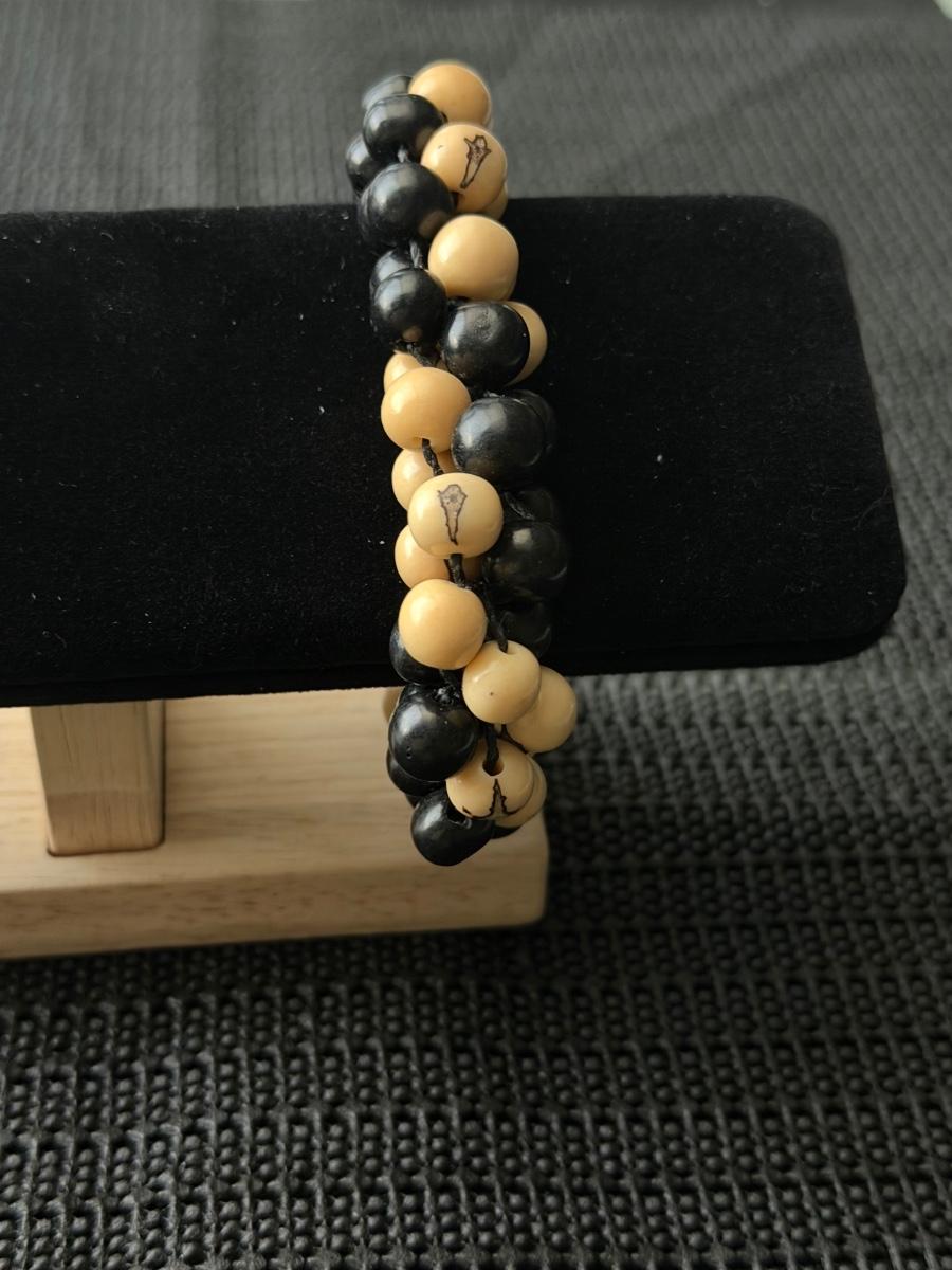 This is a handmade dual-strand beaded bracelet likely made of ebony wood and white sandalwood like beads.