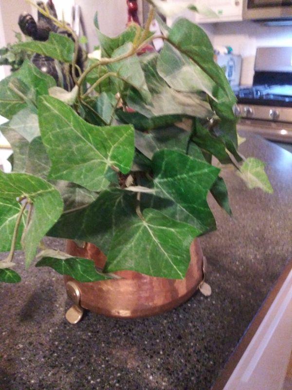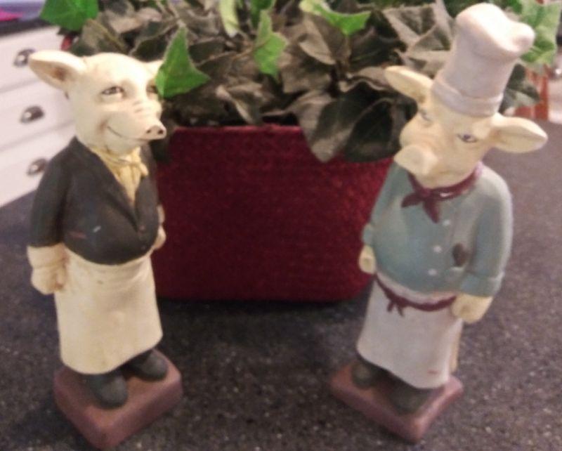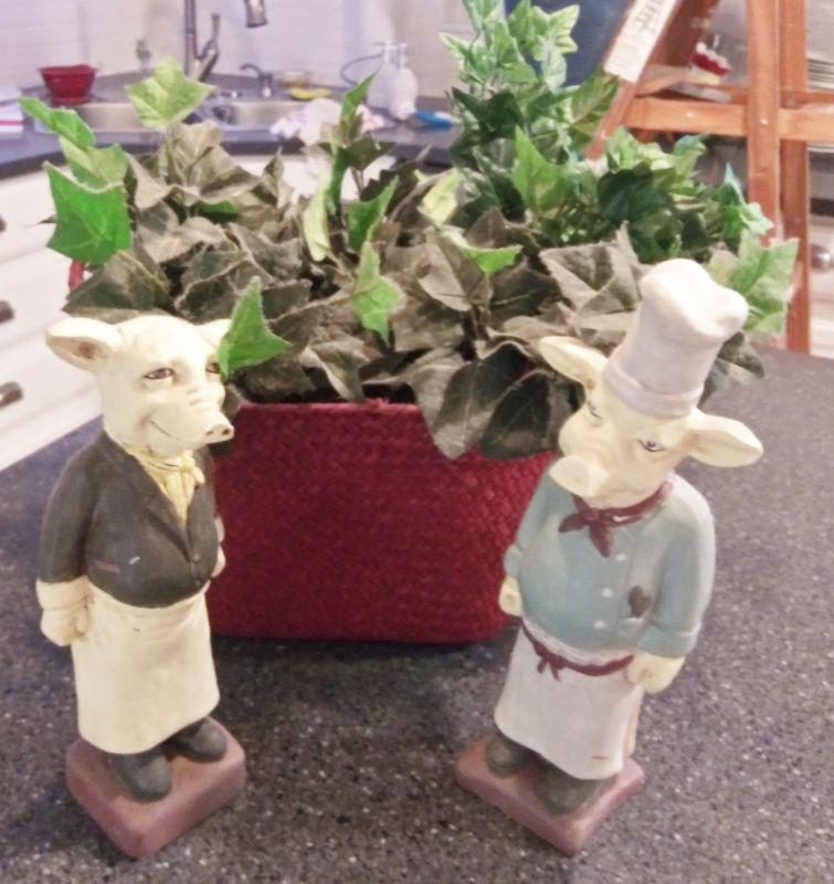 2 RESIN PIGS, FAUX PLANTS IN COPPER CONTAINER AND BASKET